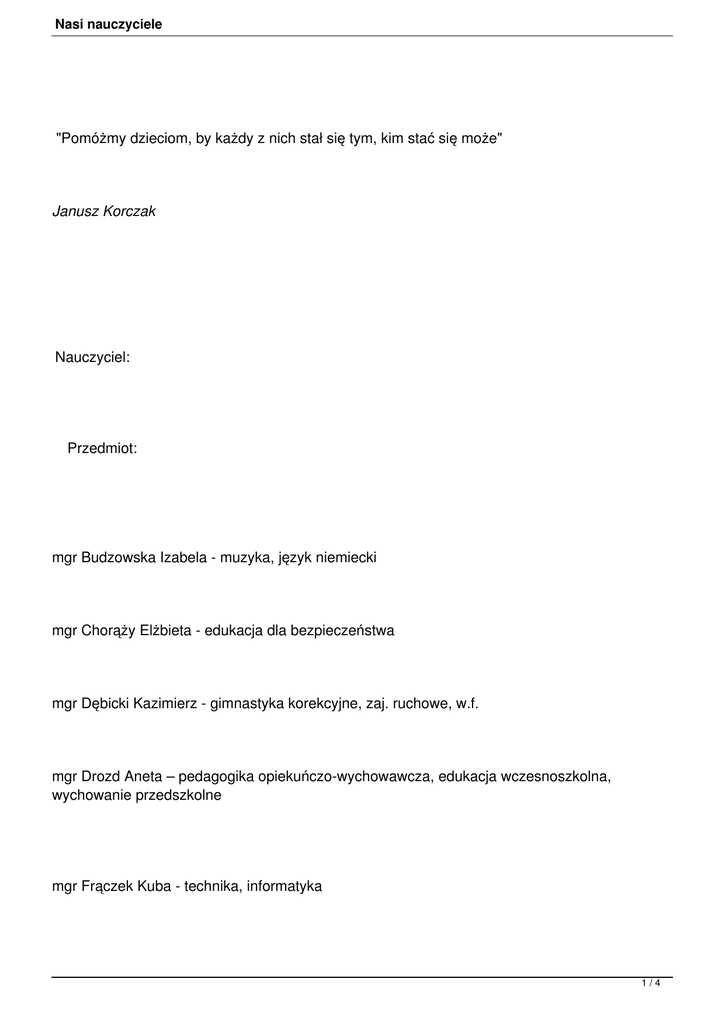 Nasi nauczyciele "Pomóżmy dzieciom, by każdy z nich stał się tym, kim stać się może" Janusz Korczak Nauczyciel: Przedmiot: mgr Budzowska Izabela - muzyka, język niemiecki mgr Chorąży Elżbieta - edukacja dla bezpieczeństwa mgr Dębicki Kazimierz - gimnastyka korekcyjne, zaj. ruchowe, w.f. mgr Drozd Aneta – pedagogika opiekuńczo-wychowawcza, edukacja wczesnoszkolna, wychowanie przedszkolne mgr Frączek Kuba - technika, informatyka 1/4 Nasi nauczyciele mgr Żelazny Mieczysław - religia mgr Garlacz Maria - historia, , wych. przedszkolne mgr Gębala Anna – pedagogika opiekuńczo-wychowawcza, oligofrenopedagogika, logopedia, surdopedagogika. mgr Głowacz Małgorzata - edukacja wczesnoszkolna i wychowanie przedszkolne mgr Góralczyk Anna - edukacja wczesnoszkolna, oligofrenopedagogika mgr Gunia Monika – edukacja wczesnoszkolna, edukacja przedszkolna, język angielski w przedszkolu i edukacji wczesnoszkolnej, informatyka, bibliotekoznawstwo mgr Hordziej Marek - edukacja wczesnoszkolna mgr Hordziej Teresa - bibliotekoznawstwo, plastyka mgr Kasprzyk Dorota - język polski, wychowanie przedszkolne mgr Konrad Kawaler - wych. fizyczne mgr Kubiś Jolanta - matematyka, chemia 2/4 Nasi nauczyciele mgr Łodziana Izabela – inf. naukowa i bibliotekoznawstwo, ped. opiekuńczo- wychowawcza, wy chowanie do życia w rodzinie mgr Małnowicz-Makowska Krystyna – zarządzanie oświatą,wychowanie przedszkolne, edukacja wczesnoszkolna, oligofrenopedagogika, wiedza o społeczeństwie,zajęcia korekcyjno-kompensacyjne, logopedia mgr Moskała Barbara - fizyka, matematyka mgr Niedźwiedź Iwona - język polski, wiedza o społeczeństwie mgr Pacułt Sylwia - język angielski mgr Pasternak Maria – edukacja wczesnoszkolna i wychowanie przedszkolne mgr Pawlikowski Damian - wych. fizyczne, zajęcia ruchowe, I klasa trenerska z piłki nożnej/ mgr Pływacz Katarzyna - matematyka, informatyka mgr Pocielej Małgorzata - zintegrowana edukacja wczesnoszkolna, oligofrenopedagogika i wychowanie przedszkolne mgr Prażnowska Małgorzata – matematyka, wychowanie fizyczne, zarządzanie oświatą 3/4 Nasi nauczyciele o. Synycja Beniamin Jerzy - katecheta mgr Stokłosa Mirosława – pedagogika opiekuńczo-wychowawcza mgr Tyrpa-Gawron Gabriela - język angielski mgr Turek Magdalena - biologia mgr Wieczorek Antoni – n-l oddelegowany do pracy w ZNP mgr Wiśniewska Aldona - język angielski mgr Wojewodzic Jacek - geografia z przyrodą 4/4