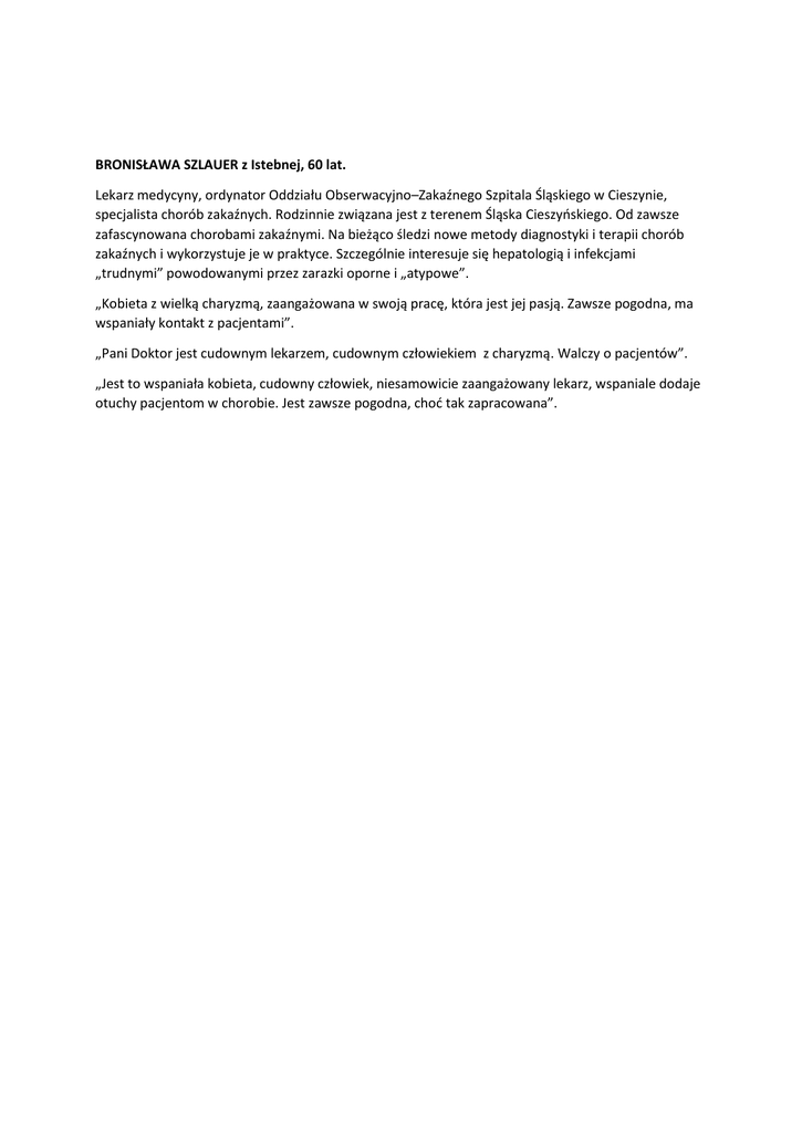 BRONISŁAWA SZLAUER z Istebnej, 60 lat. Lekarz medycyny, ordynator Oddziału Obserwacyjno–Zakaźnego Szpitala Śląskiego w Cieszynie, specjalista chorób zakaźnych. Rodzinnie związana jest z terenem Śląska Cieszyńskiego. Od zawsze zafascynowana chorobami zakaźnymi. Na bieżąco śledzi nowe metody diagnostyki i terapii chorób zakaźnych i wykorzystuje je w praktyce. Szczególnie interesuje się hepatologią i infekcjami „trudnymi” powodowanymi przez zarazki oporne i „atypowe”. „Kobieta z wielką charyzmą, zaangażowana w swoją pracę, która jest jej pasją. Zawsze pogodna, ma wspaniały kontakt z pacjentami”. „Pani Doktor jest cudownym lekarzem, cudownym człowiekiem z charyzmą. Walczy o pacjentów”. „Jest to wspaniała kobieta, cudowny człowiek, niesamowicie zaangażowany lekarz, wspaniale dodaje otuchy pacjentom w chorobie. Jest zawsze pogodna, choć tak zapracowana”.