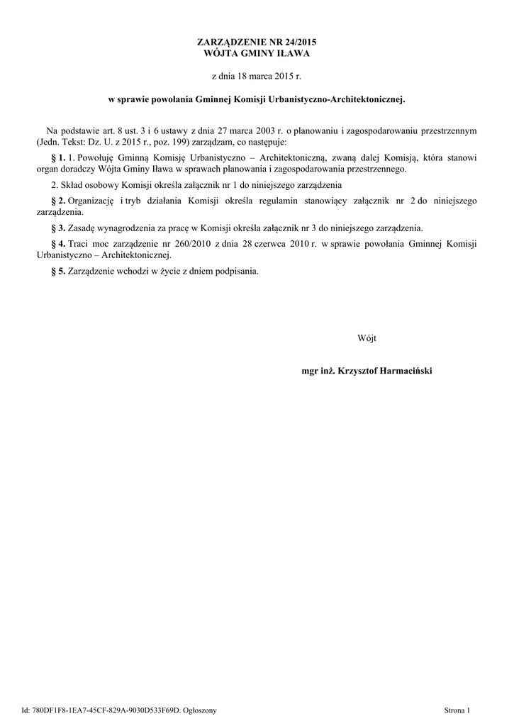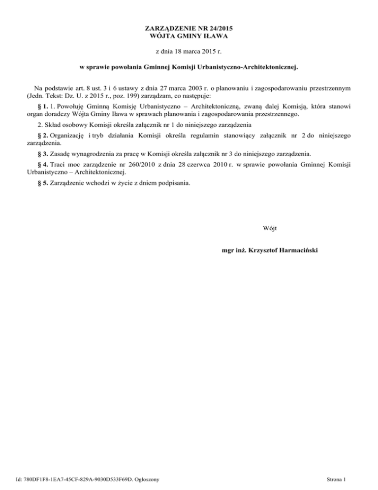 ZARZĄDZENIE NR 24/2015 WÓJTA GMINY IŁAWA z dnia 18 marca 2015 r. w sprawie powołania Gminnej Komisji Urbanistyczno-Architektonicznej. Na podstawie art. 8 ust. 3 i 6 ustawy z dnia 27 marca 2003 r. o planowaniu i zagospodarowaniu przestrzennym (Jedn. Tekst: Dz. U. z 2015 r., poz. 199) zarządzam, co następuje: § 1. 1. Powołuję Gminną Komisję Urbanistyczno – Architektoniczną, zwaną dalej Komisją, która stanowi organ doradczy Wójta Gminy Iława w sprawach planowania i zagospodarowania przestrzennego. 2. Skład osobowy Komisji określa załącznik nr 1 do niniejszego zarządzenia § 2. Organizację i tryb działania Komisji określa regulamin stanowiący załącznik nr 2 do niniejszego zarządzenia. § 3. Zasadę wynagrodzenia za pracę w Komisji określa załącznik nr 3 do niniejszego zarządzenia. § 4. Traci moc zarządzenie nr 260/2010 z dnia 28 czerwca 2010 r. w sprawie powołania Gminnej Komisji Urbanistyczno – Architektonicznej. § 5. Zarządzenie wchodzi w życie z dniem podpisania. Wójt mgr inż. Krzysztof Harmaciński Id: 780DF1F8-1EA7-45CF-829A-9030D533F69D. Ogłoszony Strona 1 Załącznik Nr 1 do Zarządzenia Nr 24/2015 Wójta Gminy Iława z dnia 18 marca 2015 r. Skład osobowy Gminnej Komisji Urbanistyczno-Architektonicznej Skład osobowy Gminnej Komisji Urbanistyczno-Architektonicznej: 1. Maciej Wronka – Przewodniczący Komisji. 2. Michał Romański – Wiceprzewodniczący Komisji. 3. Tomasz Konarski – Członek Komisji. Id: 780DF1F8-1EA7-45CF-829A-9030D533F69D. Ogłoszony Strona 1 Załącznik Nr 2 do Zarządzenia Nr 24/2015 Wójta Gminy Iława z dnia 18 marca 2015 r. REGULAMIN PRACY Gminnej Komisji Urbanistyczno-Architektonicznej w Iławie § 1. 1. Gminna Komisja Urbanistyczno-Architektoniczna, zwana dalej „Komisją”, w myśl art. 8 ust. 3 ustawy z dnia 27 marca 2003 r. o planowaniu i zagospodarowaniu przestrzennym (tekst jednolity: Dz. U. z 2015 r. poz. 199) jest organem doradczym Wójta Gminy Iława, w sprawach planowania i zagospodarowania przestrzennego. 2. Komisja może pełnić funkcję organu doradczego wójta/burmistrza innej gminy na mocy porozumienia zawartego przez Wójta Gminy Iława z odpowiednim wójtem/burmistrzem. 3. Komisja powołana jest do: 1) opiniowania projektów studiów uwarunkowań i kierunków zagospodarowania przestrzennego oraz składania wniosków do tych opracowań, 2) opiniowania projektów miejscowych planów zagospodarowania przestrzennego oraz składania wniosków do tych opracowań, 3) opiniowania analiz zmian w zagospodarowaniu przestrzennym gminy, ocen postępów w opracowaniu planów miejscowych i wieloletnich programów sporządzania planów w nawiązaniu do ustaleń studium z uwzględnieniem decyzji zamieszczonych w rejestrach, o których mowa w art. 57 ust. 1−3 i art. 67 ustawy o planowaniu i zagospodarowaniu przestrzennym, 4) opiniowania wniosków w sprawie sporządzenia lub zmiany planów miejscowych oraz studiów uwarunkowań i kierunków zagospodarowania przestrzennego. § 2. 1. W skład Komisji wchodzą osoby o przygotowaniu fachowym związanym bezpośrednio z teorią i praktyką planowania przestrzennego. 2. Wójt Gminy Iława powołuje i odwołuje członków Komisji oraz wyznacza Przewodniczącego Komisji. 3. Odwołanie członka Komisji może nastąpić na wniosek zainteresowanego, a także w przypadku uchylania się od uczestnictwa w pracach Komisji. 4. Przewodniczący i Wiceprzewodniczący Komisji odpowiadają za formułowanie ustaleń z posiedzeń Komisji oraz reprezentują ją na zewnątrz. 5. Przewodniczący Komisji sprawuje nadzór nad obsługą techniczną prac Komisji, w tym sporządzaniem protokołów z posiedzeń. 6. Komisja rozpatruje sprawy zgłaszane przez Wójta Gminy Iława do zaopiniowania. § 3. 1. Udział w posiedzeniach Komisji jest odpłatny, a wynagrodzenie za wyrażenie opinii określa załącznik nr 3 do niniejszego Zarządzenia. 2. Członkowi Komisji będącemu jednocześnie członkiem zespołu autorskiego rozpatrywanego opracowania, nie przysługuje wynagrodzenie za udział w posiedzeniu Komisji. § 4. 1. Na posiedzenia Komisji mogą być zapraszani przedstawiciele właściwych samorządów terytorialnych, pracownicy Urzędu Gminy w Iławie, Urzędów Gmin z którymi zawarto stosowne porozumienie oraz innych organów i instytucji. 2. W posiedzeniach Komisji mogą brać udział autorzy opracowań rozpatrywanych na tych posiedzeniach. § 5. 1. Tematykę i terminy posiedzeń – uwzględniając zgłoszone potrzeby oraz listę osób zaproszonych do uczestnictwa w posiedzeniu Komisji ustala Przewodniczący Komisji, informując o tym Wójta Gminy Iława. 2. W przypadku nieobecności Przewodniczącego Komisji jego zadania wykonuje Wiceprzewodniczący Komisji. Id: 780DF1F8-1EA7-45CF-829A-9030D533F69D. Ogłoszony Strona 1 3. Zawiadomienie członków Komisji o terminie mającego się odbyć posiedzenia oraz zaproszenia innych osób przewidzianych do udziału w posiedzeniach Komisji należy przeprowadzić co najmniej 7 dni przed terminem posiedzenia. 4. Obsługę techniczną Komisji zapewnia Urząd Gminy w Iławie. § 6. 1. Przewodniczący Komisji, w porozumieniu z Wójtem Gminy Iława, proponuje w razie potrzeby sporządzenie opinii lub ekspertyzy dotyczącej zgłoszonych do rozpatrywania opracowań planistycznych. 2. Opracowanie opinii lub ekspertyzy powierza się specjaliście wybranemu wśród członków Komisji lub spoza Komisji. Umowę na opracowanie zawiera Wójt Gminy Iława. 3. Opracowane na piśmie opinie i ekspertyzy powinny być przedłożone Wójtowi Gminy Iława najpóźniej na 5 dni przed terminem posiedzenia Komisji. 4. Opinie i ekspertyzy powinny zawierać w szczególności analizę rozwiązań przyjętych w zgłoszonych do rozpatrzenia opracowaniach planistycznych z odniesieniem do obowiązujących przepisów prawa. § 7. 1. Przewidziane do rozpatrzenia przez Komisję opracowania wraz z ekspertyzą lub opinią powinny być udostępnione do wglądu członkom Komisji, co 