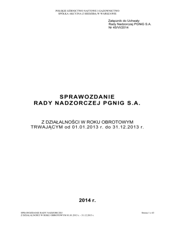 POLSKIE GÓRNICTWO NAFTOWE I GAZOWNICTWO SPÓŁKA AKCYJNA Z SIEDZIBĄ W WARSZAWIE Załącznik do Uchwały Rady Nadzorczej PGNiG S.A. Nr 45/VI/2014 SPRAWO ZDAN IE RAD Y NADZ ORCZ EJ PGN IG S.A. Z DZIAŁALNOŚCI W ROKU OBROTOWYM TRWAJĄCYM od 01.01.2013 r. do 31.12.2013 r. 2014 r. SPRAWOZDANIE RADY NADZORCZEJ Z DZIAŁALNOŚCI W ROKU OBROTOWYM 01.01.2013 r. - 31.12.2013 r. Strona 1 z 43 POLSKIE GÓRNICTWO NAFTOWE I GAZOWNICTWO SPÓŁKA AKCYJNA Z SIEDZIBĄ W WARSZAWIE I. Kadencja Rady Nadzorczej Na podstawie § 35 ust. 2 Statutu PGNiG S.A. członkowie Rady Nadzorczej powoływani są na wspólną kadencję. Na dzień sporządzenia Sprawozdania Rada Nadzorcza składa się z 8 osób, powołanych na wspólną kadencję upływającą z dniem 1 maja 2014 r. : 1. Wojciech Chmielewski – Przewodniczący Rady Nadzorczej, 2. Marcin Moryń – Wiceprzewodniczący Rady Nadzorczej, 3. Mieczysław Kawecki – Sekretarz Rady Nadzorczej, 4. Agnieszka Chmielarz – Członek Rady Nadzorczej, 5. Józef Głowacki – Członek Rady Nadzorczej, 6. Janusz Pilitowski – Członek Rady Nadzorczej, 7. Ewa Sibrecht – Ośka – Członek Rady Nadzorczej, 8. Jolanta Siergiej – Członek Rady Nadzorczej. II. 1. Skład Rady Nadzorczej Skład Rady Nadzorczej od dnia 01.01.2013 r. do dnia sporządzenia niniejszego sprawozdania przedstawiał się w następujący sposób: Stan na dzień 01.01.2013 r.: 1. Wojciech Chmielewski – Przewodniczący Rady Nadzorczej, 2. Marcin Moryń – Wiceprzewodniczący Rady Nadzorczej, 3. Mieczysław Kawecki – sekretarz Rady Nadzorczej, 4. Agnieszka Chmielarz – członek Rady Nadzorczej, 5. Józef Głowacki – członek Rady Nadzorczej, 6. Janusz Pilitowski – członek Rady Nadzorczej, 7. Mieczysław Puławski – członek Rady Nadzorczej, 8. Ewa Sibrecht-Ośka – członek Rady Nadzorczej, 9. Jolanta Siergiej – członek Rady Nadzorczej. Stan na dzień 31.12.2013 r.: 1. Wojciech Chmielewski – Przewodniczący Rady Nadzorczej, 2. Marcin Moryń – Wiceprzewodniczący Rady Nadzorczej, 3. Mieczysław Kawecki – sekretarz Rady Nadzorczej, SPRAWOZDANIE RADY NADZORCZEJ Z DZIAŁALNOŚCI W ROKU OBROTOWYM 01.01.2013 r. - 31.12.2013 r. Strona 2 z 43 POLSKIE GÓRNICTWO NAFTOWE I GAZOWNICTWO SPÓŁKA AKCYJNA Z SIEDZIBĄ W WARSZAWIE 4. Agnieszka Chmielarz – członek Rady Nadzorczej, 5. Józef Głowacki – członek Rady Nadzorczej, 6. Janusz Pilitowski – członek Rady Nadzorczej, 7. Ewa Sibrecht-Ośka – członek Rady Nadzorczej, 8. Jolanta Siergiej – członek Rady Nadzorczej. 2. Zmiany w składzie Rady Nadzorczej w 2013 r. W dniu 26 czerwca 2013 r. Nadzwyczajne Walne Zgromadzenie uchwałą nr 7/VI/2013 odwołało Pana Mieczysława Puławskiego ze składu Rady Nadzorczej oraz uchwałą nr 8/VI/2013 powołało w skład Rady Nadzorczej Pana Zbigniewa Skrzypkiewicza. W dniu 16 września 2013 r. Rada Nadzorcza Uchwałą Nr 139/VI/2013 postanowiła delegować Pana Zbigniewa Skrzypkiewicza do czasowego wykonywania czynności Członka Zarządu PGNiG S.A. ds. Korporacyjnych, począwszy od dnia 16 września 2013 r. do dnia 16 grudnia 2013. W dniu 30 grudnia Pan Zbigniew Skrzypkiewicz złożył rezygnację z członkostwa w Radzie Nadzorczej PGNIG S.A. 3. Zmiany w Prezydium Rady Nadzorczej W 2013 roku Rada Nadzorcza nie dokonywała zmian w składzie Prezydium. III. 1. Statystyka prac Rady Nadzorczej w 2013 roku Rada Nadzorcza odbyła w 2013 roku 22 posiedzenia i podjęła 204 uchwały, w tym 23 uchwały zostało przyjętych w trybie obiegowym przewidzianym w § 44 ust. 4 Statutu Spółki. 2. Liczba i częstotliwość odbytych posiedzeń oraz liczba podjętych uchwał w poszczególnych miesiącach przedstawia się następująco: SPRAWOZDANIE RADY NADZORCZEJ Z DZIAŁALNOŚCI W ROKU OBROTOWYM 01.01.2013 r. - 31.12.2013 r. Strona 3 z 43 POLSKIE GÓRNICTWO NAFTOWE I GAZOWNICTWO SPÓŁKA AKCYJNA Z SIEDZIBĄ W WARSZAWIE L.p. Miesiąc i liczba odbytych posiedzeń Data odbytych posiedzeń Liczba podjętych uchwał 22.01.2013 r. 15 23.01.2013 r. Uchwała 16/VI/2013 została podjęta w trybie obiegowym 1. styczeń (2) 23.01.2013 r. Uchwała 17/VI/2013 została podjęta w trybie obiegowym 23.01.2013 r. Uchwała 18/VI/2013 została podjęta w trybie obiegowym 25.01.2013 r. Uchwała 19/VI/2013 została podjęta w trybie obiegowym 2. luty (1) 29.01.2013 r. 5 25 – 27.02.2013 r. 14 14.03.2013 r. Uchwała 39/VI/2013 została podjęta w trybie obiegowym 3. marzec (2) 18.03.2013 r. 5 20.03.2013 r. Uchwała 45/VI/2013 została podjęta w trybie obiegowym 27.03.2013 r. 17 28.03.2013 r. Uchwała 63/VI/2013 została podjęta w trybie obiegowym 28.03.2013 r. Uchwała 64/VI/2013 została podjęta w trybie obiegowym 4. kwiecień (4) 02.04.2013 r. 2 04.04.2013 r. 1 24.04.2013 r. 7 29.04.2013 r. 5 SPRAWOZDANIE RADY NADZORCZEJ Z DZIAŁALNOŚCI W ROKU OBROTOWYM 01.01.2013 r. - 31.12.2013 r. Strona 4 z 43 POLSKIE GÓRNICTWO NAFTOWE I GAZOWNICTWO SPÓŁKA AKCYJNA Z SIEDZIBĄ W WARSZAWIE 04.05.2013 r. Uchwała 80/VI/2013 została podjęta w trybie obiegowym 5. 6. maj (4) czerwiec (2) 06.05.2013 r. 6 09.05.2013 r. Uchwała 87/VI/2013 została podjęta w trybie obiegowym 14.05.2013 r. 2 20.05.2013 r. 4 24.05 – 11.06.2013 r. 13 14.06.2013 r. Uchwała 107/VI/2013 została . podjęta w trybie obiegowym 24.06.2013 r. 5 25.06.2013 r. Uchwała 113/VI/2013 została podjęta w trybie obiegowym 7. lipiec (1) 26.06.2013 r. 1 01.07.2013 r. 5 07.08.2013 r. Uchwała 120/VI/2013 została podjęta w trybie obiegowym 8. sierpień (2) 08.08.2013 r. 14 14.08.2013 r. Uchwała 135/VI/2013 została podjęta w trybie obiegowym 14.08.2013 r. Uchwała 136/VI/2013 została podjęta w trybie obiegowym 9. 27.08.2013 r. 2 wrzesień 16.09.2013 r. 6 (1) 19.09.2013 r. Uchwała 145/VI/2013 została podjęta w trybie obiegowym SPRAWOZDANIE RADY NADZORCZEJ Z DZIAŁALNOŚCI W ROKU OBROTOWYM 01.01.2013 r. - 31.12.2013 r. Strona 5 z 43 POLSKIE GÓRNICTWO NAFTOWE I GAZOWNICTWO SPÓŁKA AKCYJNA Z SIEDZIBĄ W WARSZAWIE 07.10.2013 r. 10. podjęta w trybie obiegowym paźd