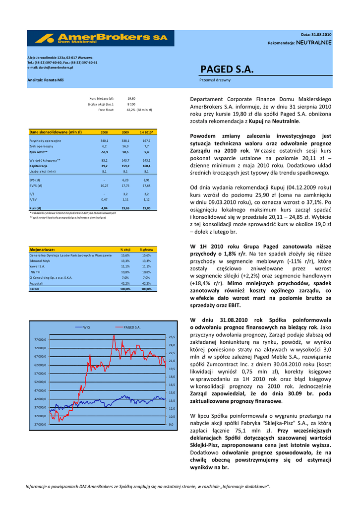 Data: 31.08.2010 Rekomendacja: Aleje Jerozolimskie 123a, 02-017 Warszawa Tel.: (48-22) 397-60-60, Fax.: (48-22) 397-60-61 e-mail: [email protected] PAGED S.A. Analityk: Renata Miś Przemysł drzewny Kurs bi eżący (zł): 19,80 Li czba a kcji (tys .): 8 100 Fre e fl oa t: Dane skonsolidowane (mln zł) 2008 2009 1H 2010* 340,1 338,1 167,7 Zys k opera cyjny Zysk netto** 6,2 56,9 7,7 -53,9 50,5 5,4 Wa rtoś ć ks ięgowa ** 83,2 143,7 143,2 Kapitalizacja 39,2 159,2 160,4 Li czba a kcji (ml n) 8,1 8,1 8,1 EPS (zł) BVPS (zł) P/E Departament Corporate Finance Domu Maklerskiego AmerBrokers S.A. informuje, że w dniu 31 sierpnia 2010 roku przy kursie 19,80 zł dla spółki Paged S.A. obniżona została rekomendacja z Kupuj na Neutralnie. 42,2% (68 ml n zł) Przychody opera cyjne - 6,23 8,91 10,27 17,75 17,68 - 3,2 2,2 P/BV 0,47 1,11 1,12 Kurs (zł) 4,84 19,65 19,80 % akcji % głosów Genera lna Dyre kcja La s ów Pa ńs twowych w Wa rs za wi e 15,6% 15,6% Edmund Mzyk 13,3% 13,3% Ya wa l S.A. 11,1% 11,1% ING TFI 10,8% 10,8% CI Cons ul ti ng Sp. z o.o. S.K.A. 7,0% 7,0% Pozos ta li 42,2% 42,2% Razem 100,0% 100,0% Powodem zmiany zalecenia inwestycyjnego jest sytuacja techniczna waloru oraz odwołanie prognoz Zarządu na 2010 rok. W czasie ostatnich sesji kurs pokonał wsparcie ustalone na poziomie 20,11 zł – dzienne minimum z maja 2010 roku. Dodatkowo układ średnich kroczących jest typowy dla trendu spadkowego. Od dnia wydania rekomendacji Kupuj (04.12.2009 roku) kurs wzrósł do poziomu 25,90 zł (cena na zamknięciu w dniu 09.03.2010 roku), co oznacza wzrost o 37,1%. Po osiągnięciu lokalnego maksimum kurs zaczął spadać i konsolidować się w przedziale 20,11 – 24,85 zł. Wybicie z tej konsolidacji może sprowadzić kurs w okolice 19,0 zł – dołek z lutego br. * wskaźniki rynkowe liczone na podstawie danych zanualizowanych ** zysk netto i kapitały przypadające jednostce dominującej Akcjonariusze: WIG 77 000,0 72 000,0 W 1H 2010 roku Grupa Paged zanotowała niższe przychody o 1,8% r/r. Na ten spadek złożyły się niższe przychody w segmencie meblowym (-11% r/r), które zostały częściowo zniwelowane przez wzrost w segmencie sklejki (+2,2%) oraz segmencie handlowym (+18,4% r/r). Mimo mniejszych przychodów, spadek zanotowały również koszty ogólnego zarządu, co w efekcie dało wzrost marż na poziomie brutto ze sprzedaży oraz EBIT. PAGED S.A. 25,5 24,0 22,5 67 000,0 21,0 62 000,0 19,5 57 000,0 18,0 52 000,0 47 000,0 NEUTRALNIE 16,5 15,0 42 000,0 13,5 37 000,0 12,0 32 000,0 10,5 27 000,0 9,0 W dniu 31.08.2010 rok Spółka poinformowała o odwołaniu prognoz finansowych na bieżący rok. Jako przyczyny odwołania prognozy, Zarząd podaje słabszą od zakładanej koniunkturę na rynku, powódź, w wyniku której poniesiono straty na aktywach w wysokości 3,0 mln zł w spółce zależnej Paged Meble S.A., rozwiązanie spółki Zumcontract Inc. z dniem 30.04.2010 roku (koszt likwidacji wyniósł 0,75 mln zł), korekty księgowe w sprawozdaniu za 1H 2010 rok oraz błąd księgowy w konsolidacji prognozy na 2010 rok. Jednocześnie Zarząd zapowiedział, że do dnia 30.09 br. poda zaktualizowane prognozy finansowe. W lipcu Spółka poinformowała o wygraniu przetargu na nabycie akcji spółki Fabryka "Sklejka-Pisz" S.A., za którą zapłaci łącznie 75,1 mln zł. Przy wcześniejszych deklaracjach Spółki dotyczących szacowanej wartości Sklejki-Pisz, zaproponowana cena jest istotnie wyższa. Dodatkowo odwołanie prognoz spowodowało, że na chwilę obecną powstrzymujemy się od estymacji wyników na br. Informacje o powiązaniach DM AmerBrokers ze Spółką znajdują się na ostatniej stronie, w rozdziale „Informacje dodatkowe”. Informacje dodatkowe Zastrzeżenia prawne Niniejsza analiza, zawierająca rekomendację inwestycyjną, została przygotowana przez Departament Corporate Finance. Jest ona skierowana do klientów detalicznych i profesjonalnych Domu Maklerskiego AmerBrokers i jest udostępniana nieodpłatnie. Analiza została przygotowana przez jej autora z wykorzystaniem najlepszej wiedzy i z zachowaniem należytej staranności, w celu osiągnięcia rzetelności i obiektywności, jak również z wykluczeniem jakiegokolwiek konfliktu interesów, który mógłby wpłynąć na jej treść. Autor analizy oraz Dom Maklerski AmerBrokers nie ponoszą odpowiedzialności za szkody poniesione w wyniku decyzji inwestycyjnych, podjętych w oparciu o ten dokument. Niniejsza analiza podlega ochronie wynikającej z ustawy z dnia 4 lutego 1994 roku o prawie autorskim i prawach pokrewnych (Dz. U. z 2006 r., Nr 90, poz. 631). Powielanie bądź publikowanie niniejszej analizy lub jej części bez pisemnej zgody DM AmerBrokers jest zabronione. Dane prezentowane w niniejszym dokumencie zostały uzyskane lub zaczerpnięte ze źródeł uznanych przez DM AmerBrokers za wiarygodne i rzetelne, jednakże DM AmerBrokers nie może zagwarantować ich dokładności, poprawności i pełności. Źródło danych – informacje ze spółki, prospekty emisyjne, raporty finansowe, opracowania branżowe, informacje prasowe oraz dostępne w Internecie itp. Objaśnienie skrótów stosowanych w analizie P/E - cena do zysku netto przypadającego na jedną akcję EV/EBITDA – wartość przedsiębiorstwa do zysku operacyjnego powiększonego o amortyzację w przeliczeniu na jedną akcję P/Sales - cena do przychodów ze sprzedaży na jedną akcję P/BV - cena do wartości księgowej na jedną akcję EPS - zysk netto przypadający na jedną akcję BVPS - wartość księgowa przypadająca na jedną akcję EBIT - zysk operacyjny EBITDA - zysk operacyjny + amortyzacja ROA - stopa zwrotu z aktywów ROE - stopa zwrotu z kapitałów własnych DCF - zdyskontowane przepływy pieniężne FCF - wolne przepływy pieniężne NOPLAT - zysk operacyjny po opodatkowaniu (teoretyczny) WACC - średni ważony koszt kapitału PV - wartość bieżąca RV - wartość rezydualna EV - wartość przedsiębiorstwa (kapitalizacja s