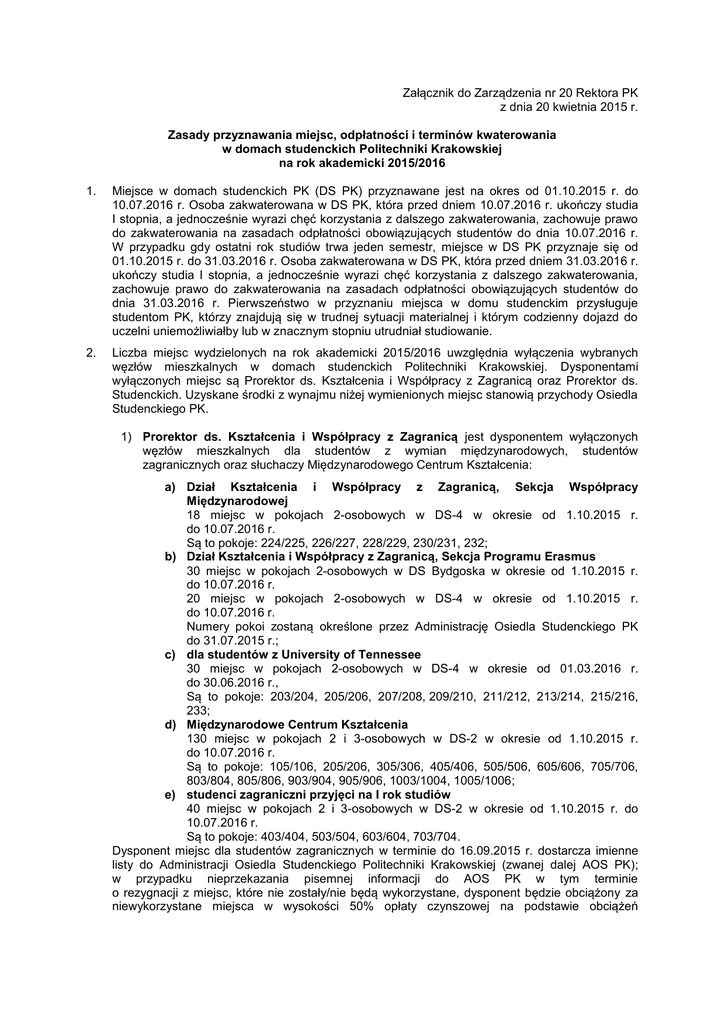 Załącznik do Zarządzenia nr 20 Rektora PK z dnia 20 kwietnia 2015 r. Zasady przyznawania miejsc, odpłatności i terminów kwaterowania w domach studenckich Politechniki Krakowskiej na rok akademicki 2015/2016 1. Miejsce w domach studenckich PK (DS PK) przyznawane jest na okres od 01.10.2015 r. do 10.07.2016 r. Osoba zakwaterowana w DS PK, która przed dniem 10.07.2016 r. ukończy studia I stopnia, a jednocześnie wyrazi chęć korzystania z dalszego zakwaterowania, zachowuje prawo do zakwaterowania na zasadach odpłatności obowiązujących studentów do dnia 10.07.2016 r. W przypadku gdy ostatni rok studiów trwa jeden semestr, miejsce w DS PK przyznaje się od 01.10.2015 r. do 31.03.2016 r. Osoba zakwaterowana w DS PK, która przed dniem 31.03.2016 r. ukończy studia I stopnia, a jednocześnie wyrazi chęć korzystania z dalszego zakwaterowania, zachowuje prawo do zakwaterowania na zasadach odpłatności obowiązujących studentów do dnia 31.03.2016 r. Pierwszeństwo w przyznaniu miejsca w domu studenckim przysługuje studentom PK, którzy znajdują się w trudnej sytuacji materialnej i którym codzienny dojazd do uczelni uniemożliwiałby lub w znacznym stopniu utrudniał studiowanie. 2. Liczba miejsc wydzielonych na rok akademicki 2015/2016 uwzględnia wyłączenia wybranych węzłów mieszkalnych w domach studenckich Politechniki Krakowskiej. Dysponentami wyłączonych miejsc są Prorektor ds. Kształcenia i Współpracy z Zagranicą oraz Prorektor ds. Studenckich. Uzyskane środki z wynajmu niżej wymienionych miejsc stanowią przychody Osiedla Studenckiego PK. 1) Prorektor ds. Kształcenia i Współpracy z Zagranicą jest dysponentem wyłączonych węzłów mieszkalnych dla studentów z wymian międzynarodowych, studentów zagranicznych oraz słuchaczy Międzynarodowego Centrum Kształcenia: a) Dział Kształcenia i Współpracy z Zagranicą, Sekcja Współpracy Międzynarodowej 18 miejsc w pokojach 2-osobowych w DS-4 w okresie od 1.10.2015 r. do 10.07.2016 r. Są to pokoje: 224/225, 226/227, 228/229, 230/231, 232; b) Dział Kształcenia i Współpracy z Zagranicą, Sekcja Programu Erasmus 30 miejsc w pokojach 2-osobowych w DS Bydgoska w okresie od 1.10.2015 r. do 10.07.2016 r. 20 miejsc w pokojach 2-osobowych w DS-4 w okresie od 1.10.2015 r. do 10.07.2016 r. Numery pokoi zostaną określone przez Administrację Osiedla Studenckiego PK do 31.07.2015 r.; c) dla studentów z University of Tennessee 30 miejsc w pokojach 2-osobowych w DS-4 w okresie od 01.03.2016 r. do 30.06.2016 r., Są to pokoje: 203/204, 205/206, 207/208, 209/210, 211/212, 213/214, 215/216, 233; d) Międzynarodowe Centrum Kształcenia 130 miejsc w pokojach 2 i 3-osobowych w DS-2 w okresie od 1.10.2015 r. do 10.07.2016 r. Są to pokoje: 105/106, 205/206, 305/306, 405/406, 505/506, 605/606, 705/706, 803/804, 805/806, 903/904, 905/906, 1003/1004, 1005/1006; e) studenci zagraniczni przyjęci na I rok studiów 40 miejsc w pokojach 2 i 3-osobowych w DS-2 w okresie od 1.10.2015 r. do 10.07.2016 r. Są to pokoje: 403/404, 503/504, 603/604, 703/704. Dysponent miejsc dla studentów zagranicznych w terminie do 16.09.2015 r. dostarcza imienne listy do Administracji Osiedla Studenckiego Politechniki Krakowskiej (zwanej dalej AOS PK); w przypadku nieprzekazania pisemnej informacji do AOS PK w tym terminie o rezygnacji z miejsc, które nie zostały/nie będą wykorzystane, dysponent będzie obciążony za niewykorzystane miejsca w wysokości 50% opłaty czynszowej na podstawie obciążeń wewnętrznych, do czasu przekazania takiej informacji do AOS PK. Możliwość zwrotu do AOS PK dotyczy całych pokoi, a nie pojedynczych miejsc. 2) Prorektor ds. Studenckich jest dysponentem wyłączonych węzłów mieszkalnych dla studentów przyjętych na I rok studiów, doktorantów, osób niepełnosprawnych, członków AZS PK oraz członków Parlamentu Samorządu Studentów PK Rady Osiedla oraz Rady Mieszkańców Domów Studenckich: a) dla doktorantów 16 miejsc w pokojach 2-osobowych w DS-4 w okresie od 1.10.2015 r. do 10.07.2016 r. Są to pokoje: 415/416, 426/427, 428/429, 430/431; b) dla osób niepełnosprawnych 18 miejsc w okresie od 1.10.2015 r. do 10.07.2016 r.: – 6 miejsc w pokojach 1 i 2-osobowych w DS-1. Są to pokoje: 114A (1-osobowy), 114B (2-osobowy), 115A (1-osobowy), 115B (2osobowy); – 4 miejsca w pokojach 1-osobowych w DS-3. Są to pokoje: 112A, 112B, 113A, 113B; – 8 miejsc w pokojach 2-osobowych w DS-4. Są to pokoje: 103/104, 105/106, 503, 504; c) dla osób przyjętych na I rok studiów 350 miejsc w okresie od 1.10.2015 r. do 10.07.2016 r.: – 30 miejsc w DS-1, – 100 miejsc w DS-3, – 20 miejsc w DS-1 (dla studentów przyjętych na I rok studiów II stopnia, przydział miejsc poza systemem e-HMS, tj. bezpośrednio w AOS, na podstawie wniosku wystawionego przez dziekanat – wzór nr 2), – 160 miejsc w DS-2, – 20 miejsc DS-4 (dla studentów przyjętych na I rok studiów II stopnia, przydział miejsc poza systemem e-HMS, tj. bezpośrednio w AOS, na podstawie wniosku wystawionego przez dziekanat – wzór nr 2), – 20 miejsc w DS-B1; d) Akademicki Związek Sportowy – Klub Uczelniany PK 16 miejsc w pokojach 2-osobowych w DS-4 w okresie od 1.10.2015 r. do 10.07.2016 r. Są to pokoje: 403/404, 405/406, 407/408, 422/423. e) Parlament Samorządu Studentów 16 miejsc w pokojach 2-osobowych w DS-4 w okresie od 1.10.2015 r. do 10.07.2016 r. Są to pokoje: 409/410, 411/412, 413/414, 424/425. Zasady przyznawania miejsc dla tej grupy osób zostały określone w dalszej części dokumentu; f) Rada Osiedla/Rady Mieszkańców Domów Studenckich 36 miejsc w okresie od 1.10.2015 r. do 10.07.2016 r. Do dnia 24.04.2015 r. Rada Osiedla Domów Studenckich przekaże do AOS PK listę z wykazem osób (aktualnych członków RO/RM) oraz wskazaniem DS, w którym każda z tych osób będzie kwaterowana. 3) Kierownik Osiedla Studenckiego jest dysponentem pozostałych miejsc w domach studenckich. 3. Miejsca w domach studenckich będą
