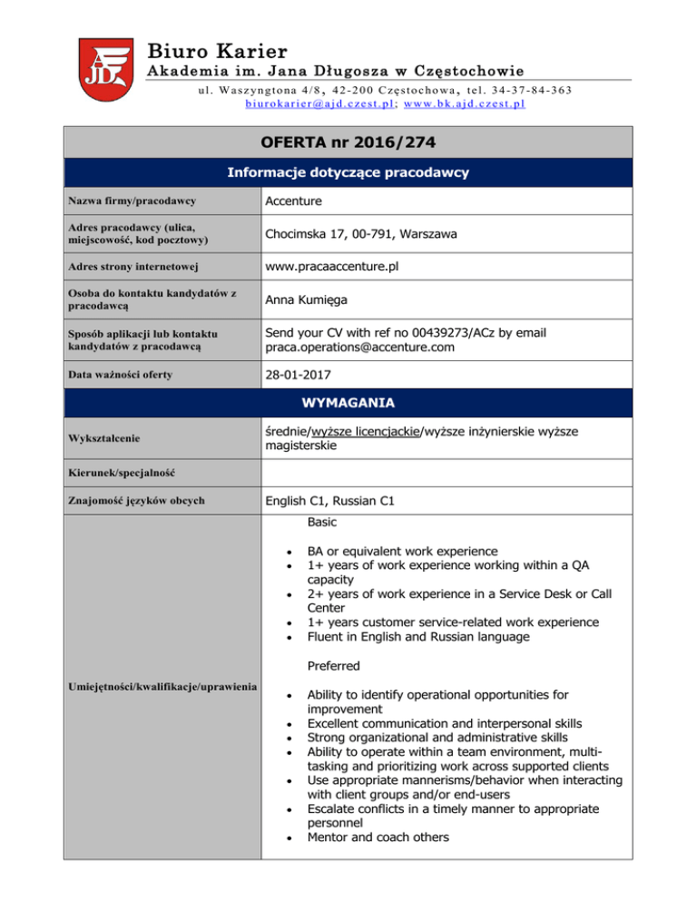 Biuro Karier A kade mia im. Jan a Dłu gosz a w Czę stoch owie ul. Waszyngtona 4/8 , 42-200 Częstochowa, tel. 34-37-84-363 [email protected] ; www.bk.ajd.czest.pl OFERTA nr 2016/274 Informacje dotyczące pracodawcy Nazwa firmy/pracodawcy Accenture Adres pracodawcy (ulica, miejscowość, kod pocztowy) Chocimska 17, 00-791, Warszawa Adres strony internetowej www.pracaaccenture.pl Osoba do kontaktu kandydatów z pracodawcą Anna Kumięga Sposób aplikacji lub kontaktu kandydatów z pracodawcą Send your CV with ref no 00439273/ACz by email [email protected] Data ważności oferty 28-01-2017 WYMAGANIA Wykształcenie średnie/wyższe licencjackie/wyższe inżynierskie wyższe magisterskie Kierunek/specjalność Znajomość języków obcych English C1, Russian C1 Basic BA or equivalent work experience 1+ years of work experience working within a QA capacity 2+ years of work experience in a Service Desk or Call Center 1+ years customer service-related work experience Fluent in English and Russian language Preferred Umiejętności/kwalifikacje/uprawienia Ability to identify operational opportunities for improvement Excellent communication and interpersonal skills Strong organizational and administrative skills Ability to operate within a team environment, multitasking and prioritizing work across supported clients Use appropriate mannerisms/behavior when interacting with client groups and/or end-users Escalate conflicts in a timely manner to appropriate personnel Mentor and coach others Inne OPIS STANOWISKA PRACY Nazwa stanowiska pracy Quality Analyst with English and Russian Rodzaj oferty praca stała Rodzaj umowy umowa o pracę Wymiar czasu pracy 40h Wysokość wynagrodzenia brutto Miejsce pracy (woj. miejscowość) Kraków Liczba wakatów zł The QA team is tasked with evaluating and ensuring quality delivery of the Client Services Team. This individual is responsible for executing QA service offerings and participating in projects & initiatives led by QA. Duties of the QA Analyst include: Zakres obowiązków Conduct root cause and other data analysis Identify improvement opportunities within the SMB environment Provide QA progress reports to Team Leads. Conduct QA evaluations per client requirements Conduct call coaching sessions per client requirements Conduct Health Checks for high impact transitions, as requested Analyze Customer Satisfaction Survey results & recommend improvement efforts Act as escalation point of contact for process questions, issues and resolution Act as Subject Matter Expert (SME) for QA evaluations Administration of the call recording and evaluation system Administer the QA issue repository and ensure all escalations are properly addressed INNE INFORMACJE PRACODAWCY DLA KANDYDATÓW We offer Localization: Kraków The ability to use your knowledge of foreign language on a daily basis at work (we serve our Clients in almost 30 foreign languages) Experience with a range of Clients and technology solutions which provides professional relevance Operating according to Lean Six Sigma philosophy Collaborating and learning from diverse and talented colleagues helps you “raise your game” Trainings and development tailored to help you achieve your potential New Joiners Programme including trainings Opportunity to engage in Corporate Social Responsibility initiatives We also think about your social life, at Accenture you will be able to take part in different initiatives like Book Club, International Cuisine Club, Accenture Runners Club, family events, cultural meetings, photography classes, climbing, soccer, swimming and many others. Social benefit packages including: private medical care, MyBenefit, life insurance Beverages and fully equipped kitchen for you Modern & friendly office