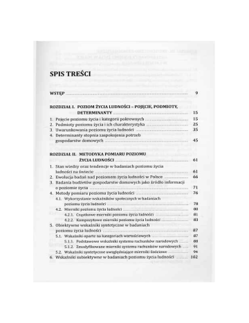 SPIS TREŚCI WSTĘP ROZDZIAŁ I. POZIOM ŻYCIA LUDNOŚCI - POJĘCIE, PODMIOTY, DETERMINANTY 1. 2. 3. 4. Pojęcie poziomu życia i kategorii pokrewnych Podmioty poziomu życia i ich charakterystyka Uwarunkowania poziomu życia ludności Determinanty stopnia zaspokojenia potrzeb gospodarstw domowych ROZDZIAŁ II. METODYKA POMIARU POZIOMU ŻYCIA LUDNOŚCI 1. Stan wiedzy oraz tendencje w badaniach poziomu życia ludności na świecie 2. Ewolucja badań nad poziomem życia ludności w Polsce 3. Badania budżetów gospodarstw domowych jako źródło informacji o poziomie życia 4. Metody pomiaru poziomu życia ludności 4.1. Wykorzystanie wskaźników społecznych w badaniach poziomu życia ludności 4.2. Mierniki poziomu życia ludności 4.2.1. Cząstkowe mierniki poziomu życia ludności 4.2.2. Kompozytowe mierniki poziomu życia ludności 5. Obiektywne wskaźniki syntetyczne w badaniach poziomu życia ludności 5.1. Wskaźniki oparte na kategoriach wartościowych 5.1.1. Podstawowe wskaźniki systemu rachunków narodowych 5.1.2. Zmodyfikowane mierniki systemu rachunków narodowych 5.2. Wskaźniki syntetyczne uwzględniające mierniki ilościowe 6. Wskaźniki subiektywne w badaniach poziomu życia ludności 9 15 15 25 35 45 61 61 66 71 76 78 80 81 83 87 87 88 91 94 102 ROZDZIAŁ III. EKONOMICZNO-DEMOGRAFICZNE DETERMINANTY POZIOMU ŻYCIA W POLSCE W LATACH 1989-2010 1. Makrouwarunkowania poziomu życia ludności w Polsce 1.1. Transformacja gospodarcza a poziom życia ludności 1.2. Wpływ procesów globalizacyjnych i integracyjnych na poziom życia ludności 1.3. Znaczenie kryzysu dla stopnia zaspokojenia potrzeb 2. Czynniki ekonomiczne określające poziom życia gospodarstw domowych 107 107 108 113 116 119 2.1. Sytuacja panująca na rynku pracy w Polsce 119 2.2. Wskaźniki cen towarów i usług konsumpcyjnych oraz ich wpływ na koszty utrzymania gospodarstw domowych 125 2.3. Dochód jako główna determinanta poziomu życia w okresie transformacji 130 2.4. Oszczędności polskich gospodarstw domowych 139 2.5. Zadłużenie gospodarstw domowych z tytułu zaciąganych kredytów .... 144 2.6. Podaż jako czynnik poziomu życia 148 3. Procesy demograficzne a poziom życia ludności - ogólne zależności. Charakterystyka demograficzno-społeczna ludności i gospodarstw domowych w Polsce 150 ROZDZIAŁ IV. ZMIANY W POZIOMIE ŻYCIA LUDNOŚCI W OKRESIE PRZEMIAN SPOŁECZNO-GOSPODARCZYCH W KRAJU 159 1. Poziom życia ludności w Polsce na podstawie wskaźników makroekonomicznych 159 1.1. PKB jako miara kondycji gospodarki i ogólny wskaźnik poziomu życia ludności kraju 1.2. Poziom życia w świetle wydatków i spożycia ludności 159 163 2. Stopień zaspokojenia potrzeb konsumpcyjnych gospodarstw domowych na podstawie wyników badań budżetów gospodarstw domowych 168 3. Poziom życia ludności w świetle mierników cząstkowych 3.1. Wyżywienie 3.2. Mieszkanie 3.3. Zdrowie 3.4. Edukacja 3.5. Kultura i rekreacja 179 179 182 185 188 192 3.6. Zagospodarowanie materialne 3.7. Bezpieczeństwo i zabezpieczenie społeczne 4. Poziom życia ludności Polski w świetle mierników syntetycznych 4.1. Wyznaczenie syntetycznego wskaźnika poziomu życia ludności na podstawie metod taksonomicznych 4.2. Poziom życia ludności na podstawie wskaźnika rozwoju społecznego HDI 4.3. Przeciętne dalsze trwanie życia ludzkiego w Polsce 5. Ocena przemian w poziomie życia Polaków na podstawie wtórnych źródeł informacji 195 199 203 203 214 216 218 ROZDZIAŁ V. STOPIEŃ ZASPOKOJENIA POTRZEB KONSUMPCYJNYCH GOSPODARSTW DOMOWYCH W ŚWIETLE BADAŃ BEZPOŚREDNICH 220 1. Opis metody badawczej i organizacji badań. Charakterystyka badanej populacji 2. Ogólna ocena poziomu życia gospodarstw domowych i ludności Polski 3. Stopień zaspokojenia poszczególnych grup potrzeb badanych gospodarstw domowych 3.1. 3.2. 3.3. 3.4. 3.5. 3.6. Poziom zaspokojenia potrzeb żywieniowych Poziom zaspokojenia potrzeb mieszkaniowych Poziom zaspokojenia potrzeb zdrowotnych Poziom zaspokojenia potrzeb edukacyjnych Poziom zaspokojenia potrzeb kulturalnych i rekreacyjnych Poziom zaspokojenia potrzeb z zakresu zagospodarowania materialnego 3.7. Poziom zaspokojenia potrzeb z zakresu bezpieczeństwa 4. Przewidywania dotyczące poziomu życia badanych gospodarstw domowych 5. Ocena poziomu zaspokojenia potrzeb gospodarstw domowych na podstawie badań ankietowych 220 224 231 236 238 242 247 251 254 257 262 265 ZAKOŃCZENIE 269 BIBLIOGRAFIA 279 SPIS RYSUNKÓW SPIS TABEL SPIS WYKRESÓW SPIS ZAŁĄCZNIKÓW ZAŁĄCZNIKI