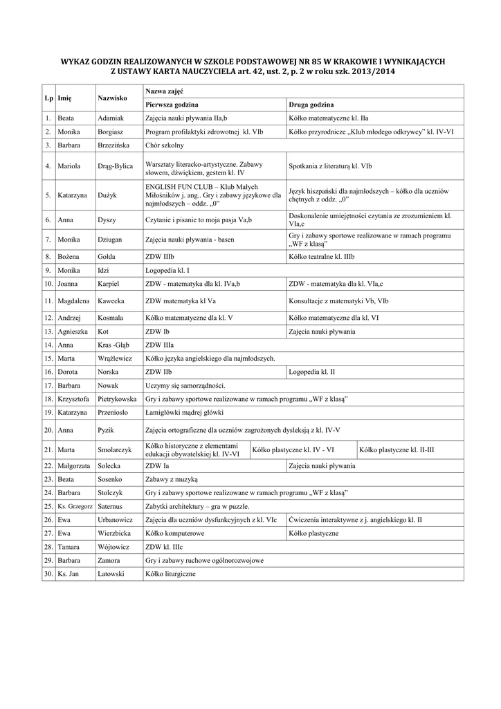 WYKAZ GODZIN REALIZOWANYCH W SZKOLE PODSTAWOWEJ NR 85 W KRAKOWIE I WYNIKAJĄCYCH Z USTAWY KARTA NAUCZYCIELA art. 42, ust. 2, p. 2 w roku szk. 2013/2014 Lp Imię Nazwa zajęć Nazwisko Pierwsza godzina Druga godzina 1. Beata Adamiak Zajęcia nauki pływania IIa,b Kółko matematyczne kl. IIa 2. Monika Borgiasz Program profilaktyki zdrowotnej kl. VIb Kółko przyrodnicze „Klub młodego odkrywcy” kl. IV-VI 3. Barbara Brzezińska Chór szkolny 4. Mariola Drąg-Bylica Warsztaty literacko-artystyczne. Zabawy słowem, dźwiękiem, gestem kl. IV Spotkania z literaturą kl. VIb 5. Katarzyna Dużyk ENGLISH FUN CLUB – Klub Małych Miłośników j. ang.. Gry i zabawy językowe dla najmłodszych – oddz. „0” Język hiszpański dla najmłodszych – kółko dla uczniów chętnych z oddz. „0” 6. Anna Dyszy Czytanie i pisanie to moja pasja Va,b Doskonalenie umiejętności czytania ze zrozumieniem kl. VIa,c 7. Monika Dziugan Zajęcia nauki pływania - basen Gry i zabawy sportowe realizowane w ramach programu „WF z klasą” 8. Bożena Gołda ZDW IIIb Kółko teatralne kl. IIIb 9. Monika Idzi Logopedia kl. I 10. Joanna Karpiel ZDW - matematyka dla kl. IVa,b ZDW - matematyka dla kl. VIa,c 11. Magdalena Kawecka ZDW matematyka kl Va Konsultacje z matematyki Vb, VIb 12. Andrzej Kosmala Kółko matematyczne dla kl. V Kółko matematyczne dla kl. VI 13. Agnieszka Kot ZDW Ib Zajęcia nauki pływania 14. Anna Kras -Głąb ZDW IIIa 15. Marta Wrąźlewicz Kółko języka angielskiego dla najmłodszych. 16. Dorota Norska ZDW IIb 17. Barbara Nowak Uczymy się samorządności. 18. Krzysztofa Pietrykowska Gry i zabawy sportowe realizowane w ramach programu „WF z klasą” 19. Katarzyna Przeniosło Łamigłówki mądrej główki 20. Anna Pyzik Zajęcia ortograficzne dla uczniów zagrożonych dysleksją z kl. IV-V 21. Marta Smolarczyk Kółko historyczne z elementami edukacji obywatelskiej kl. IV-VI 22. Małgorzata Solecka ZDW Ia 23. Beata Sosenko Zabawy z muzyką 24. Barbara Stolczyk Gry i zabawy sportowe realizowane w ramach programu „WF z klasą” Logopedia kl. II Kółko plastyczne kl. IV - VI Kółko plastyczne kl. II-III Zajęcia nauki pływania 25. Ks. Grzegorz Saternus Zabytki architektury – gra w puzzle. 26. Ewa Urbanowicz Zajęcia dla uczniów dysfunkcyjnych z kl. VIc Ćwiczenia interaktywne z j. angielskiego kl. II 27. Ewa Wierzbicka Kółko komputerowe Kółko plastyczne 28. Tamara Wójtowicz ZDW kl. IIIc 29. Barbara Zamora Gry i zabawy ruchowe ogólnorozwojowe 30. Ks. Jan Latowski Kółko liturgiczne