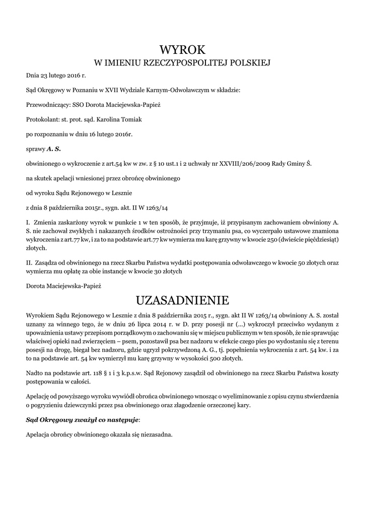 WYROK W IMIENIU RZECZYPOSPOLITEJ POLSKIEJ Dnia 23 lutego 2016 r. Sąd Okręgowy w Poznaniu w XVII Wydziale Karnym-Odwoławczym w składzie: Przewodniczący: SSO Dorota Maciejewska-Papież Protokolant: st. prot. sąd. Karolina Tomiak po rozpoznaniu w dniu 16 lutego 2016r. sprawy A. S. obwinionego o wykroczenie z art.54 kw w zw. z § 10 ust.1 i 2 uchwały nr XXVIII/206/2009 Rady Gminy Ś. na skutek apelacji wniesionej przez obrońcę obwinionego od wyroku Sądu Rejonowego w Lesznie z dnia 8 października 2015r., sygn. akt. II W 1263/14 I. Zmienia zaskarżony wyrok w punkcie 1 w ten sposób, że przyjmuje, iż przypisanym zachowaniem obwiniony A. S. nie zachował zwykłych i nakazanych środków ostrożności przy trzymaniu psa, co wyczerpało ustawowe znamiona wykroczenia z art.77 kw, i za to na podstawie art.77 kw wymierza mu karę grzywny w kwocie 250 (dwieście pięćdziesiąt) złotych. II. Zasądza od obwinionego na rzecz Skarbu Państwa wydatki postępowania odwoławczego w kwocie 50 złotych oraz wymierza mu opłatę za obie instancje w kwocie 30 złotych Dorota Maciejewska-Papież UZASADNIENIE Wyrokiem Sądu Rejonowego w Lesznie z dnia 8 października 2015 r., sygn. akt II W 1263/14 obwiniony A. S. został uznany za winnego tego, że w dniu 26 lipca 2014 r. w D. przy posesji nr (...) wykroczył przeciwko wydanym z upoważnienia ustawy przepisom porządkowym o zachowaniu się w miejscu publicznym w ten sposób, że nie sprawując właściwej opieki nad zwierzęciem – psem, pozostawił psa bez nadzoru w efekcie czego pies po wydostaniu się z terenu posesji na drogę, biegał bez nadzoru, gdzie ugryzł pokrzywdzoną A. G., tj. popełnienia wykroczenia z art. 54 kw. i za to na podstawie art. 54 kw wymierzył mu karę grzywny w wysokości 500 złotych. Nadto na podstawie art. 118 § 1 i 3 k.p.s.w. Sąd Rejonowy zasądził od obwinionego na rzecz Skarbu Państwa koszty postępowania w całości. Apelację od powyższego wyroku wywiódł obrońca obwinionego wnosząc o wyeliminowanie z opisu czynu stwierdzenia o pogryzieniu dziewczynki przez psa obwinionego oraz złagodzenie orzeczonej kary. Sąd Okręgowy zważył co następuje: Apelacja obrońcy obwinionego okazała się niezasadna. W ocenie Sądu Okręgowego, Sąd I instancji należycie przeprowadził postępowanie dowodowe i dokonał wnikliwej, wszechstronnej, zgodnej z wymaganiami art. 7 k.p.k. w zw. z art. 8 kpw oceny dowodów, mających istotne znaczenie dla merytorycznego rozstrzygnięcia sprawy. Jednakże Sąd Okręgowy nie podzielił oceny prawnej działania obwinionego dokonanej przez Sąd Rejonowy, co miało również wpływ na wymiar orzeczonej wobec A. S. kary. W pierwszej kolejności należy wskazać, iż nie sposób przyznać racji obrońcy obwinionego, by Sąd I instancji niewłaściwie ocenił zgromadzony w sprawie materiał dowodowy oraz, by na podstawie tak ocenionych dowodów, w sposób nieprawidłowy dokonał ustaleń faktycznych, które przyjęto za podstawę rozstrzygnięcia. Tytułem podkreślenia należy jedynie wskazać, iż okoliczność, że pokrzywdzona A. G. został ugryziona przez psa należącego do A. S. znalazła potwierdzenie w wiarygodnym materiale dowodowym zgromadzonym w aktach sprawy, chociażby w postaci zeznań pokrzywdzonej, świadka M. K., pośrednio świadka E. G., jak i opinii biegłego sądowego z Zakładu Medycyny Sądowej (o czym więcej w dalszej części uzasadnienia). Owa ocena zasługuje na pełne poparcie nie ma zatem potrzeby czynienia w tym zakresie ponownych szczegółowych rozważań, sprowadzałoby się to bowiem do powielenia wywodów Sądu Rejonowego. Wystarczającym będzie więc odesłanie do stosownego fragmentu pisemnego uzasadnienia zaskarżonego orzeczenia. Obrońca obwinionego zaś nie zaprezentował argumentacji, która sprawiłaby, iż należałoby zweryfikować rozumowanie Sądu I instancji. Należy zatem w tej materii odesłać do stosownej argumentacji wskazanej w pisemnym uzasadnieniu wyroku. Dość zatem wskazać, iż pokrzywdzona A. G. konsekwentnie - tak w toku czynności wyjaśniających, jak i w trakcie postępowania przed Sądem I instancji – opisywała jak przebiegało zdarzenie z dnia 26 lipca 2014r., które spowodowało powstanie obrażeń na jej twarzy. Wypowiedzi pokrzywdzonej cechowała spoistość i rzeczowość. Nie sposób doszukać się okoliczności świadczących o tym, że zeznania pokrzywdzonej nieprawdziwie opisują przebieg wydarzeń, w szczególności powodów, dla których miałaby tak czynić. Podkreślić przy tym należy, iż zgromadzony materiał dowodowy nie daje żadnych podstaw do stwierdzenia, iż pokrzywdzona fałszywie pomawia obwinionego o zachowanie, które nie miało miejsca – okoliczności wskazywane przez A. G. znajdują poparcie w innych źródłach dowodowych. W ocenie Sądu Okręgowego, mając na uwadze również powyższe względy, nie zasługiwał na akceptację podnoszony przez obrońcę obwinionego zarzut, jakoby Sąd Rejonowy miał się dopuścić obrazy przepisów postępowania poprzez dokonanie oceny wyjaśnień obwinionego oraz zeznań świadków D. S. i J. M. w sposób sprzeczny z zasadami doświadczenia życiowego poprzez pominięcie opisu zachowania A. G. i M. K. po zdarzeniu, co miało wpływ na treść wyroku, albowiem zachowanie osób, które uczestniczą w tego rodzaju zdarzeniu powinno być adekwatne do rodzaju zdarzenia, to znaczy osoby te winny być zdenerwowane a nie rozweselone, co w konsekwencji doprowadziło do błędu w ustaleniach faktycznych będących podstawą rozstrzygnięcia w niniejszej sprawie. Zdaniem Sądu Okręgowego, Sąd Rejonowy dokonał wnikliwej analizy wyjaśnień obwinionego oraz przesłuchanych w sprawie świadków D. S. i J. M.. Również z wywodami w tym zakresie należy się zgodzić w pełni i nie ma potrzeby ponownego szczegółowego czynienia takowej oceny. W ocenie Sądu II instancji, kwestionowanie faktu ugryzienia A. G. przez psa należącego do A. S. z powodu rzekome