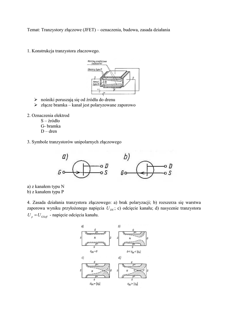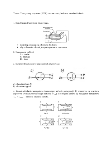 Temat: Tranzystory złączowe (JFET) – oznaczenia, budowa, zasada działania 1. Konstrukcja tranzystora złaczowego. nośniki poruszają się od źródła do drenu złącze bramka – kanał jest polaryzowane zaporowo 2. Oznaczenia elektrod S – źródło G- bramka D – dren 3. Symbole tranzystorów unipolarnych złączowego a) z kanałem typu N b) z kanałem typu P 4. Zasada działania tranzystora złączowego: a) brak polaryzacji; b) rozszerza się warstwa zaporowa wyniku przyłożonego napięcia U DS ; c) odcięcie kanału; d) nasycenie tranzystora U p = U GSoff - napięcie odcięcia kanału. 5. Opis zasady działania Jeżeli napięcie U GS = 0 i U DS ma małą wartość (rys.a) to prąd zmienia się liniowo w funkcji przyłożonego napięcia (tranzystor zachowuje się jak rezystor) Podczas narastania napięcia U DS złącze kanał – bramka (PN) jest coraz silniej polaryzowane zaporowo, przy czym polaryzacja ta jest silniejsza w pobliżu drenu (rys.b). Przy pewnej wartości napięcia U DS = U DSsat = U p , następuje zamknięcie (odcięcie) kanału (rys.c) przy drenie. Dalszy wzrost napięcia powoduje, że kanał jest zamykany coraz bliżej źródła. Tranzystor wchodzi w stan nasycenia, a prąd przez niego płynący jest prądem nasycenia. 6. Schematy polaryzacji: a) z kanałem typu N; b) z kanałem typu P