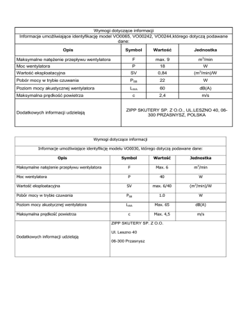 Wymogi dotyczące informacji Informacje umożliwiające identyfikację model VO0065, VO00242, VO0244,którego dotyczą podawane dane: Symbol Wartość Jednostka Maksymalne natężenie przepływu wentylatora F max. 9 m3/min Moc wentylatora P 18 Opis W Wartość eksploatacyjna SV 0,84 (m /min)/W Pobór mocy w trybie czuwania PSB 22 W Poziom mocy akustycznej wentylatora LWA 60 dB(A) c 2,4 m/s Maksymalna prędkość powietrza 3 ZIPP SKUTERY SP. Z O.O., UL.LESZNO 40, 06300 PRZASNYSZ, POLSKA Dodatkowych informacji udzielają Wymogi dotyczące informacji Informacje umożliwiające identyfikcję modelu VO0030, którego dotyczą podawane dane: Opis Symbol Wartość Jednostka Maksymalne natężenie przepływu wentylatora F Max. 6 m3/min Moc wentylatora P 40 W Wartość eksploatacyjna SV max. 6/40 (m3/min)/W Pobór mocy w trybie czuwania PSB 1.0 W Poziom mocy akustycznej wentylatora LWA Max. 65 dB(A) c Max. 4,5 m/s Maksymalna prędkość powietrza ZIPP SKUTERY SP. Z O.O. Dodatkowych informacji udzielają Ul. Leszno 40 06-300 Przasnysz