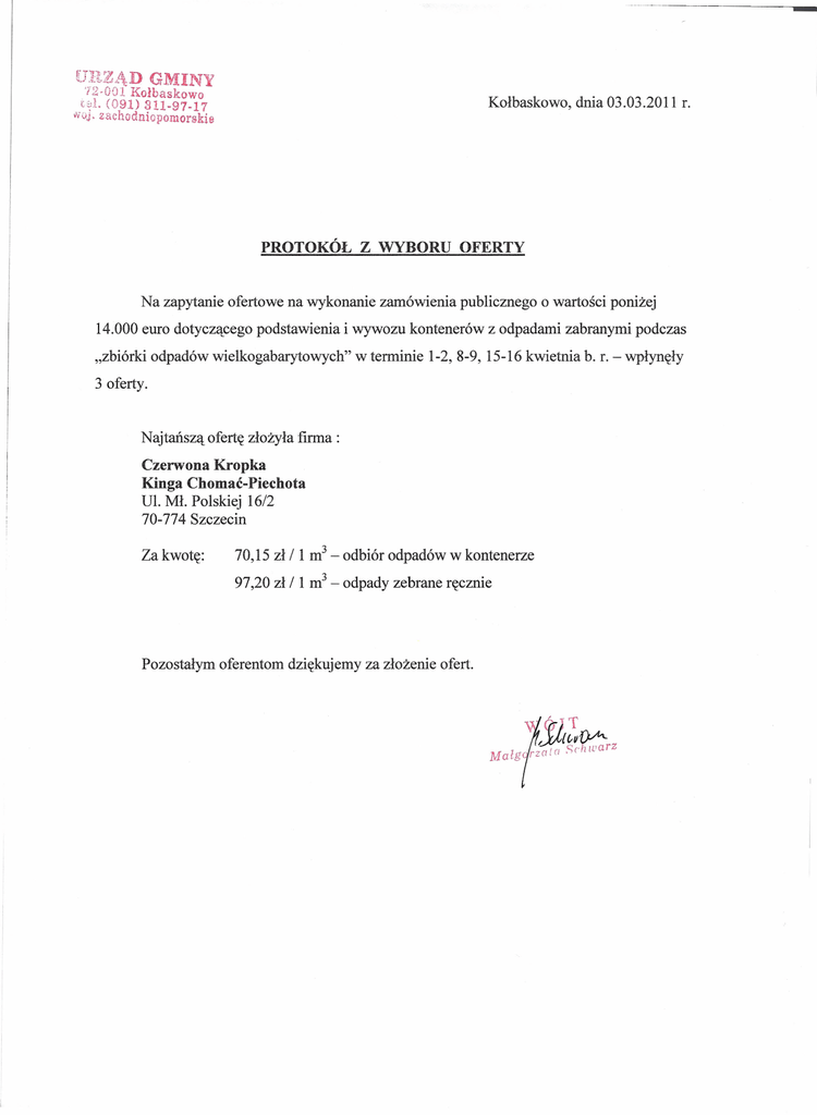 "'D GM! NY fi,\,,"lI?, ,,-U:t. Jel: '/2-001 Kołbaskowo l~L (091) 311-97-17 Vi (IJ. zachodniopomorskie Kołbaskowo, dnia 03.03.2011 r. PROTOKÓŁ Z WYBORU OFERTY Na zapytanie ofertowe na wykonanie zamówienia publicznego o wartości poniżej 14.000 euro dotyczącego podstawienia i wywozu kontenerów z odpadami zabranymi podczas "zbiórki odpadów wielkogabarytowych" w terminie 1-2,8-9, 15-16 kwietnia b. r. - wpłynęły 3 oferty. Najtańszą ofertę złożyła firma: Czerwona Kropka Kinga Chomać-Piechota Ul. Mł. Polskiej 16/2 70-774 Szczecin Za kwotę: 70,15 zł / l m3 - odbiór odpadów w kontenerze 97,20 zł / l m3 - odpady zebrane ręcznie Pozostałym oferentom dziękujemy za złożenie ofert. T ll"vO-A Malg r zain " Selw'ar z