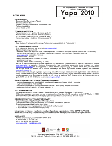 REGULAMIN ORGANIZATORZY Studencki Klub Turystyczny PŁazik Studenckie Radio Żak Studenckie Koło Przewodników Beskidzkich Łódź Politechnika Łódzka Urząd Miasta Łodzi TERMINY KONCERTÓW Koncert konkursowy – piątek, 12 marca, godz.19 Koncert konkursowy – sobota, 13 marca, godz.12 Nocny koncert gwiazd – sobota, 13 marca, godz.19 Koncert laureatów – niedziela, 14 marca, godz.13 MIEJSCE Sala Studium Wychowania Fizycznego Politechniki Łódzkiej, Łódź, al. Politechniki 11 ZGŁOSZENIA WYKONAWCÓW Druk zgłoszenia dostępny jest na stronie www.yapa.art.pl Zgłoszenia powinny zawierać: - nagranie w formacie mp3 albo płytę lub kasetę (maks. 3 piosenki o tematyce najlepiej turystycznej lub zbliżonej). Nazwy plików mp3 powinny być tytułami zgłaszanych piosenek – szczegółowa instrukcja na stronie www.yapa.art.pl w zakładce Konkurs. - autorów tekstu i muzyki. - teksty piosenek wraz z funkcjami na gitarę, - skład imienny grupy, - dokładny adres, telefon kontaktowy, e – mail, Paczkę ze zgłoszeniem należy przesłać na serwer yapowy poprzez system wysyłania zgłoszeń dostępny na stronie www.yapa.art.pl w zakładce Konkurs. Dopuszczalne jest przesłanie zgłoszenia drogą mailową na adres [email protected] lub zwykłą pocztą na adres: Komitet Organizacyjny 35 OSPPT YAPA 2010, al. Politechniki 3a, 93-590 Łódź, w terminie do 4 marca. Informacje na temat regulaminu można uzyskać pod adresem [email protected]. W koncercie konkursowym wystąpią wykonawcy zakwalifikowani po przesłuchaniach płyt i kaset oraz wykonawcy którzy uzyskali nominacje na innych przeglądach piosenki turystycznej. Wyniki kwalifikacji będą znane 8 marca i zostaną udostępnione do wglądu w dniach 8 -10 marca w siedzibie SKT PŁazik (Łódź, al. Politechniki 3b) w godz.12-17, tel. 42 636 40 61 oraz na stronie www.yapa.art.pl ŚWIADZCZENIA DLA WYKONAWCÓW KONKURSOWYCH - noclegi dla wykonawców pozałódzkich w salkach telewizyjnych (własny śpiwór i karimata) - wyżywienie (obiad na stołówce PŁ) - zwrot kosztów przejazdu (pociąg pośpieszny 2 klasa – bilet ulgowy, zespoły do 5 osób) - próby mikrofonowe – piątek, 12 marca, od godz. 10 ZGŁOSZENIA WIDZÓW Sprzedaż karnetów (25 zł) od 1 marca – Strefa biletów, CIK, Almatur, Zapiecek, PŁazik, Cotton Widzowie pozałódzcy rezerwują karnety po dokonaniu wpłaty (do dnia 10 marca) na konto SKT Płazik: 16 1020 3408 0000 4602 0118 4654, karnety będą wydawane po okazaniu oryginalnego dowodu wpłaty KOMISJA KWALIFIKACYJNA I WYSOKIE JURY Organizatorzy powołują Komisję Kwalifikacyjną, która: - przeprowadzi eliminacje wykonawców na podstawie przesłanych zgłoszeń Organizatorzy powołują Wysokie Jury, które: - oceni wykonawców występujących w koncertach konkursowych - wyda werdykt o stanie piosenki turystycznej Interpretacja niniejszego regulaminu należy wyłącznie do organizatorów XXXV OSPPT YAPA 2010. Materiał audiowizualny zarejestrowany podczas koncertów jest wyłączną własnością organizatorów. NASZ ADRES Komitet Organizacyjny XXXV OSPPT YAPA 2010 al. Politechniki 3a, 93-590 Łódź tel. 42 636 40 61, 600 589 256 www.yapa.art.pl [email protected]