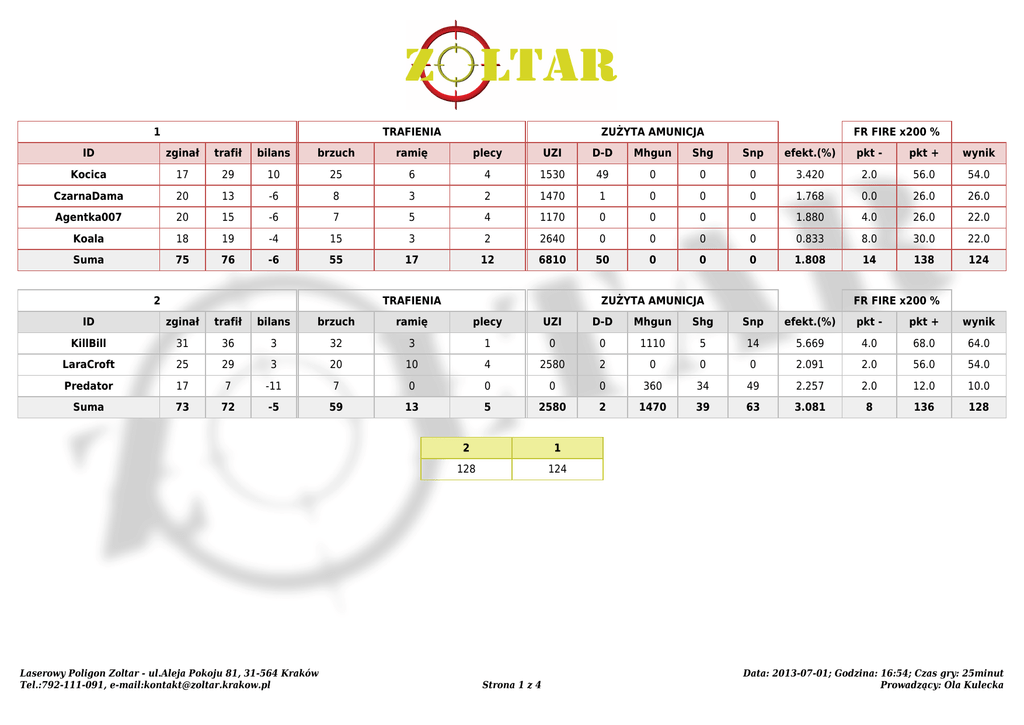 1 TRAFIENIA ZUŻYTA AMUNICJA FR FIRE x200 % ID zginał trafił bilans brzuch ramię plecy UZI D-D Mhgun Shg Snp efekt.(%) pkt - pkt + wynik Kocica 17 29 10 25 6 4 1530 49 0 0 0 3.420 2.0 56.0 54.0 CzarnaDama 20 13 -6 8 3 2 1470 1 0 0 0 1.768 0.0 26.0 26.0 Agentka007 20 15 -6 7 5 4 1170 0 0 0 0 1.880 4.0 26.0 22.0 Koala 18 19 -4 15 3 2 2640 0 0 0 0 0.833 8.0 30.0 22.0 Suma 75 76 -6 55 17 12 6810 50 0 0 0 1.808 14 138 124 2 TRAFIENIA ZUŻYTA AMUNICJA FR FIRE x200 % ID zginał trafił bilans brzuch ramię plecy UZI D-D Mhgun Shg Snp efekt.(%) pkt - pkt + wynik KillBill 31 36 3 32 3 1 0 0 1110 5 14 5.669 4.0 68.0 64.0 LaraCroft 25 29 3 20 10 4 2580 2 0 0 0 2.091 2.0 56.0 54.0 Predator 17 7 -11 7 0 0 0 0 360 34 49 2.257 2.0 12.0 10.0 Suma 73 72 -5 59 13 5 2580 2 1470 39 63 3.081 8 136 128 Laserowy Poligon Zoltar - ul.Aleja Pokoju 81, 31-564 Kraków Tel.:792-111-091, e-mail:[email protected] 2 1 128 124 Strona 1 z 4 Data: 2013-07-01; Godzina: 16:54; Czas gry: 25minut Prowadzący: Ola Kulecka Drużyny Miejsce Nazwa Laserowy Poligon Zoltar - ul.Aleja Pokoju 81, 31-564 Kraków Tel.:792-111-091, e-mail:[email protected] Rozgrywki 1 Suma 2 128 128 1 124 124 Strona 2 z 4 Data: 2013-07-01 Prowadzący: Ola Kulecka Zestawienie wg wyniku Miejsce 4 5 TRAFIENIA ID zginał trafił bilans brzuch ramię plecy UZI D-D Mhgun Shg Snp efekt.(%) pkt - pkt + wynik KillBill 74.40 86.40 79.20 76.80 7.20 2.40 0.00 0.00 2664.00 12.00 33.60 5.669 9.60 163.20 153.60 Kocica 40.80 69.60 88.80 60.00 14.40 9.60 3672.00 117.60 0.00 0.00 0.00 3.420 4.80 134.40 LaraCroft 60.00 69.60 69.60 48.00 24.00 9.60 6192.00 4.80 0.00 0.00 0.00 2.091 4.80 134.40 CzarnaDama 48.00 31.20 14.40 19.20 7.20 4.80 3528.00 2.40 0.00 0.00 0.00 1.768 0.00 62.40 Koala 43.20 45.60 9.60 36.00 7.20 4.80 6336.00 0.00 0.00 0.00 0.00 0.833 19.20 72.00 Agentka007 48.00 36.00 4.80 16.80 12.00 9.60 2808.00 0.00 0.00 0.00 0.00 1.880 9.60 62.40 Predator 40.80 16.80 -16.80 16.80 0.00 0.00 0.00 0.00 864.00 81.60 117.60 2.257 4.80 28.80 24.00 Zestawienie wg bilansu Miejsce ZUŻYTA AMUNICJA TRAFIENIA 129.60 62.40 52.80 ZUŻYTA AMUNICJA ID zginał trafił bilans brzuch ramię plecy UZI D-D Mhgun Shg Snp efekt.(%) pkt - pkt + wynik Kocica 40.80 69.60 88.80 60.00 14.40 9.60 3672.00 117.60 0.00 0.00 0.00 3.420 4.80 134.40 129.60 KillBill 74.40 86.40 79.20 76.80 7.20 2.40 0.00 0.00 2664.00 12.00 33.60 5.669 9.60 163.20 153.60 LaraCroft 60.00 69.60 69.60 48.00 24.00 9.60 6192.00 4.80 0.00 0.00 0.00 2.091 4.80 134.40 129.60 4 CzarnaDama 48.00 31.20 14.40 19.20 7.20 4.80 3528.00 2.40 0.00 0.00 0.00 1.768 0.00 62.40 62.40 5 Koala 43.20 45.60 9.60 36.00 7.20 4.80 6336.00 0.00 0.00 0.00 0.00 0.833 19.20 72.00 52.80 6 Agentka007 48.00 36.00 4.80 16.80 12.00 9.60 2808.00 0.00 0.00 0.00 0.00 1.880 9.60 62.40 52.80 7 Predator 40.80 16.80 -16.80 16.80 0.00 0.00 0.00 0.00 864.00 81.60 117.60 2.257 4.80 28.80 24.00 Laserowy Poligon Zoltar - ul.Aleja Pokoju 81, 31-564 Kraków Tel.:792-111-091, e-mail:[email protected] Strona 3 z 4 Data: 2013-07-01 Prowadzący: Ola Kulecka Zestawienie wg efektywności Miejsce TRAFIENIA ZUŻYTA AMUNICJA ID zginał trafił bilans brzuch ramię plecy UZI D-D Mhgun Shg Snp efekt.(%) pkt - pkt + wynik KillBill 74.40 86.40 79.20 76.80 7.20 2.40 0.00 0.00 2664.00 12.00 33.60 5.669 9.60 163.20 153.60 Kocica 40.80 69.60 88.80 60.00 14.40 9.60 3672.00 117.60 0.00 0.00 0.00 3.420 4.80 134.40 129.60 Predator 40.80 16.80 -16.80 16.80 0.00 0.00 0.00 0.00 864.00 81.60 117.60 2.257 4.80 28.80 24.00 4 LaraCroft 60.00 69.60 69.60 48.00 24.00 9.60 6192.00 4.80 0.00 0.00 0.00 2.091 4.80 134.40 129.60 5 Agentka007 48.00 36.00 4.80 16.80 12.00 9.60 2808.00 0.00 0.00 0.00 0.00 1.880 9.60 62.40 52.80 6 CzarnaDama 48.00 31.20 14.40 19.20 7.20 4.80 3528.00 2.40 0.00 0.00 0.00 1.768 0.00 62.40 62.40 7 Koala 43.20 45.60 9.60 36.00 7.20 4.80 6336.00 0.00 0.00 0.00 0.00 0.833 19.20 72.00 52.80 Laserowy Poligon Zoltar - ul.Aleja Pokoju 81, 31-564 Kraków Tel.:792-111-091, e-mail:[email protected] Strona 4 z 4 Data: 2013-07-01 Prowadzący: Ola Kulecka