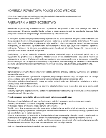 KOMENDA POWIATOWA POLICJI ŁÓDŹ-WSCHÓD Źródło: http://www.lodz-wschod.policja.gov.pl/elw/informacje/9121,Fajerwerki-a-bezpieczenstwo.html Wygenerowano: Poniedziałek, 6 marca 2017, 21:52 FAJERWERKI A BEZPIECZEŃSTWO Nadchodzi najbardziej oczekiwana noc - Sylwester. Większość z nas chce przeżyć ten czas w niezapomniany i huczny sposób. Warto jednak w czasie przygotowań do powitania Nowego Roku pomyśleć o zasadach bezpiecznego obchodzenia się z fajerwerkami. W jedną noc sylwestrową odpalamy więcej fajerwerków niż przez cały rok. W tym czasie na terenie Unii Europejskiej dochodzi do kilkuset poparzeń, zranień i pożarów, a nawet wypadków śmiertelnych. Przyczyną większości jest niewłaściwe użytkowanie fajerwerków i nieprzestrzeganie zasad bezpieczeństwa. Pamiętajmy, że fajerwerki są materiałami wybuchowymi i muszą być używane ostrożnie i zgodnie z instrukcją. Policjanci na bieżąco sprawdzają punkty handlowe oferujące fajerwerki i interweniują w sytuacjach naruszania zakazu ich używania. Pamiętajmy, że prawo zakazuje używania wyrobów pirotechnicznych w miejscach publicznych, za wyjątkiem 31 grudnia oraz 1 stycznia. Przedwczesne próby pirotechniczne i odpalanie resztek są niedozwolone prawem. W większości gmin wprowadzono okresowe ograniczenia w stosowaniu materiałów pirotechnicznych. W szczególnie uzasadnionych wypadkach, w okresie objętym zakazem ich stosowania, zgodę na używanie materiałów pirotechnicznych wydaje właściwy wójt, burmistrz, prezydent miasta. Pamiętajmy: Ograniczenia w używaniu fajerwerków wprowadzają zarówno przepisy kodeksu wykroczeń, jak i przepisy prawa miejscowego. Sprzedaż niepełnoletnim fajerwerków lub petard jest przestępstwem i każdy, kto dopuszcza się takiego czynu, podlega karze grzywny, ograniczenia wolności albo pozbawienia wolności do lat 2; Informujmy policję o handlowcach, którzy sprzedają petardy dzieciom. Uchroni to najmłodszych, którzy często padają ofiarami fajerwerków; Pod żadnym pozorem fajerwerków nie powinny odpalać dzieci, które muszą być pod stałą opieką osób dorosłych; Kupujmy fajerwerki u sprawdzonych, rzetelnych sprzedawców i stosujmy się do instrukcji zamieszczonych na opakowaniach fajerwerków; Przed zakupem materiałów pirotechnicznych należy sprawdzić, czy: Obudowa nie posiada żadnych wad mechanicznych: pęknięć, przerwań, wgnieceń czy wybrzuszeń; Elementy składowe są dobrze ze sobą połączone i nie przesuwają się; Podana jest nazwa producenta wraz z danymi adresowymi; Wyrób, który jest przeznaczony do pionowego ustawienia na podłożu lub wkopania w ziemię, jest wyposażony w oprzyrządowanie, pozwalające na właściwe ustawienie w sposób wykluczający przewrócenie lub przechylenie się w trakcie działania; Petarda przeznaczona do trzymania w dłoni posiada uchwyt zapewniający bezpieczne utrzymanie podczas palenia (nigdy nie próbujmy odpalać z dłoni nieprzeznaczonych do tego środków pirotechnicznych!); Dołączona jest instrukcja obsługi w języku polskim, zawierająca co najmniej: informację dotyczącą sposobu odpalenia oraz ostrzeżenia dotyczące bezpieczeństwa podczas użytkowania; Podczas używania wyrobów pirotechnicznych pamiętajmy: Wyroby pirotechniczne i ich odpalanie to niebezpieczna zabawa, dlatego wolno je odpalać wyłącznie pod nadzorem dorosłych; Należy czytać instrukcje, bezwzględnie przestrzegać zaleceń producenta i zwrócić uwagę na ostrzeżenia. Wybuchająca nagle petarda nie tylko może spowodować oparzenia rąk i twarzy, ale także poważniejsze uszkodzenia ciała, np. utratę wzroku, palców lub całej ręki; Korzystając z fajerwerków należy wybrać miejsce, w którym nie zrobimy nikomu krzywdy i niczego nie zniszczymy. Sprawdźmy, czy na drodze ładunku nie znajdują się drzewa lub linie energetyczne. W pomieszczeniach zamkniętych oraz w pobliżu obiektów mogących być narażonych na pożar nie wolno używać wyrobów pirotechnicznych; Zachowajmy bezpieczną odległość – jest ona podana w instrukcji obsługi. Nigdy nie pochylajmy się nad ładunkiem - stańmy z boku i trzymajmy źródło ognia w wyciągniętej ręce; W stanie nietrzeźwym oraz w okolicznościach mogących narazić innych na niebezpieczeństwo nie odpalajmy petard; Jeśli po odpaleniu fajerwerku lub wypaleniu lontu okaże się, że nie eksplodował, nie podchodźmy, aby sprawdzić, co się stało; Huk petard niepokoi zwierzęta, szczególnie psy. Zadbajmy wiec, by nasze czworonogi nie zakłócały spokoju innym i nie były narażone na odgłosy wybuchów; Gdy doszło do wypadku, wezwijmy służby ratownicze: straż pożarną, pogotowie. Petardy, rakiety, pochodnie, rzymskie ognie są nieodłącznymi elementami sylwestrowej zabawy. Pamiętajmy aby kupować je w sposób przemyślany, zgodnie z zasadami zdrowego rozsądku! ZADBAJMY WSPÓLNIE O TO, ABY KONIEC STAREGO I POCZĄTEK NOWEGO ROKU BYŁ DLA NAS WSZYSTKICH MIŁY I BEZPIECZNY. (KGP/mw) foto. KPP Proszowice Ocena: 0/5 (0) Tweetnij