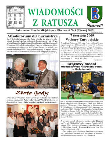 WIADOMOŚCI Z RATUSZA Informator Urzędu Miejskiego w Blachowni Nr 4 (63) maj 2009 ISSN 1730-9190 Absolutorium dla burmistrza Do 30 kwietnia każdego roku Rada Miejska ma ustawowy obowiązek dokonać analizy wykonania budżetu gminy za rok poprzedni i udzielić, bądź nie udzielić, absolutorium burmistrzowi. 29 kwietnia 2009 odbyła się Sesja Rady Miejskiej w Blachowni. Głównym tematem porządku obrad Sesji było przyjęcie sprawozdania z wykonania budżetu za 2008 r oraz podjęcie uchwały w sprawie udzielenia absolutorium Burmistrzowi Blachowni Zdzisławowi Nowakowi. dokończenie na str. 3 7 czerwca 2009 Wybory Europejskie W niedzielę, 7 czerwca 2009 roku, Polacy wybiorą 50 eurodeputowanych, a w 27 krajach UE w sumie 736 posłów do Parlamentu Europejskiego zostanie wybranych pomiędzy 4 a 7 czerwca 2009. Liczba ta została określona przez Traktat Nicejski. Obecnie polskich obywateli w Brukseli reprezentuje 54 posłów. W Polsce, zasady przeprowadzania wyborów do Parlamentu Europejskiego reguluje ustawa z dnia 23 stycznia 2004 roku - Ordynacja wyborcza do Parlamentu Europejskiego (Dz. U. Nr 25, poz. 219). więcej na str. 4 Brązowy medal Młodzieżowych Mistrzostw Polski w Badmintonie W imieniu mieszkańców gratulacje złożyła p. Wanda Ścieburowa Złote Gody 29 kwietnia w Urzędzie Stanu Cywilnego w Blachowni odbyła się doniosła uroczystość. Państwo Krystyna i Witold Czechowie obchodzili Złote Gody - 50 lat wspólnego pożycia małżeńskiego. Od 24 do 26 kwietnia Hala Polonia w Częstochowie była areną Młodzieżowych Mistrzostw Polski oraz Indywidualnych Mistrzostw Polski Juniorów w Badmintonie. W Młodzieżowych Mistrzostwach Polski startowała zawodniczka MKS „Dwójka” Blachownia, Paulina Gajos. Wspólnie z Joanną Stobiecką (Orlicz Suchedniów) wywalczyła brązowy medal w grze podwójnej kobiet. Medal Pauliny jest szesnastym w historii klubu medalem Mistrzostw Polski. Z tej okazji zostali odznaczeni medalem „Za Długoletnie Pożycie Małżeńskie” nadanym przez Prezydenta R P. Medale i listy gratulacyjne Szanownym Jubilatom wręczył Zdzisław Nowak – Burmistrz Blachowni oraz Olga Gębuś - Kierownik USC Z tak pięknej okazji dostojnym Jubilatom wyrazy uznania i głębokiego szacunku oraz doczekania w dostatku i zdrowiu diamentowych godów życzy Redakcja. Zapisane przez historiç Wieża na 100 lat 6 maja 2009 Wspaniały prezent na setne urodziny ufundowała sobie parafia w Blachowni. 6 maja na kościele p.w. Najświętszej Maryi Panny Królowej Polski pojawiła się nowa wieża z krzyżem. Poprzednia runęła 15 sierpnia 2008r. Wichura, która przeszła nad Blachownią, wyrządziła wtedy ogromne szkody, które widać do tej pory. 15 sierpnia 2008 Teraz można powiedzieć, że w najnowszych kartach historii naszej gminy zapisał się także ksiądz arcybiskup Stanisław Nowak. Metropolita Częstochowski, który wczesnym rankiem 6 maja przyjechał do Blachowni, by poświęcić nowe zwieńczenie świątyni. Ks. arcybiskup kościół w Blachowni podniósł do godności fary, czyli głównej świątyni na danym terenie. Warto wiedzieć 7 maja 2009 Siedmiometrowa wieża, wykonana z drzewa modrzewiowego, została obita blachą z miedzi. Zupełnie nowy metalowy krzyż z promieniami mosiężnymi ma 3 metry wysokości. W porównaniu do poprzedniej kopuły, na nowej, pojawił się dodatkowy element - korona pod krzyżem, którą dobrze widać szczególnie w promieniach słonecznych. Blaskiem też świeci pozłacana kula, do której ksiądz Andrzej Walaszczyk miejscowy proboszcz włożył kartę z opisem wydarzeń od 15 sierpnia 2008 roku do 6 maja 2009 oraz dwie gazety - Katolicki Tygodnika „Niedziela” z 3 maja i majowy miesięcznik „Michael”. Wieża , razem z czasopismami, waży 2 tony 20 kg zaś krzyż ponad 200 kg. Kościół w Blachowni mierzy 43 metry wysokości. Marek Kułakowski Tu się narodzi stadion Takie przypuszczenia robili Blachowianie zainteresowani sportem już na początku lat 50-tych. Nieckowate wyrobisko piaskowe pod lasem aż samo prosiło się o to! Dziś mamy już to co mamy, a co będziemy jeszcze mieć, to w głowie się nie mieści! Przyszłym Olimpijczykom, wyrosłym na nowoczesnym stadionie w mieście Blachownia już w roku 2009 autor powyższego tekstu dedykuje fraszkę: 2 WIA DO MO ŚCI Z RATUSZA Na sportowców. Niech ich zdobi Listek bobi! Lucjan Matysiak Blachownia - Nr 4 maj 2009 Absolutorium dla burmistrza dokończenie ze str. 1 Regionalna Izba Obrachunkowa pozytywnie zaopiniowała sprawozdanie z wykonania budżetu oraz wniosek komisji rewizyjnej o udzielenie absolutorium. Opinie pozytywne wyraziły też wszystkie komisje stałe Rady. „Realizacja budżetu za 2008 rok przedstawia się następująco: Dochody ogółem 29.830.393zł, t.j.93,9% planu, wydatki ogółem 30.951.257zł,tj 91,5% planu. (...) Wynik budżetu osiągnięty w 2008 roku jest dodatni i wynosi 1.120.864zł, lecz niższy jest niż planowano” - czytamy w Uchwale VII Składu Orzekającego RIO w Katowicach. Ocenę realizacji wykonanych zadań inwestycyjnych w Gminie Blachownia w 2008 roku w imieniu Komisji Rewizyjnej Rady przedstawił jej przewodniczący Marek Kułakowski: „W omawianym budżecie należy wspomnieć szczegółowo o skutkach finansowych jakie spowodowała wichura, która dotknęła Gminę Blachownia 15 sierpnia 2008 roku. Gmina musiała szybko się uporać z usunięciem gruzu, drzew, gałęzi, remontem uszkodzonych budynków. Na zadania zlecone, czyli z pomocy rządowej i Urzędu Marszałkowskiego w Katowicach na pomoc: dla poszkodowanych gospodarstw rolnych, zasiłki celowe i świadczenia na odbudowę budynków mieszkalnych zgodnie z kosztorysem rzeczoznawców, Gmina w sumie otrzymała 3.800.120, 65 zł. Zadania własne Gminy czyli zasiłki celowe dla poszkodowanych pochłonęły kwotę 122.000, 00 zł. Pomoc z innych jednostek samorządu terytorialnego z przeznaczeniem dla poszkodowanych oraz darowizny pieniędzy wyniosła 24.384, 