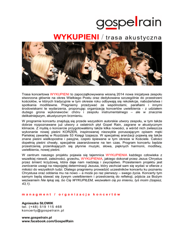 WYKUPIENI / tr asa ak us tyczna Trasa koncertowa WYKUPIENI to zapoczątkowywana wiosną 2014 nowa inicjatywa zespołu stworzona głównie na okres Wielkiego Postu oraz dedykowana szczególnie do przestrzeni kościołów, w których tradycyjnie w tym okresie roku odbywają się rekolekcje, naboŜeństwa i spotkania modlitewne. Pragniemy przeŜywać ze wspólnotami, parafiami i innymi środowiskami te wydarzenia, proponując organizację koncertów uwielbienia - z udziałem duŜego grona wykonawców: chóru i zespołu instrumentalnego – ale w znacznie delikatniejszym, akustycznym brzmieniu. W programie koncertu znajdują się przede wszystkim autorskie utwory zespołu, w tym takŜe dobrze rozpoznawane juŜ utwory z ostatnich płyt Gopel Rain, zagrane w akustycznym klimacie. Z myślą o koncercie przygotowaliśmy takŜe kilka nowości, a wśród nich zwłaszcza wykonanie nowej pieśni KORZEŃ, inspirowanej niezwykle poruszającym opisem męki Pańskiej zawartej w Rozdziale 53 Księgi Izajasza. W specjalnej aranŜacji pojawią się takŜe znane pieśni wielkopostne i pasyjne, często śpiewane w tym okresie w Kościele. Całości dopełnią pieśni chwały, specjalnie zaaranŜowane na ten czas. Program koncertu będzie przestrzenią przenikających się płynnie muzyki, słowa, pięknych harmonii, modlitwy, uwielbienia, nowej pieśni. W centrum naszego projektu pojawia się tajemnica WYKUPIENIA kaŜdego człowieka z wszelkiej niewoli, zaleŜności, grzechu, WYKUPIENIA, jakiego dokonał przez Jezus Chrystus przez śmierć krzyŜową, która daje nam nadzieję i zwycięstwo. Przesłaniem projektu jest zwrócenie uwagi na niepojętej determinacji Jezusa, który zechciał sam się wydać w ofierze z miłości do wszystkich ludzi. Dlatego pragniemy prowadzić uczestników koncertu ku poznaniu Chrystusa oraz oddania mu na nowo – a moŜe po raz pierwszy – swego Ŝycia. Koncerty tym samym będą stawać się Ŝywym uwielbieniem i przestrzenią do refleksji, pójścia za BoŜym wezwaniem Nie lękaj się, bo Cię WYKUPIŁEM, wezwałem cię po imieniu, tyś moim (Izajasz, 43,1). managment / organizacja koncertów Agnieszka SŁOWIK tel. (+48) 519 115 468 [email protected] www.gospelrain.pl www.facebook.com/GospelRain