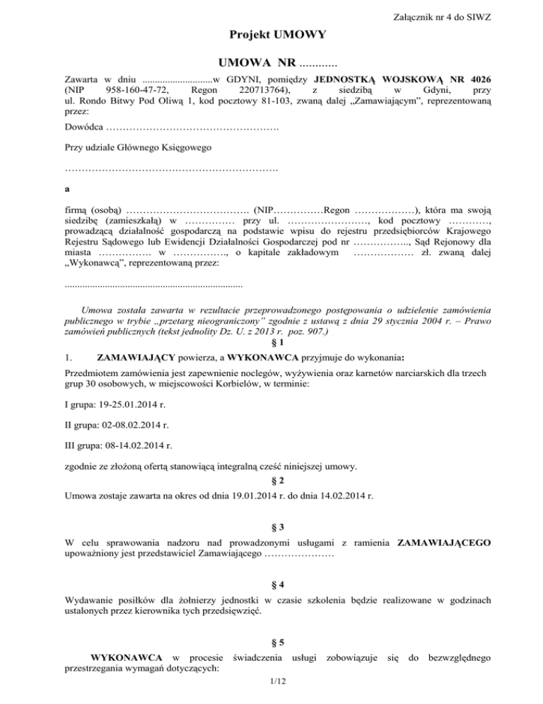 Załącznik nr 4 do SIWZ Projekt UMOWY UMOWA NR ............ Zawarta w dniu ............................w GDYNI, pomiędzy JEDNOSTKĄ WOJSKOWĄ NR 4026 (NIP 958-160-47-72, Regon 220713764), z siedzibą w Gdyni, przy ul. Rondo Bitwy Pod Oliwą 1, kod pocztowy 81-103, zwaną dalej „Zamawiającym”, reprezentowaną przez: Dowódca ……………………………………………. Przy udziale Głównego Księgowego ………………………………………………………. a firmą (osobą) ………………………………. (NIP……………Regon ………………), która ma swoją siedzibę (zamieszkałą) w …………… przy ul. ……………………, kod pocztowy …………, prowadzącą działalność gospodarczą na podstawie wpisu do rejestru przedsiębiorców Krajowego Rejestru Sądowego lub Ewidencji Działalności Gospodarczej pod nr …………….., Sąd Rejonowy dla miasta ……………. w ……………., o kapitale zakładowym ……………… zł. zwaną dalej „Wykonawcą”, reprezentowaną przez: ....................................................................... Umowa została zawarta w rezultacie przeprowadzonego postępowania o udzielenie zamówienia publicznego w trybie „przetarg nieograniczony” zgodnie z ustawą z dnia 29 stycznia 2004 r. – Prawo zamówień publicznych (tekst jednolity Dz. U. z 2013 r. poz. 907.) §1 1. ZAMAWIAJĄCY powierza, a WYKONAWCA przyjmuje do wykonania: Przedmiotem zamówienia jest zapewnienie noclegów, wyżywienia oraz karnetów narciarskich dla trzech grup 30 osobowych, w miejscowości Korbielów, w terminie: I grupa: 19-25.01.2014 r. II grupa: 02-08.02.2014 r. III grupa: 08-14.02.2014 r. zgodnie ze złożoną ofertą stanowiącą integralną cześć niniejszej umowy. §2 Umowa zostaje zawarta na okres od dnia 19.01.2014 r. do dnia 14.02.2014 r. §3 W celu sprawowania nadzoru nad prowadzonymi usługami z ramienia ZAMAWIAJĄCEGO upoważniony jest przedstawiciel Zamawiającego ………………… §4 Wydawanie posiłków dla żołnierzy jednostki w czasie szkolenia będzie realizowane w godzinach ustalonych przez kierownika tych przedsięwzięć. §5 WYKONAWCA w procesie świadczenia usługi zobowiązuje się do bezwzględnego przestrzegania wymagań dotyczących: 1/12 Załącznik nr 4 do SIWZ Projekt UMOWY 1. Jakości i organizacji żywienia określonych w załączniku 1 do umowy. 2. Parametrów energetyczno - odżywczych dziennych posiłków określonych w załączniku 2 do umowy. 3. Wielkości potraw i napojów określonych w załączniku 3 do umowy. 4. Utrzymania stanu sanitarnohigienicznego i higieny żywienia określonych w załączniku 4 do umowy. §6 1. Całkowite wynagrodzenie WYKONAWCY z tytułu realizacji niniejszej umowy wyniesie …………….. PLN brutto (słownie: ………………………… PLN 00/100), z zastrzeżeniem ust. 2, przy przyjęciu następującego podziału: I grupa: 19-25.01.2014 r. …………….. PLN brutto (słownie: ………………………… PLN 00/100). II grupa: 02-08.02.2014 r. …………….. PLN brutto (słownie: ………………………… PLN 00/100). III grupa: 08-14.02.2014 r. …………….. PLN brutto (słownie: ………………………… PLN 00/100). 2. W przypadku, gdy na terenie miejscowości Korbielów – Pilsko na wszystkich dostępnych trasach wyciągi zostaną zamknięte ze względu na złe warunki śniegowe, wynagrodzenie WYKONAWCY zostanie pomniejszone o 1/6 ceny wszystkich niewykorzystanych danego dnia karnetów za każdy dzień zamknięcia wyciągów. Cena karnetu określona zostaje na podstawie ofert stanowiącej integralną część niniejszej umowy. 3. Żywienie stanów osobowych realizowane będzie przez WYKONAWCĘ według dziennej stawki pieniężnej dla zasadniczej normy szkolnej 020 określonej w rozporządzeniu MON z dnia 11 grudnia 2009 r. w sprawie bezpłatnego wyżywienia żołnierzy zawodowych i kandydatów na żołnierzy zawodowych (Dz. U. Nr 216 poz. 1679), powiększonej o (%) narzutu obejmującego usługę oraz podatek VAT : Stawka ta odnosi się do poszczególnych posiłków, odpowiednio: Śniadanie 30% Obiadokolacja 70% §7 1. Zapłata należności za wykonanie usługi nastąpi w formie plecenia przelewu z rachunku ZAMAWIAJĄCEGO na rachunek WYKONAWCY umieszczony na fakturze. Faktury będą wystawiane każdorazowo po zakończeniu pobytu każdej z grup i płatne przelewem w terminie 21 dni licząc od daty otrzymania oryginału faktury przez ZAMAWIAJĄCEGO. W przypadku, gdy termin płatności upływa w dniu ustawowo wolnym od pracy przyjmuje się, że będzie on zachowany, jeżeli zapłata faktury nastąpi w pierwszym dniu roboczym. 2. Za dzień zapłaty przyjmuje się datę obciążenia rachunku bankowego ZAMAWIAJĄCEGO. §8 1. ZAMAWIAJĄCY będzie stosował kary umowne w stosunku do WYKONAWCY – w przypadkach: 1) Niedotrzymania ustalonych godzin przygotowania i wydawania posiłków. Przez niedotrzymanie ustalonej godziny przygotowania i wydawania posiłku ZAMAWIAJĄCY rozumie opóźnienie w rozpoczęciu pracy bufetu, opóźnienie w rozpoczęciu wydawania posiłków żołnierzom przekraczające 1 godzinę od ustalonej zgodnie z § 4 umowy; 2) Niezgodności potraw z jadłospisem, chyba że zmiana w jadłospisie będzie dokonana w porozumieniu z ZAMAWIAJĄCYM; 2/12 Załącznik nr 4 do SIWZ Projekt UMOWY 3) Zaniżenia wagi (wielkości) potraw – dotyczy to także zaniżenia parametrów energetycznych i odżywczych; 4) Nieodpowiednich walorów organoleptycznych posiłków; 5) Zaniedbań w stanie sanitarnohigienicznym pomieszczeń i w higienie żywienia (nieprzestrzegania zasad dobrej praktyki higienicznej i produkcyjnej – GHP i GMP). 2. Kary będą naliczane każdorazowo w w/w przypadkach w wysokości 5 % wartości całości umowy wskazanej w § 6. 3. Zamawiający zastrzega sobie prawo potrącenia naliczonych kar umownych z przysługującego Wykonawcy wynagrodzenia. 4. Strony zastrzegają sobie dochodze