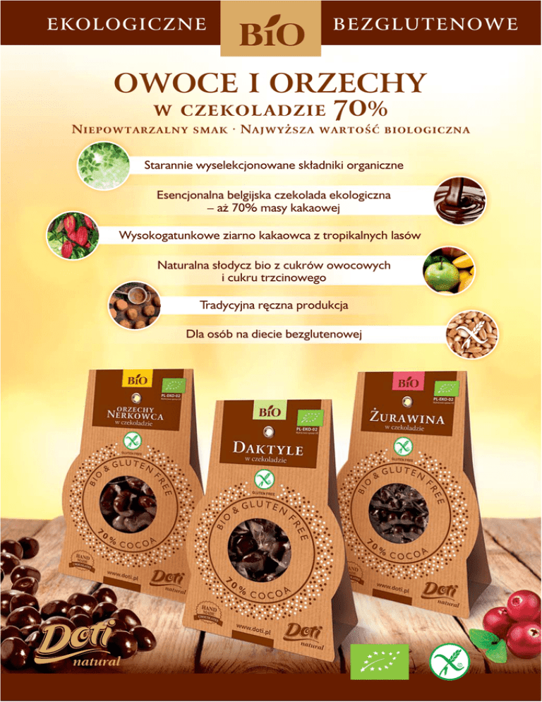 ekologiczne bezglutenowe OWOCE I ORZECHY w czekoladzie 70% Niepowtarzalny smak · Najwyższa wartość biologiczna Starannie wyselekcjonowane składniki organiczne Esencjonalna belgijska czekolada ekologiczna – aż 70% masy kakaowej Wysokogatunkowe ziarno kakaowca z tropikalnych lasów Naturalna słodycz bio z cukrów owocowych i cukru trzcinowego Tradycyjna ręczna produkcja Dla osób na diecie bezglutenowej natural Polecamy pyszne czekoladki BIO BEZ GLUTENU Orzechy nerkowca (60 g) Daktyle Surowe ziarna kakaowe (50 g) Banan (70 g) (60 g) Figi Imbir (60 g) (60 g) Żurawina (60 g) Migdały (50 g) W ofercie dostępna jest rownież BIO Kawa (50 g) Jednostka sprzedażowa: KARTON 12 sztuk. W sprzedaży także pakiet mieszany. Polecamy także czekoladki BEZGLUTENOWE i BEZCUKROWE HAN MA D natural DOTI Sp.J. MANUFAKTURA, D.M. Mroczkowscy ul. Starowiejska 39 · 55-080 Smolec k/ Wrocławia Tel. (+48) 71 316 84 53 · email: [email protected] · [email protected] · www.doti.pl DE