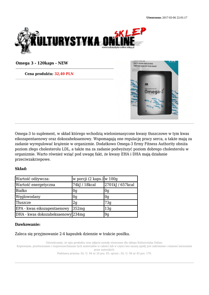 Utworzono: 2017-03-06 22:01:17 Omega 3 - 120kaps - NEW Cena produktu: 32,40 PLN Omega-3 to suplement, w skład którego wchodzią wielonienasycone kwasy tłuszczowe w tym kwas eikozapentaenowy oraz dokozaheksaenowy. Wspomagają one regulację pracy serca, a także mają za zadanie wyregulować krążenie w organizmie. Dodatkowo Omega-3 firmy Fitness Authority obniża poziom złego cholesterolu LDL, a także ma za zadanie podwyższyć poziom dobrego cholesterolu w organizmie. Warto również wziąć pod uwagę fakt, że kwasy EHA i DHA mają działanie przeciwzakrzepowe. Skład: Wartość odżywcza: w porcji (2 kaps.) w 100g Wartość energetyczna 74kJ / 18kcal 2701kJ / 657kcal Białko 0g 0g Węglowodany 0g 0g Tłuszcze 2g 73g EPA - kwas eikozapentaenowy 352mg 13g DHA - kwas dokozaheksaenowy 234mg 9g Dawkowanie: Zaleca się przyjmowanie 2-4 kapsułek dziennie w trakcie posiłku. Oświadczamy, że opis produktu oraz zdjęcia zostały stworzone dla sklepu Kulturystyka Online. Kopiowanie, przetwarzanie i rozpowszechnianie tych materiałów w całości lub w części bez naszej zgody jest zabronione i stanowi naruszenie praw autorskich. Podstawa prawna: Dz. U. 94 nr 24 poz. 83, sprost.: Dz. U. 94 nr 43 poz. 170. Adres: http://www.ko.sklep.pl/ Telefon: kom. 782 010 880 Email: [email protected]