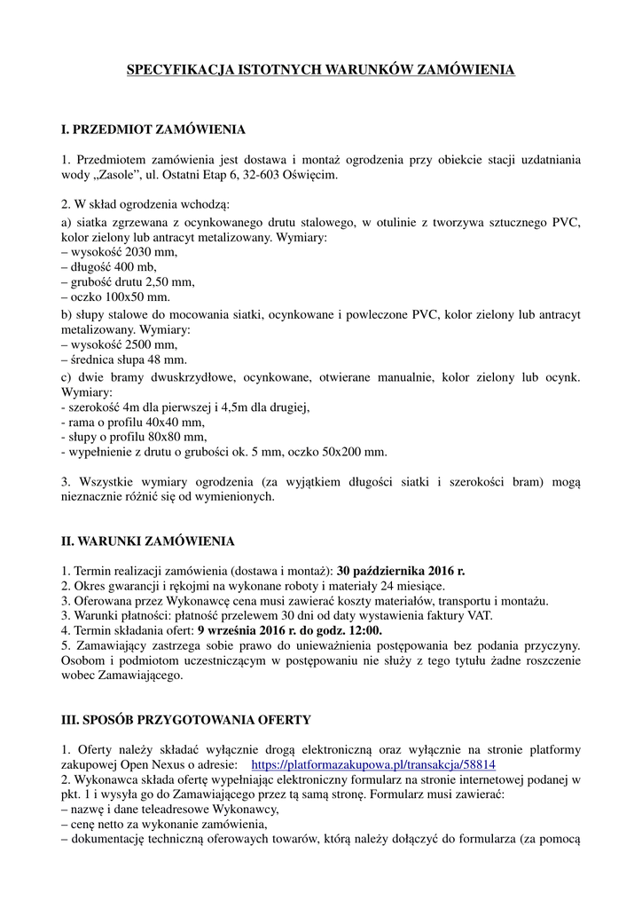 SPECYFIKACJA ISTOTNYCH WARUNKÓW ZAMÓWIENIA I. PRZEDMIOT ZAMÓWIENIA 1. Przedmiotem zamówienia jest dostawa i montaż ogrodzenia przy obiekcie stacji uzdatniania wody „Zasole”, ul. Ostatni Etap 6, 32-603 Oświęcim. 2. W skład ogrodzenia wchodzą: a) siatka zgrzewana z ocynkowanego drutu stalowego, w otulinie z tworzywa sztucznego PVC, kolor zielony lub antracyt metalizowany. Wymiary: – wysokość 2030 mm, – długość 400 mb, – grubość drutu 2,50 mm, – oczko 100x50 mm. b) słupy stalowe do mocowania siatki, ocynkowane i powleczone PVC, kolor zielony lub antracyt metalizowany. Wymiary: – wysokość 2500 mm, – średnica słupa 48 mm. c) dwie bramy dwuskrzydłowe, ocynkowane, otwierane manualnie, kolor zielony lub ocynk. Wymiary: - szerokość 4m dla pierwszej i 4,5m dla drugiej, - rama o profilu 40x40 mm, - słupy o profilu 80x80 mm, - wypełnienie z drutu o grubości ok. 5 mm, oczko 50x200 mm. 3. Wszystkie wymiary ogrodzenia (za wyjątkiem długości siatki i szerokości bram) mogą nieznacznie różnić się od wymienionych. II. WARUNKI ZAMÓWIENIA 1. Termin realizacji zamówienia (dostawa i montaż): 30 października 2016 r. 2. Okres gwarancji i rękojmi na wykonane roboty i materiały 24 miesiące. 3. Oferowana przez Wykonawcę cena musi zawierać koszty materiałów, transportu i montażu. 3. Warunki płatności: płatność przelewem 30 dni od daty wystawienia faktury VAT. 4. Termin składania ofert: 9 września 2016 r. do godz. 12:00. 5. Zamawiający zastrzega sobie prawo do unieważnienia postępowania bez podania przyczyny. Osobom i podmiotom uczestniczącym w postępowaniu nie służy z tego tytułu żadne roszczenie wobec Zamawiającego. III. SPOSÓB PRZYGOTOWANIA OFERTY 1. Oferty należy składać wyłącznie drogą elektroniczną oraz wyłącznie na stronie platformy zakupowej Open Nexus o adresie: https://platformazakupowa.pl/transakcja/58814 2. Wykonawca składa ofertę wypełniając elektroniczny formularz na stronie internetowej podanej w pkt. 1 i wysyła go do Zamawiającego przez tą samą stronę. Formularz musi zawierać: – nazwę i dane teleadresowe Wykonawcy, – cenę netto za wykonanie zamówienia, – dokumentację techniczną oferowaych towarów, którą należy dołączyć do formularza (za pomocą przycisku "spinacza"). 3. W przypadku problemów związanych z wypełnianiem formularza, załączaniem dokumentów bądź wysyłaniem oferty należy kontaktować się bezpośrednio z Centrum Wsparcia Klienta platformy Open Nexus - tel. 61 646 00 24. 4. Zamawiający zaleca Wykonawcom rejestrację na Platformie Zakupowej w celu ułatwienia procedury ofertowania w razie przyszłych zamówień. Za rejestrację nie są pobierane opłaty. 5. Rejestracja na Platformie Zakupowej nie jest wymagana do złożenia oferty. 6. Oferty złożone drogą listowną lub na adres e-mail Zamawiającego zostaną odrzucone. IV. UDZIELANIE WYJAŚNIEŃ: – pytania odnośnie procedury ofertowania na platformie zakupowej należy kierować do: Centrum Wsparcia Klienta platformy Open Nexus tel. 61 646 00 24 – pytania o szczegóły technicze dot. zamawianych towarów: Łukasz Zeman, tel. 603-888-695 (w godz. 7-15).