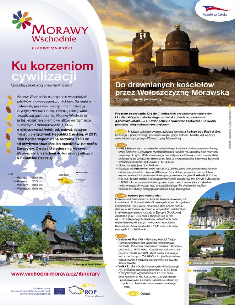 czar rozmanitości Ku korzeniom Specjalny pakiet programów turystycznych Morawy Wschodnie są regionem wspaniałych zabytków i nowoczesnej architektury. Są regionem uzdrowisk, gór i malowniczych nizin. Oferują turystykę zimową i letnią. Oferują folklor, wino i wyjątkową gastronomię. Morawy Wschodnie są też jednak regionem o wyjątkowym rozmiarze duchowym. Przecież właśnie celu, w miejscowości Velehrad, najważniejszym miejscu pielgrzymek Republiki Czeskiej, w 2013 roku będzie wspominana rocznica 1150 lat od przybycia słowiańskich apostołów, patronów Europy św. Cyryla i Metodego na Morawy. Wybierz się ich śladami do korzeni cywilizacji w Republice Czeskiej! Zlín → Praha → Krakow → Wroclaw → Warszawa Wroclaw 300 km 270 km 300 km 500 km Praha Zlín Warszawa Krakow Do drewnianych kościołów przez Wołoszczyznę Morawską 5 dniowy program poznawczy Program poprowadzi Cię do 7 wołoskich drewnianych kościołów i kaplic, których historia sięga ponad 4 stulecia w przeszłość. 4 rzymskokatolickie i 3 ewangelickie świątynie zachwycą Cię swoją prostotą i niepowtarzalnym pięknem. 1. dzień Przyjazd, zakwaterowanie, zwiedzanie miasta Rožnov pod Radhoštěm, leżącego u południowego podnóża świętej góry Radhošť. Miasto jest ważnym ośrodkiem turystycznym Wołoszczyzny Morawskiej. 2. dzień • Velké Karlovice – zwiedzanie karlovickiego kościoła pod wezwaniem Panny Marii Śnieżnej. Drewniany rzymskokatolicki kościół ma unikalny plan równoramiennego krzyża. Wybudowano go bez jedynej metalowej części a wszystkie połączenia są wyłącznie drewniane. Jest to monumentalna barokowa budowla wołoskiej architektury ludowej z 1754 roku. • Obiad ze specjałami wołoskimi. • Przejazd na Pustevny (1095 m n.p.m.). Zwiedzanie unikalnych drewnianych schronisk górskich z końca XIX wieku. Przy dobrej pogodzie piesza łatwa wycieczka (tam i z powrotem 8 km) po grzebieniu na górę Radhošt (1129 m n.p.m.). Tu stoi rzeźba i kaplica słowiańskich apostołów św. Cyryla i Metodego z 1898 roku w romańsko-bizantyjskim stylu. Jest to pamiątka ich działalności w czasach wczesnego chrześcijaństwa. Po drodze do kaplicy miniesz też słynny posąg pogańskiego boga Radegasta. 3. dzień Rožnov pod Radhoštěm Rožnov pod Radhoštěm chlubi się trzema drewnianymi kościołami. Rožnovski kościół ewangelicki jest budynkiem z bierwion z 1953 roku. Następne dwa kościoły znajdziemy w Wołoskim muzeum w przyrodzie, najstarszym i największym swego rodzaju w Europie Środkowej. Założono je w 1925 roku i znajduje się w nim ok. 100 zabytkowych obiektów, wśród nich dwie drewniane repliki starych wołoskich kościołów. Velké Karlovice Kościół św. Anny pochodzi z 1941 roku a kościół ewangelicki z 2009 roku. Rožnov pod Radhoštěm www.vychodni-morava.cz/itinerary 4. dzień • Valašské Meziříčí – Unikalny kościół Trójcy Przenajświętszej jest wczesnorenesansową budowlą. Pierwsza pisemna wzmianka o kościele pochodzi z 1605 roku. Kościół wybudowano za murami miasta a w XVII i XVIII wieku był kościołem cmentarnym. Od 1693 roku jest kościołem odpustowym z tradycją pielgrzymek na Święto Trójcy Świętej. • Velká Lhota – kościół ewangelicki (tolerancyjny), unikalna budowla z bierwion z 1783 roku z zabytkowym wyposażeniem z 1839 roku. Jest jedynym w RC kościołem z oryginalnymi podstawowymi cechami kościołów tolerancyj nych, tzn. ławki skupione wokół owalnego stołu. 5. dzień Odjazd. Valašské Meziříčí Velká Lhota Radhošť, kaplica św. Cyryla i Metodego cywilizacji www.vychodni-morava.cz Program jest poświęcony najcenniejszym zabytkom sakralnym i sanktuariom Moraw Wschodnich. Poza kilku wyjątkami chodzi o to najcenniejsze, co można zobaczyć nie tylko tu, ale przede wszystkim w całej Republice Czeskiej. Miejsca takie, jak Velehrad, Hostýn, Štípa, ale również Kroměříž, Uherský Brod, Modrá i inne, są dowodem siły duchowej i wyjątkowości tego kraju. Velehrad Magiczne miasta duchowe Moraw Wschodnich 5 dniowy program poznawczy 1. dzień Przyjazd, zakwaterowanie. 2. dzień • Svatý Hostýn (735 m n.p.m.) zwiedzanie najliczniej odwiedzanego sanktuarium mariackiego w RC. Dominantą jest bazylika Wniebowzięcia Svatý Hostýn Panny Marii, której kamień węgielny poświęcono w 1721 roku. Do latarni Moraw, jak nazywa się świątynię, prowadzą schody, które zaczynają się przy kaplicy wodnej, gdzie bije cudowne źródełko. Schody, do których są wykute nazwiska darczyńców, mają długość 250 m i liczą 250 stopni. Cennym zabytkiem jest też unikalna hostýnska Droga krzyżowa autorstwa architekta Dušana Jurkoviča. W areale odwiedzisz też Svatohostýnskie muzeum i wieżę widokową z 1898 roku. • Holešov – zwiedzanie synagogi rabina Szacha i cmentarza żydowskiego, które należą do najstarszych, najcenniejszych i najlepiej zachowanych zabytków żydowskich w Republice Czeskiej. • Kroměříž – zwiedzanie miasta, letniej siedziby biskupów i arcybiskupów ołomunieckich, pełne cennej architektury miejskiej, zbiorów dzieł sztuki, z unikalnymi ogrodami i pałacem, które od 1998 roku są na Liście zabytków UNESCO. Gotycki kościół św. Maurycego, którego budowę rozpoczęto w 1260 roku, był w czasach swojego powstania największym kościołem na Morawach. Kościół św. Jana Chrzciciela należy do barokowych klejnotów Moraw, kościół Wniebowzięcia Panny Marii i prawosławny kościół św. Cyryla i Metodego. Pod wieczór zwiedzanie pałacowych piwnic winnych (zał. w 1266 r.) połączone z degustacją win mszalnych, które są tu produkowane i które są dostarczane aż do Watykanu. 3. dzień • Provodov-Malenisko – kościół Panny Marii Śnieżnej na Malenisku u Provodova należy do najbardziej znanych morawskich miejsc odpustowych. Pierwsze wzmianki pochodzą z początku XVIII wieku i są związane ze źródłem cudownej wody. 
