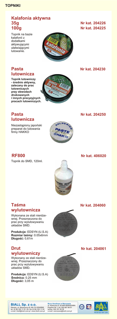 TOPNIKI Kalafonia aktywna 35g 100g Nr kat. 204226 Nr kat. 204225 Topnik na bazie kalafonii z dodatkami aktywuj¹cymi u³atwiaj¹cymi lutowanie. Pasta lutownicza Nr kat. 204230 Topnik lutowniczy - œrednio aktywny, zalecany do prac lutowniczych przy obwodach drukowanych i innych precyzyjnych pracach lutowniczych. Pasta lutownicza Nr kat. 204250 Niezast¹piony japoñski preparat do lutowania firmy HAKKO RF800 Nr kat. 406020 Topnik do SMD, 120ml. Taœma wylutownicza Nr kat. 204060 Wykonana ze stali nierdzewnej. Przeznaczona do prac przy wylutowywaniu uk³adów SMD. Produkcja: EDSYN (U.S.A) Rozmiar taœmy: 0.05x6mm D³ugoœæ: 0,61m Drut wylutowniczy Nr kat. 204061 Wykonany ze stali nierdzewnej. Przeznaczony do prac przy wylutowywaniu uk³adów SMD. Produkcja: EDSYN (U.S.A) Œrednica: 0.25 mm D³ugoœæ: 3,05 m BIALL Sp. z o.o. Otomin, ul. S³oneczna 43, 80-174 GDAÑSK tel. (0 58) 322 11 91, 92; fax (0 58) 322 11 93 e-mail: [email protected] www.biall.com.pl Biuro Handlowe w Warszawie ul. K³obucka 8, 02-699 WARSZAWA Pawilon Nr 1, tel. 022 607 98 01 tel/fax. 022 331 28 39 e-mail: [email protected] PN-EN ISO 9001:2001