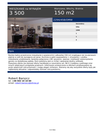 MIESZKANIE na WYNAJEM 3 500 Warszawa, Włochy, Bratnia 150 m2 2294/458/OMW Secondary Villa 1998 1 1 4 Opis Bardzo ładne przestronne mieszkanie o powierzchni całkowitej 150 m2 znajdujące sie na pierwszm piętrze w willi do wynajęcia od zaraz. Kuchnia w pełni wyposażona + zmywarka + pralka, mieszkanie umeblowane, łazienka połączona z WC (prysznic, wanna), możliwość wykorzystania garażu za dodatkową opłatą. Dom położony jest w cichej i spokojnej okolicy willowej. Powyższa oferta nie stanowi oferty handlowej w rozumieniu art. 66 § 1 kodeksu cywilnego oraz innych właściwych przepisów prawnych. Informacje umieszczone w ofertach przekazywane są przez właścicieli nieruchomości i mogą ulegać zmianom. Staramy się aby wszystkie oferty były jak najbardziej aktualne i odpowiadały stanowi rzeczywistemu. Robert Barszcz tel. +48 502 10 10 60 email: [email protected] O-H REA Powered by TCPDF (www.tcpdf.org)
