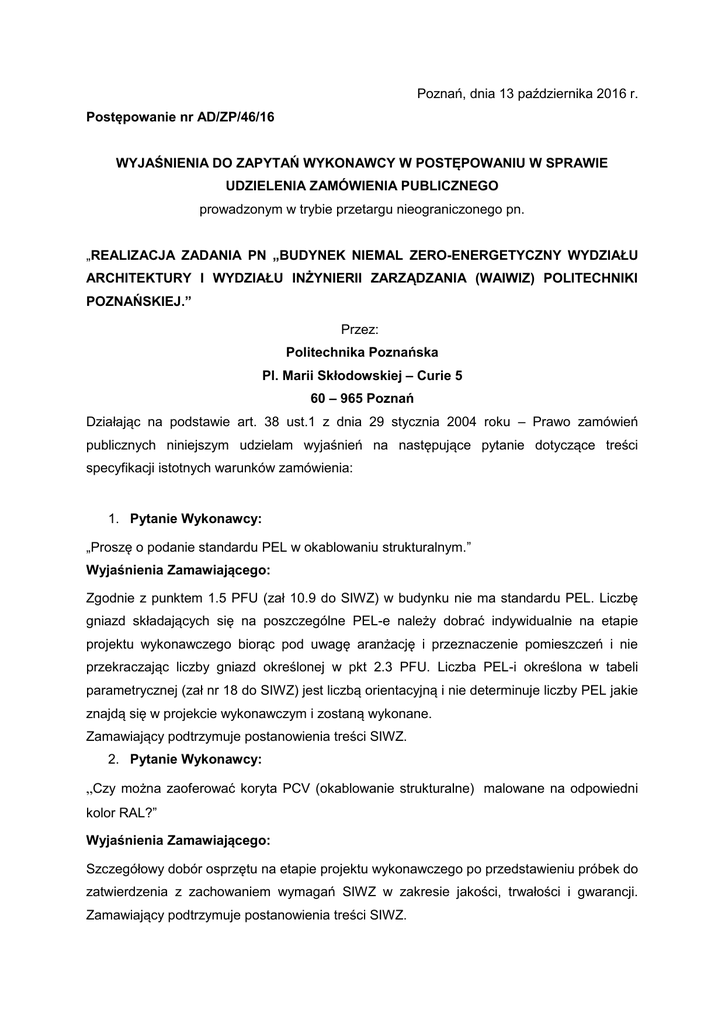 Poznań, dnia 13 października 2016 r. Postępowanie nr AD/ZP/46/16 WYJAŚNIENIA DO ZAPYTAŃ WYKONAWCY W POSTĘPOWANIU W SPRAWIE UDZIELENIA ZAMÓWIENIA PUBLICZNEGO prowadzonym w trybie przetargu nieograniczonego pn. „REALIZACJA ZADANIA PN „BUDYNEK NIEMAL ZERO-ENERGETYCZNY WYDZIAŁU ARCHITEKTURY I WYDZIAŁU INŻYNIERII ZARZĄDZANIA (WAIWIZ) POLITECHNIKI POZNAŃSKIEJ.” Przez: Politechnika Poznańska Pl. Marii Skłodowskiej – Curie 5 60 – 965 Poznań Działając na podstawie art. 38 ust.1 z dnia 29 stycznia 2004 roku – Prawo zamówień publicznych niniejszym udzielam wyjaśnień na następujące pytanie dotyczące treści specyfikacji istotnych warunków zamówienia: 1. Pytanie Wykonawcy: „Proszę o podanie standardu PEL w okablowaniu strukturalnym.” Wyjaśnienia Zamawiającego: Zgodnie z punktem 1.5 PFU (zał 10.9 do SIWZ) w budynku nie ma standardu PEL. Liczbę gniazd składających się na poszczególne PEL-e należy dobrać indywidualnie na etapie projektu wykonawczego biorąc pod uwagę aranżację i przeznaczenie pomieszczeń i nie przekraczając liczby gniazd określonej w pkt 2.3 PFU. Liczba PEL-i określona w tabeli parametrycznej (zał nr 18 do SIWZ) jest liczbą orientacyjną i nie determinuje liczby PEL jakie znajdą się w projekcie wykonawczym i zostaną wykonane. Zamawiający podtrzymuje postanowienia treści SIWZ. 2. Pytanie Wykonawcy: „Czy można zaoferować koryta PCV (okablowanie strukturalne) malowane na odpowiedni kolor RAL?” Wyjaśnienia Zamawiającego: Szczegółowy dobór osprzętu na etapie projektu wykonawczego po przedstawieniu próbek do zatwierdzenia z zachowaniem wymagań SIWZ w zakresie jakości, trwałości i gwarancji. Zamawiający podtrzymuje postanowienia treści SIWZ. 3. Pytanie Wykonawcy: „Ze względu na zapis PFU: „W budynku przewidziany jest system zarządzania bezpieczeństwem. System należy zaprojektować i wykonać jako rozbudowa systemu eksploatowanego przez Politechnikę Poznańską w innych obiektach lub uwzględnić integrację z systemem eksploatowanym przez Politechnikę Poznańską”, proszę o podanie systemu, który jest wykorzystywany w PP z podaniem typu, wersji oprogramowania i możliwości rozbudowy systemu.” Wyjaśnienia Zamawiającego: Aktualnie wykorzystywane jest oprogramowanie MM8000 firmy Siemens w wersji MP4.80. System oferuje możliwość rozbudowy po wykupieniu odpowiednich licencji. 4. Pytanie Wykonawcy: „Ze względu na zapis PFU: „W budynku przewidziany jest system kontroli dostępu. System należy zaprojektować jako rozbudowa systemu eksploatowanego przez Politechnikę Poznańską w innych obiektach lub uwzględnić integrację z systemem eksploatowanym przez Politechnikę Poznańską”, proszę o podanie systemu, który jest wykorzystywany w PP z podaniem typu , wersji oprogramowania, typu czytnika i ilości kart użytkowników, i możliwości rozbudowy systemu.” Wyjaśnienia Zamawiającego: Aktualnie wykorzystywane jest oprogramowanie SiPass Integrated firmy Siemens w wersji 2.65 SP2. System oferuje możliwość rozbudowy po wykupieniu odpowiednich licencji. W systemie użytkowanych jest 35 tys. kart użytkowników. W systemie wykorzystywanych jest 5 różnych modeli czytników firmy Siemens : · PRM2 · PRM5 · AR6181-MX · AR6111-MX · AR40S-MF 5. Pytanie Wykonawcy: „Ze względu na zapis: „W budynku przewidziany jest system rejestracji czasu pracy. System należy zaprojektować i wykonać jako rozbudowa systemu eksploatowanego przez Politechnikę Poznańską w innych obiektach lub uwzględnić integrację z systemem eksploatowanym przez Politechnikę Poznańską” proszę o podanie systemu który jest wykorzystywany w PP z podaniem typu, wersji oprogramowania, i możliwości rozbudowy systemu.” Wyjaśnienia Zamawiającego: Aktualnie wykorzystywane jest oprogramowanie UniRCP firmy Unicard w wersji 1.10.1.0. System oferuje możliwość rozbudowy. 6. Pytanie Wykonawcy: „Ze względu na zapis: „W budynku przewidziany jest system monitoringu wizyjnego. System należy zaprojektować jako rozbudowa systemu eksploatowanego przez Politechnikę Poznańską w innych obiektach lub uwzględnić integrację z systemem eksploatowanym przez Politechnikę Poznańską” proszę o podanie systemu który jest wykorzystywany w PP z podaniem typu, wersji oprogramowania, i możliwości rozbudowy systemu.” Wyjaśnienia Zamawiającego: Aktualnie wykorzystywane jest oprogramowanie RealShot Manager Advanced firmy Sony w wersji 1.6.7. System oferuje możliwość rozbudowy po wykupieniu odpowiednich licencji.