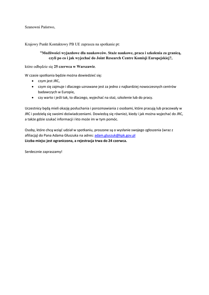 Szanowni Państwo, Krajowy Punkt Kontaktowy PB UE zaprasza na spotkanie pt: ”Możliwości wyjazdowe dla naukowców. Staże naukowe, praca i szkolenia za granicą, czyli po co i jak wyjechać do Joint Research Centre Komisji Europejskiej?, które odbędzie się 25 czerwca w Warszawie. W czasie spotkania będzie można dowiedzieć się: czym jest JRC, czym się zajmuje i dlaczego uznawane jest za jedno z najbardziej nowoczesnych centrów badawczych w Europie, czy warto i jeśli tak, to dlaczego, wyjechać na staż, szkolenie lub do pracy. Uczestnicy będą mieli okazję posłuchania i porozmawiania z osobami, które pracują lub pracowały w JRC i podzielą się swoimi doświadczeniami. Dowiedzą się również, kiedy i jak można wyjechać do JRC, a także gdzie szukać informacji i kto może im w tym pomóc. Osoby, które chcą wziąć udział w spotkaniu, proszone są o wysłanie swojego zgłoszenia (wraz z afiliacją) do Pana Adama Głuszuka na adres: [email protected] Liczba miejsc jest ograniczona, a rejestracja trwa do 24 czerwca. Serdecznie zapraszamy!