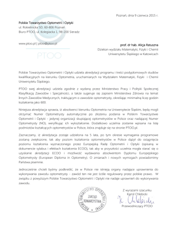 Poznań, dnia 9 czerwca 2015 r. Polskie Towarzystwo Optometrii i Optyki ul. Rokietnicka 5D, 60-806 Poznań Biuro PTOO, ul. Kolegiacka 1, 98-200 Sieradz www.ptoo.pl | [email protected] prof. dr hab. Alicja Ratuszna Dziekan wydziału Matematyki, Fizyki i Chemii Uniwersytetu Śląskiego w Katowicach Polskie Towarzystwo Optometrii i Optyki udziela akredytacji programu i treści podyplomowych studiów kwalifikacyjnych na kierunku Optometria, uruchamianych na Wydziałem Matematyki, Fizyki i Chemii Uniwersytetu Śląskiego. PTOO swej akredytacji udziela zgodnie z wydaną przez Ministerstwo Pracy i Polityki Społecznej Klasyfikacją Zawodów i Specjalności, a także sugeruje się zapisem Ministerstwa Zdrowia na temat Innych Zawodów Medycznych, traktującym o zawodzie optometrysty, określając minimalną liczę godzin kształcenia jako 600. Niniejsza akredytacja sprawia, iż absolwenci kierunku Optometria na Uniwersytecie Śląskim, będą mogli otrzymać Numer Optometrysty automatycznie po złożeniu podania w Polskim Towarzystwie Optometrii i Optyki - jedynej organizacji skupiającej optometrystów w Polsce oraz nadającej Numer Optometrysty (NO), weryfikując ich wykształcenie. Dodatkowo uczelnia zostanie wpisana na listę podmiotów kształcących optometrystów w Polsce, która znajduje się na stronie PTOO.pl. Zaznaczamy, iż akredytacja zostaje udzielona na 5 lata, po tym okresie wymagania programowe zostaną zwiększone, tak aby poziom kształcenia optometrystów w Polsce dążył do osiągnięcia poziomu kształcenia wyznaczonego przez Europejską Radę Optometrii i Optyki (opisaną w dokumencie sylabus i efektach kształcenia ECOO), tak aby w przyszłości uczelnia mogła starać się o uzyskanie akredytacji ECOO i możliwość wydawania absolwentom Dyplomu Europejskiego Optometrysty (European Diploma in Optometry). O zmianach i nowych wymogach powiadomimy Państwa pisemnie. Jednocześnie chcieli byśmy podkreślić, że w Polsce nie istnieją organy nadające uprawnienia do wykonywania zawodu optometrysty - zawód ten nie jest ściśle regulowany przez polskie prawo. W związku z powyższym Polskie Towarzystwo Optometrii i Optyki nie nadaje uprawnień do wykonywania zawodu. Z wyrazami szacunku Kamil Chlebicki Przewodniczący PTOO