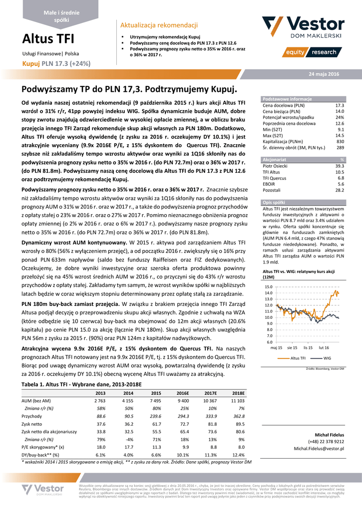 Małe i średnie spółki Aktualizacja rekomendacji Altus TFI Usługi Finansowe| Polska Utrzymujemy rekomendację Kupuj Podwyższamy cenę docelową do PLN 17.3 z PLN 12.6 Podwyższamy prognozy zysku netto o 35% w 2016 r. oraz o 36% w 2017 r. Kupuj PLN 17.3 (+24%) 24 maja 2016 Podwyższamy TP do PLN 17,3. Podtrzymujemy Kupuj. Od wydania naszej ostatniej rekomendacji (9 października 2015 r.) kurs akcji Altus TFI wzrósł o 31% r/r, 41pp powyżej indeksu WIG. Spółka dynamicznie buduje AUM, dobre stopy zwrotu znajdują odzwierciedlenie w wysokiej opłacie zmiennej, a w obliczu braku przejęcia innego TFI Zarząd rekomenduje skup akcji własnych za PLN 180m. Dodatkowo, Altus TFI oferuje wysoką dywidendę (z zysku za 2016 r. oczekujemy DY 10.1%) i jest atrakcyjnie wyceniany (9.9x 2016E P/E, z 15% dyskontem do Quercus TFI). Znacznie szybsze niż zakładaliśmy tempo wzrostu aktywów oraz wyniki za 1Q16 skłoniły nas do podwyższenia prognozy zysku netto o 35% w 2016 r. (do PLN 72.7m) oraz o 36% w 2017 r. (do PLN 81.8m). Podwyższamy naszą cenę docelową dla Altus TFI do PLN 17.3 z PLN 12.6 oraz podtrzymujemy rekomendację Kupuj. Podwyższamy prognozy zysku netto o 35% w 2016 r. oraz o 36% w 2017 r. Znacznie szybsze niż zakładaliśmy tempo wzrostu aktywów oraz wyniki za 1Q16 skłoniły nas do podwyższenia prognozy AUM o 31% w 2016 r. oraz w 2017 r., a także do podwyższenia prognoz przychodów z opłaty stałej o 23% w 2016 r. oraz o 27% w 2017 r. Pomimo nieznacznego obniżenia prognoz opłaty zmiennej (o 2% w 2016 r. oraz o 6% w 2017 r.). podwyższamy nasze prognozy zysku netto o 35% w 2016 r. (do PLN 72.7m) oraz o 36% w 2017 r. (do PLN 81.8m). Dynamiczny wzrost AUM kontynuowany. W 2015 r. aktywa pod zarządzaniem Altus TFI wzrosły o 80% (56% z wyłączeniem przejęć), a od początku 2016 r. zwiększyły się o 16% przy ponad PLN 633m napływów (saldo bez funduszy Raiffeisen oraz FIZ dedykowanych). Oczekujemy, że dobre wyniki inwestycyjne oraz szeroka oferta produktowa powinny przełożyć się na 45% wzrost średnich AUM w 2016 r., co przyczyni się do 43% r/r wzrostu przychodów z opłaty stałej. Zakładamy tym samym, że wzrost wyników spółki w najbliższych latach będzie w coraz większym stopniu determinowany przez opłatę stałą za zarządzanie. PLN 180m buy-back zamiast przejęcia. W związku z brakiem przejęcia innego TFI Zarząd Altusa podjął decyzję o przeprowadzeniu skupu akcji własnych. Zgodnie z uchwałą na WZA (które odbędzie się 10 czerwca) buy-back ma obejmować do 12m akcji własnych (20.6% kapitału) po cenie PLN 15.0 za akcję (łącznie PLN 180m). Skup akcji własnych uwzględnia PLN 56m z zysku za 2015 r. (90%) oraz PLN 124m z kapitałów nadwyżkowych. Atrakcyjna wycena 9.9x 2016E P/E, z 15% dyskontem do Quercus TFI. Na naszych prognozach Altus TFI notowany jest na 9.9x 2016E P/E, tj. z 15% dyskontem do Quercus TFI. Biorąc pod uwagę dynamiczny wzrost AUM oraz wysoką, powtarzalną dywidendę (z zysku za 2016 r. oczekujemy DY 10.1%) obecną wycenę Altus TFI uważamy za atrakcyjną. Podstawowe informacje Cena docelowa (PLN) Cena bieżąca (PLN) Potencjał wzrostu/spadku Poprzednia cena docelowa Min (52T) Max (52T) Kapitalizacja (PLNm) Śr. dzienny obrót (3M, PLN tys.) 17.3 14.0 24% 12.6 9.1 14.5 830 289 Akcjonariat Piotr Osiecki TFI Altus TFI Quercus EBOiR Pozostali % 39.3 10.5 6.8 5.6 28.2 Opis spółki Altus TFI jest niezależnym towarzystwem funduszy inwestycyjnych z aktywami o wartości PLN 8.7 mld oraz 3.4% udziałem w rynku. Oferta spółki koncentruje się głównie na funduszach zamkniętych (AUM PLN 6.4 mld, z czego 47% stanowią fundusze niededykowane). Ponadto, w ramach usłusi zarządzania aktywami Altus TFI zarządza AUM o wartości PLN 1.9 mld. Altus TFI vs. WIG: relatywny kurs akcji (12M) 15.0 14.0 13.0 12.0 11.0 10.0 9.0 8.0 7.0 6.0 maj 15 sie 15 lis 15 Altus TFI lut 16 WIG Źródło: Bloomberg, Vestor DM Tabela 1. Altus TFI - Wybrane dane, 2013-2018E 2013 2014 2015 2016E 2017E 2018E 2 763 4 155 7 495 9 400 10 367 11 103 58% 50% 80% 25% 10% 7% Przychody 88.6 90.5 239.6 294.3 333.9 362.8 Zysk netto 37.6 36.2 61.7 72.7 81.8 89.5 Zysk netto dla akcjonariuszy 33.8 32.5 55.5 65.4 73.6 80.6 79% -4% 71% 18% 13% 9% 18.0 17.7 11.3 9.9 8.8 8.0 AUM (bez AM) Zmiana r/r (%) Zmiana r/r (%) P/E skorygowany* (x) Michał Fidelus (+48) 22 378 9212 [email protected] DY/buy-back** (%) 6.1% 4.0% 6.6% 10.1% 11.3% 12.4% * wskaźniki 2014 i 2015 skorygowane o emisję akcji, ** z zysku za dany rok. Źródło: Dane spółki, prognozy Vestor DM Wszystkie ceny aktualizowane są na koniec sesji giełdowej z dnia 20.05.2016 r., chyba, że jest to inaczej określone. Ceny pochodzą z lokalnych giełd za pośrednictwem serwisów Reutera, Bloomberga oraz innych dostawców. Źródłem danych jest Dom Inwestycyjny Investors oraz opisywane firmy. Vestor DM współpracuje oraz stara się prowadzić swoją działalność ze spółkami uwzględnionymi w jego raportach z badań. Dlatego też inwestorzy powinni mieć świadomość, że w firmie może zachodzić konflikt interesów, co mogłyby wpłynąć na obiektywność niniejszego raportu. Inwestorzy powinni brać ten raport pod uwagę jedynie jako jeden z czynników przy podejmowaniu swoich decyzji inwestycyjnych. ZASTRZEŻENIE ODPOWIEDZIALNOŚCI Niniejszy materiał został przygotowany przez Vestor Dom Maklerski S.A. (“Vestor”), z siedzibą w Warszawie, ul. Mokotowska 1, 00-640 Warszawa, wpisaną do rejestru przedsiębiorców przez Sąd Rejonowy dla m. st. Warszawy w Warszawie XII Wydział Gospodarczy Krajowego Rejestru Sądowego pod numerem KRS 0000277384, NIP 1080003081, REGON 140943747, kapitał w wysokości 1.811.570 PLN, w całości wpłacony, podmiot podlegający przepisom Ustawy z dnia 29 lipca 2005 r. o obrocie instrumentami finansowymi (Dz.U. z 2014 r., poz. 94 – j.t. z późn. zm.), Ustawy z dnia 29 lipca 2005 r. o ofercie publicznej i warunkach wprowadzania instrumentów finansowych do zorga