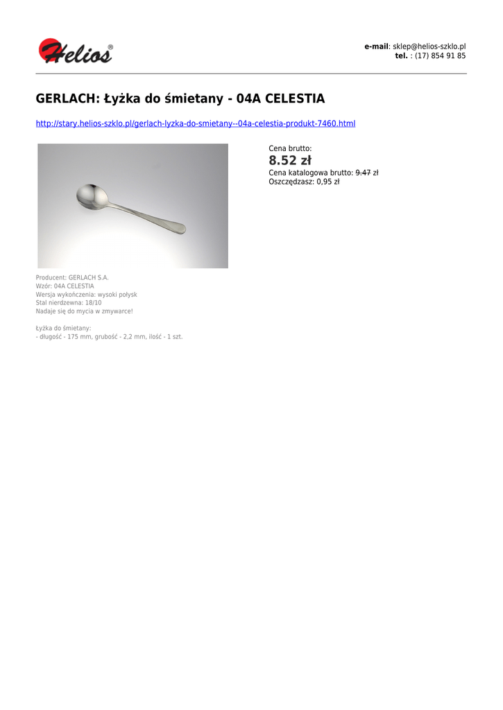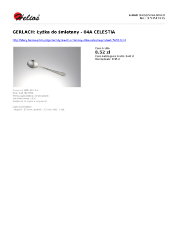 e-mail: [email protected] tel. : (17) 854 91 85 GERLACH: Łyżka do śmietany - 04A CELESTIA http://stary.helios-szklo.pl/gerlach-lyzka-do-smietany--04a-celestia-produkt-7460.html Cena brutto: 8.52 zł Cena katalogowa brutto: 9.47 zł Oszczędzasz: 0,95 zł Producent: GERLACH S.A. Wzór: 04A CELESTIA Wersja wykończenia: wysoki połysk Stal nierdzewna: 18/10 Nadaje się do mycia w zmywarce! Łyżka do śmietany: - długość - 175 mm, grubość - 2,2 mm, ilość - 1 szt.