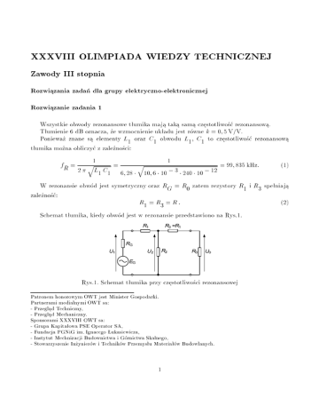 XXXVIII OLIMPIADA WIEDZY TECHNICZNEJ Zawody III stopnia Rozwi¡zania zada« dla grupy elektryczno-elektronicznej Rozwi¡zanie zadania 1 Wszystkie obwody rezonansowe tªumika maj¡ tak¡ sam¡ cz¦stotliwo±¢ rezonansow¡. Tªumienie 6 dB oznacza, »e wzmocnienie ukªadu jest równe k = 0; 5 V/V. Poniewa» znane s¡ elementy L1 oraz C1 obwodu L1 , C1 to cz¦stotliwo±¢ rezonansow¡ tªumika mo»na obliczy¢ z zale»no±ci: 1 1 q fR = q = = 99; 835 kHz. (1) 2 L1 C1 6; 28 10; 6 10 3 240 10 12 W rezonansie obwód jest symetryczny oraz RG = R0 zatem rezystory R1 i R3 speªniaj¡ zale»no±¢: R1 = R3 = R : (2) Schemat tªumika, kiedy obwód jest w rezonansie przedstawiono na Rys.1. Rys.1. Schemat tªumika przy cz¦stotliwo±ci rezonansowej Patronem honorowym OWT jest Minister Gospodarki. Partnerami medialnymi OWT sa: - Przegl¡d Techniczny, - Przegl¡d Mechaniczny. Sponsorami XXXVIII OWT sa: - Grupa Kapitaªowa PSE Operator SA, - Fundacja PGNiG im. Ignacego ukasiewicza, - Instytut Mechnizacji Budownictwa i Górnictwa Skalnego, - Stowarzyszenie In»ynierów i Techników Przemysªu Materiaªów Budowlanych. 1 Stosuj¡c wzory podane w literaturze lub korzystaj¡c z zale»no±ci: k= gdzie U0 U0 = U1 U2 U2 ; U1 R0 U0 = ; U2 R1 + R0 R2 R1 + R0 R1 + R2 + R0 (3) (4) R2 R1 + R0 R2 R1 + R0 U2 R1 + R2 + R0 R1 + R2 + R0 = = = ; R U1 R 0 G R2 R1 + R0 R1 + R + R + R 1 2 0 rezystancje R1 oraz R2 s¡ równe: R1 = R0 k 1 k 1 0; 5 = 50 = 16; 7 ; 1+k 1 + 0; 5 (5) (6) 0; 5 0; 5 = 66; 7 : (7) = 100 0 ; 75 2 2 1 k 1 0; 5 Wykorzystuj¡c dane z zadania i obliczone warto±ci rezystancji R1 oraz R2 mo»na obliczy¢ pozostaªe elementy obwodu: 1. Indukcyjno±¢ L2 R2 = 2 R0 = 2 50 Q2 R2 50 66; 7 L2 = = = 5; 3 mH. !R 3 2 99; 8 10 (8) 2. Pojemno±¢ kondensatora C2 C2 = 1 !R2 L2 1 = 2 99; 8 103 2 2 5; 3 10 3 = 478 pF. (9) 3. Indukcyjno±¢ L3 L3 = 1 1 = = 21; 1 mH. 2 2 !R C3 2 99; 8 103 120 10 12 (10) Rozwi¡zanie zadania 2 Caªkowita powierzchnia pr¦tów jest równa: 0 2 1 0 1 2 d 0; 08 S = 10 @2 + d lA = 10 @2 + 0; 08 0; 4A = 1; 1 m2 : 4 4 (1) Odczytuj¡c z tablic zycznych warto±¢ równowa»nika elektrochemicznego niklu k = 0; 304 mg ; As mo»na obliczy¢ pr¡d jaki jest pobierany ze ¹ródªa zasilania: I= m 2100 = = 160 A. k t 0; 304 10 3 12 60 60 G¦sto±¢ pr¡du pobieranego z zasilacza jest równa: I 160 J= = = 145; 5 A/m2: S 1; 1 (2) (3) Energia elektryczna pobrana z zasilacza napi¦cia staªego jest zatem równa U I t 3; 8 160 12 7296 = = = 7; 68 kW. (4) 0; 95 0; 95 Przy zasilaniu impulsowym czas i zu»ycie materiaªu podczas nakªadania powªoki b¦d¡ takie same jak przy zasilaniu pr¡dem staªym, kiedy warto±¢ ±rednia napi¦cia impulsowego b¦dzie taka sama jak napi¦cie ¹ródªa pr¡du staªego, tzn.: W= U = UM D ; gdzie UM = 10 V maksymalna warto±¢ napi¦cia impulsowego (Rys.1). 3 (5) Rys.1. Po przeksztaªceniu warto±¢ wspóªczynnik wypeªnienia D jest równa: ti U 3; 8 D= = = = 0; 38 : T UM 10 (6) Rozwi¡zanie zadania 3 Rys.1. Rozpªyw pr¡dów i rozkªad napi¦¢ w ukªadzie Dla podanych warto±ci elementów Cr oraz Lr mo»na obliczy¢ cz¦stotliwo±¢ pracy falownika. Cz¦stotliwo±¢ ta jest równa cz¦stotliwo±ci rezonansowej obwodu Cr Lr 1 1 q fR = q = = 16 kHz. (1) 2 Lr Cr 6; 28 9; 89 10 6 10 10 6 Wprowadzaj¡c oznaczenia pr¡dów i napi¦¢ jak na Rys.1 ksztaªty przebiegów czasowych ur (t), ir (t), iz (t), io(t) przedstawiono na Rys.2. 4 Rys.2. Ksztaªt przebiegów pr¡dów i napi¦¢ w ukªadzie przeksztaªtnika Warto±¢ maksymalna napi¦cia wyj±ciowego napi¦cia falownika jest równa Uz = 300 V. Poniewa» ukªad jest bezstratny, napi¦cie Uo = Uz , tzn: U0 = 300 V. Moc czynna dostarczana do odbiornika R0 jest zatem równa: 2 U0 3002 P0 = = = 9 kW. R0 10 (2) (3) Wª¡czenie na wyj±ciu falownika szeregowego obwodu rezonansowego spowodowaªo, »e przebieg czasowy pr¡du ir (t) ma ksztaªt sinusoidalny. Pr¡dy io oraz iz s¡ równe ir (t) , a zatem ich warto±ci ±rednie równie» s¡ sobie równe. Warto±¢ ±redni¡ pr¡du odbiornika mo»n¡ zatem obliczy¢ z zale»no±ci: P 9000 I0; AV = = = 30 A. (4) U0 300 Poniewa» warto±¢ ±rednia przebiegu sinusoidalnego wyprostowanego dwupulsowo jest równa 2 I0; AV = Im ; (5) 5 to warto±¢ maksymalna pr¡du i0(t) ma warto±¢: 2 2 Im = I0; AV = 30 = 47 A. 3; 14 (6) Wyskalowane przebiegi napi¦cia wyj±ciowego ur (t) oraz pr¡du wyj±ciowego ir (t) falownika, pr¡du zasilaj¡cego iz (t) oraz pr¡du obci¡»enia io(t) przedstawiono na Rys.3. Rys.3. Wyskalowane przebiegi pr¡dów i napi¦¢ w przeksztaªtniku 6 Rozwi¡zanie problemu technicznego ! # # # # ! " !# $% &' " ! $% ' )* +,- ' ./. $% &0 12' ,3 $% 45 # # # # # # # # ( # #### # # Opis algorytmu Wynik przetwarzania podzieli¢ przez 51. Wynik dzielenia, w postaci ilorazu oraz reszty, zapisa¢ w dwóch 8 bitowych rejestrach. Wykona¢ operacj¦ zamiany 4 bitów mªodszych (LOW) ze starszymi (HIGH) w bajcie, w którym zapisany jest iloraz. Bajt z reszt¡ podzieli¢ przez 5. Wykona¢ operacj¦ sumy logicznej na tych dwóch bajtach. Wynik wysªa¢ na wyj±cie portu P. Uwaga: Zamian¦ starszej cz¦±ci bajtu HIGH z mªodsz¡ LOW mo»na uzyska¢ poprzez przemno»enie akumulatora A przez 16 (dec) czyli 10 (hex). 7