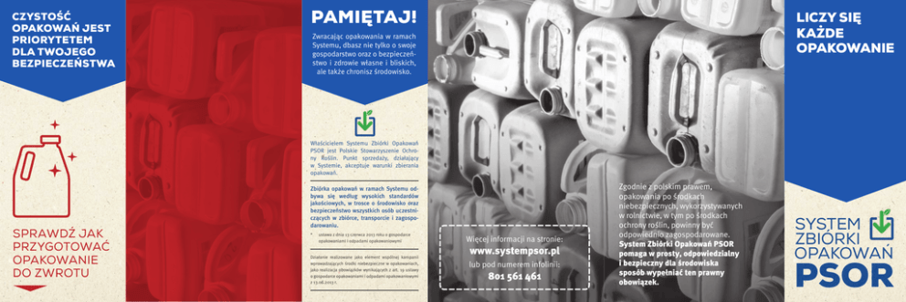 CZYSTOŚĆ OPAKOWAŃ JEST PRIORYTETEM DLA TWOJEGO BEZPIECZEŃSTWA PAMIĘTAJ! LICZY SIĘ KAŻDE OPAKOWANIE Zwracając opakowania w ramach Systemu, dbasz nie tylko o swoje gospodarstwo oraz o bezpieczeństwo i zdrowie własne i bliskich, ale także chronisz środowisko. Właścicielem Systemu Zbiórki Opakowań PSOR jest Polskie Stowarzyszenie Ochrony Roślin. Punkt sprzedaży, działający w Systemie, akceptuje warunki zbierania opakowań. SPRAWDŹ JAK PRZYGOTOWAĆ OPAKOWANIE DO ZWROTU Zbiórka opakowań w ramach Systemu odbywa się według wysokich standardów jakościowych, w trosce o środowisko oraz bezpieczeństwo wszystkich osób uczestniczących w zbiórce, transporcie i zagospodarowaniu. * ustawa z dnia 13 czerwca 2013 roku o gospodarce opakowaniami i odpadami opakowaniowymi Działanie realizowane jako element wspólnej kampanii wprowadzających środki niebezpieczne w opakowaniach, jako realizacja obowiązków wynikających z art. 19 ustawy o gospodarce opakowaniami i odpadami opakowaniowymi z 13.06.2013 r. Więcej informacji na stronie: www.systempsor.pl lub pod numerem infolinii: 801 561 461 Zgodnie z polskim prawem, opakowania po środkach niebezpiecznych, wykorzystywanych w rolnictwie, w tym po środkach ochrony roślin, powinny być odpowiednio zagospodarowane. System Zbiórki Opakowań PSOR pomaga w prosty, odpowiedzialny i bezpieczny dla środowiska sposób wypełniać ten prawny obowiązek. SYSTEM ZBIÓRKI OPAKOWAŃ PSOR UWAGA! Etykieta każdego produktu informuje o niebezpieczeństwie lub zagrożeniach, jakie może on stwarzać oraz o sposobie postępowania z opakowaniem. Te zaopatrzone w znaki ostrzegawcze oraz piktogramy nie powinny trafić do odpadów komunalnych. Zabrania się także ich wykorzystywania jako surowce wtórne, palenia i ponownego używania do innych celów. W RAMACH SYSTEMU ODBIERAMY: • opakowania po środkach ochrony roślin toksycznych i bardzo toksycznych dla organizmów wodnych lub ludzi, oznaczonych minimum jednym z piktogramów: T T+ N UŻYTKOWNIKU! PRZYGOTUJ OPAKOWANIE DO ZWROTU W RAMACH SYSTEMU NIE ODBIERAMY • brudnych, • z resztkami produktów, • z produktami przeterminowanymi, 1. Przelej całą zawartość • zbiorczych, np. kartonów, folii stretch opakowania do zbiornika opryskiwacza 2. Wypełnij opakowanie wodą do 1/4 jego objętości 3. Zamknij opakowania • opakowania po innych środkach niebezpiecznych, wykorzystywanych w rolnictwie, np. nawozy, adiuwanty, produkty biobójcze, oznaczone minimum jednym z piktogramów: T T+ N i potrząsaj nim przez kilka sekund 4. Wlej wodę z opakowania do zbiornika opryskiwacza 3x PŁUCZ Przed przyjęciem opakowań oceń ich CZYSTOŚĆ. Muszą być wypłukane, całkowicie opróżnione, bez resztek produktów. OPERATOR SYSTEMU dostarczy do sklepów: • worki służące zbiórce • materiały informacyjne • zasady zbiórki opakowań, a także: • odbierze zapełnione worki na koszt producentów • potwierdzi odbiór opakowań Kartą Przekazania Odpadu Zgłoś odbiór opakowań: 5. Powtórz wszystkie te 801 561 461 lub [email protected] 6. Zbierz wszystkie opróżnione SPRZEDAWCO! czynności jeszcze 2 razy Ze względów prawnych i środowiskowych istnieje obowiązek profesjonalnej utylizacji opakowań na koszt posiadacza. 1/4 SPRZEDAWCO! i czyste opakowania z gospodarstwa i przynieść je do sklepu, w którym kupiłeś/aś produkt Pamiętaj, że masz prawny obowiązek informować klientów o sposobie postępowania z opakowaniami i dostępnych systemach zbiórki.