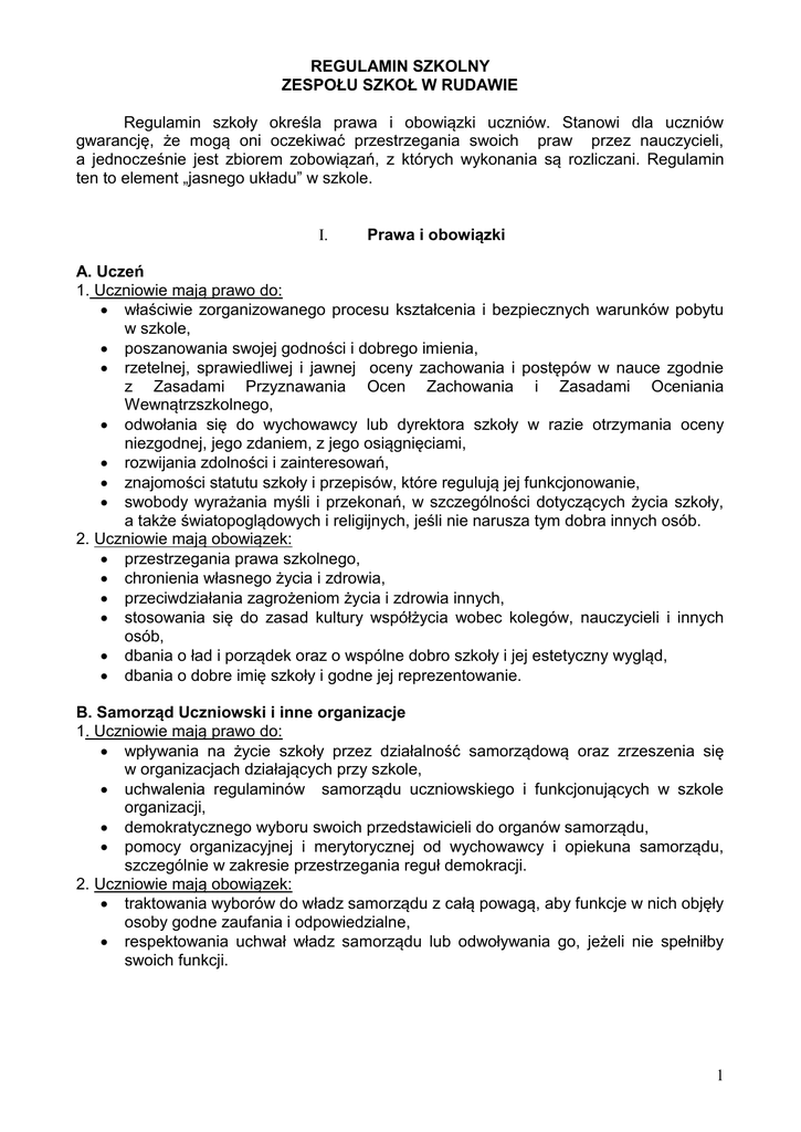 REGULAMIN SZKOLNY ZESPOŁU SZKOŁ W RUDAWIE Regulamin szkoły określa prawa i obowiązki uczniów. Stanowi dla uczniów gwarancję, że mogą oni oczekiwać przestrzegania swoich praw przez nauczycieli, a jednocześnie jest zbiorem zobowiązań, z których wykonania są rozliczani. Regulamin ten to element „jasnego układu” w szkole. Prawa i obowiązki A. Uczeń 1. Uczniowie mają prawo do: właściwie zorganizowanego procesu kształcenia i bezpiecznych warunków pobytu w szkole, poszanowania swojej godności i dobrego imienia, rzetelnej, sprawiedliwej i jawnej oceny zachowania i postępów w nauce zgodnie z Zasadami Przyznawania Ocen Zachowania i Zasadami Oceniania Wewnątrzszkolnego, odwołania się do wychowawcy lub dyrektora szkoły w razie otrzymania oceny niezgodnej, jego zdaniem, z jego osiągnięciami, rozwijania zdolności i zainteresowań, znajomości statutu szkoły i przepisów, które regulują jej funkcjonowanie, swobody wyrażania myśli i przekonań, w szczególności dotyczących życia szkoły, a także światopoglądowych i religijnych, jeśli nie narusza tym dobra innych osób. 2. Uczniowie mają obowiązek: przestrzegania prawa szkolnego, chronienia własnego życia i zdrowia, przeciwdziałania zagrożeniom życia i zdrowia innych, stosowania się do zasad kultury współżycia wobec kolegów, nauczycieli i innych osób, dbania o ład i porządek oraz o wspólne dobro szkoły i jej estetyczny wygląd, dbania o dobre imię szkoły i godne jej reprezentowanie. B. Samorząd Uczniowski i inne organizacje 1. Uczniowie mają prawo do: wpływania na życie szkoły przez działalność samorządową oraz zrzeszenia się w organizacjach działających przy szkole, uchwalenia regulaminów samorządu uczniowskiego i funkcjonujących w szkole organizacji, demokratycznego wyboru swoich przedstawicieli do organów samorządu, pomocy organizacyjnej i merytorycznej od wychowawcy i opiekuna samorządu, szczególnie w zakresie przestrzegania reguł demokracji. 2. Uczniowie mają obowiązek: traktowania wyborów do władz samorządu z całą powagą, aby funkcje w nich objęły osoby godne zaufania i odpowiedzialne, respektowania uchwał władz samorządu lub odwoływania go, jeżeli nie spełniłby swoich funkcji. 1 C.Lekcja 1. Uczniowie mają prawo do: znajomości celów i zadań lekcyjnych oraz jasnego i zrozumiałego przekazu treści lekcji, pomocy ze strony nauczyciela w przypadku natrafienia na trudności. 2. Uczniowie mają obowiązek: punktualnego i systematycznego przychodzenia na zajęcia, aktywnego udziału w lekcjach i przestrzegania ustalonych zasad porządkowych, uzupełniania braków wynikających z absencji, systematycznej i wytrwałej pracy nad wzbogacaniem swojej wiedzy, wykorzystywania jak najlepiej czasu i warunków nauki. D. Sala lekcyjna 1. Uczniowie mają prawo do: udziału w zagospodarowaniu powierzonej im sali lekcyjnej wg własnego projektu uzgodnionego z wychowawcą, kontrolowania porządku zostawionego w sali przez wcześniej uczącą się tam klasę. 2. Uczniowie mają obowiązek: zostawiania sali lekcyjnej w nienagannym porządku, dbania o powierzony klasie sprzęt i pomoce naukowe, niezwłocznego zgłaszania nauczycielowi wszystkich uszkodzeń sprzętu lub pomocy dydaktycznych. E. Odpoczynek 1. Uczniowie mają prawo do: odpoczynku podczas przerwy, dwóch dni w tygodniu wolnych od zajęć lekcyjnych, tj. soboty i niedzieli, z wyłączeniem tych sobót, w które są odpracowywane inne dni robocze. 2. Uczniowie mają obowiązek: przestrzegania zasad bezpieczeństwa i higieny pracy, dbania o kulturę zachowania i kulturę języka, zachowywania zasad higieny osobistej i higieny otoczenia. F. Prace domowe 1. Uczniowie mają prawo do: uwzględniania przez nauczyciela ich psychicznych i fizycznych możliwości, ukierunkowania przez nauczyciela, jak wykonać zadania domowe. 2. Uczniowie mają obowiązek: starannego i sumiennego odrabiania prac domowych, kształtowania nawyku odrabiania prac domowych w tym dniu, w którym zostały zadane. G. Zeszyt przedmiotowy lub zeszyt ćwiczeń 1. Uczniowie mają prawo do: ukierunkowania przez nauczyciela, jak należy prowadzić zeszyt przedmiotowy lub zeszyt ćwiczeń. 2. Uczniowie mają obowiązek: posiadania i starannego prowadzenia zeszytów oraz podręczników zgodnie z wymaganiami nauczyciela. 2 II. Procedury lekcyjne Wejście do klasy Nauczyciel otwiera klasę. Do klasy wchodzą najpierw dziewczęta, później chłopcy. Wszyscy stają przy ławkach i następuje powitanie. Uczniowie przygotowują się do lekcji. Nauczyciel sprawdza listę obecności. Uczeń spóźniony, czyli taki, który wchodzi do klasy po zamknięciu drzwi, usprawiedliwia swoje spóźnienie w momencie wskazanym przez nauczyciela i siada w ławce. Zachowanie w czasie lekcji Podczas lekcji nie je się, nie żuje gumy, nie pije. Nie trzyma się na ławce butelek, ciastek itp., nie będących pomocami do danej lekcji. Jeżeli do klasy wchodzi osoba dorosła, wszyscy wstają, ponownie siadają na polecenie nauczyciela. Nie należy utrudniać pracy nauczycielowi. Nie wolno przeszkadzać kolegom i koleżankom. Zakończenie lekcji Lekcja kończy się na wyraźny sygnał nauczyciela, następuje pożegnanie nauczyciela z uczniami. Klasa jest zobowiązana pozostawić po sobie porządek; odpowiadają za to wszyscy uczniowie, a kontrolują dyżurni. Uczniowie ustawiają krzesła na ławki, jeżeli jest to ostatnia lekcja w danej pracowni. Zachowanie w czasie przerw Zabronione jest siadanie na parapetach okiennych i samowolne otwieranie okien. Należy zachowywać się spokojnie, nie biegać, nie zagrażać swoim zachowaniem bezpieczeństwu innych. O wszystkich niebezpiecznych sytuacjach i przejawach agresji należy poinformować nauczyciela pełniącego w tym czasie dyżur. Należy przebywać na terenie własnej szkoły (szkoła podstawowa i gimnazjum) z wyjątkiem przejść do biblioteki oraz na zajęcia wychowania fizycznego. Nie wolno opuszczać terenu szko
