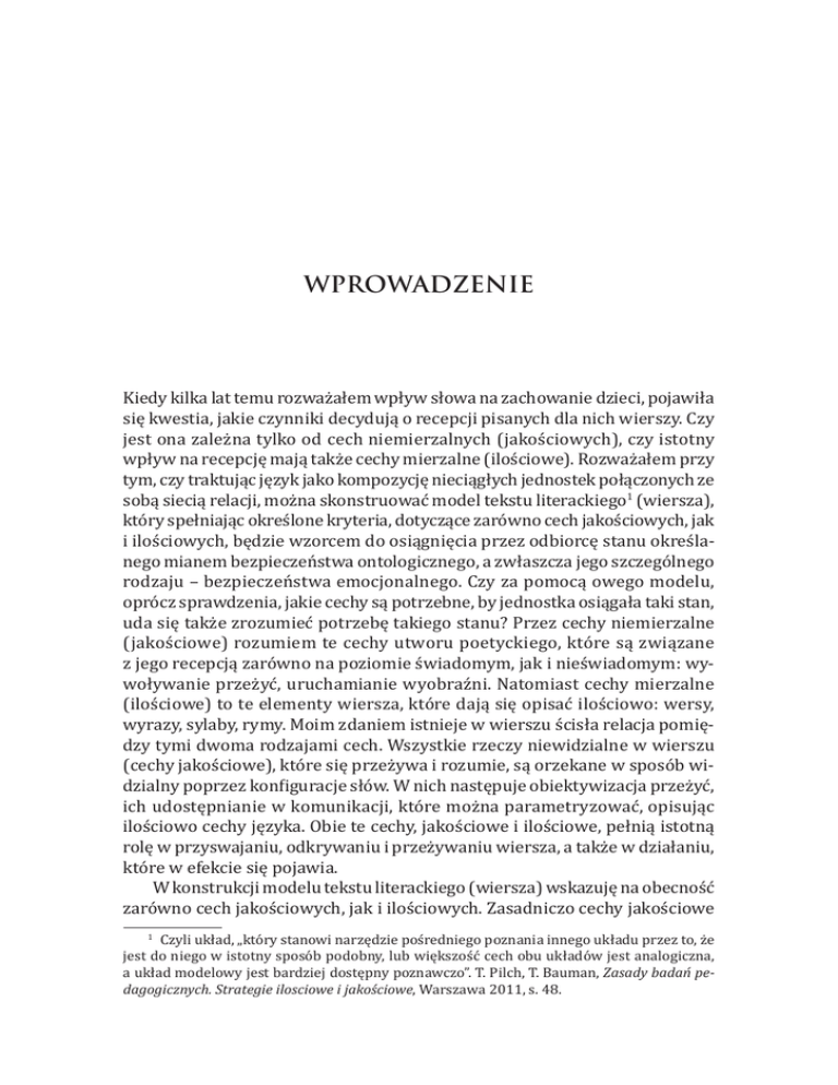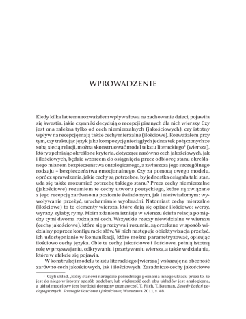 Wprowadzenie Kiedy kilka lat temu rozważałem wpływ słowa na zachowanie dzieci, pojawiła się kwestia, jakie czynniki decydują o recepcji pisanych dla nich wierszy. Czy jest ona zależna tylko od cech niemierzalnych (jakościowych), czy istotny wpływ na recepcję mają także cechy mierzalne (ilościowe). Rozważałem przy tym, czy traktując język jako kompozycję nieciągłych jednostek połączonych ze sobą siecią relacji, można skonstruować model tekstu literackiego1 (wiersza), który spełniając określone kryteria, dotyczące zarówno cech jakościowych, jak i ilościowych, będzie wzorcem do osiągnięcia przez odbiorcę stanu określanego mianem bezpieczeństwa ontologicznego, a zwłaszcza jego szczególnego rodzaju – bezpieczeństwa emocjonalnego. Czy za pomocą owego modelu, oprócz sprawdzenia, jakie cechy są potrzebne, by jednostka osiągała taki stan, uda się także zrozumieć potrzebę takiego stanu? Przez cechy niemierzalne (jakościowe) rozumiem te cechy utworu poetyckiego, które są związane z jego recepcją zarówno na poziomie świadomym, jak i nieświadomym: wywoływanie przeżyć, uruchamianie wyobraźni. Natomiast cechy mierzalne (ilościowe) to te elementy wiersza, które dają się opisać ilościowo: wersy, wyrazy, sylaby, rymy. Moim zdaniem istnieje w wierszu ścisła relacja pomiędzy tymi dwoma rodzajami cech. Wszystkie rzeczy niewidzialne w wierszu (cechy jakościowe), które się przeżywa i rozumie, są orzekane w sposób widzialny poprzez konfiguracje słów. W nich następuje obiektywizacja przeżyć, ich udostępnianie w komunikacji, które można parametryzować, opisując ilościowo cechy języka. Obie te cechy, jakościowe i ilościowe, pełnią istotną rolę w przyswajaniu, odkrywaniu i przeżywaniu wiersza, a także w działaniu, które w efekcie się pojawia. W konstrukcji modelu tekstu literackiego (wiersza) wskazuję na obecność zarówno cech jakościowych, jak i ilościowych. Zasadniczo cechy jakościowe 1 Czyli układ, „który stanowi narzędzie pośredniego poznania innego układu przez to, że jest do niego w istotny sposób podobny, lub większość cech obu układów jest analogiczna, a układ modelowy jest bardziej dostępny poznawczo”. T. Pilch, T. Bauman, Zasady badań pedagogicznych. Strategie ilosciowe i jakościowe, Warszawa 2011, s. 48. 8 Wprowadzenie są ważniejsze, z założenia i następstwa najważniejsze, jednak z wyników przeprowadzonych przeze mnie badań wnioskuję, że nie jedyne. W swoich dociekaniach odróżniam porządek konstytucji emocji wyrażanych przez badany tekst od porządku poznawczego, konstruowanego przez badacza. Na tworzenie tekstu literackiego wpływ ma przede wszystkim wizja świata artysty, jego kompetencje artystyczno-estetyczne oraz zamierzony cel, wyznaczony przez wartość, która zarazem nadaje sens utworowi. Są to cechy, które określam jako jakościowe. Porządek mojego badania jest jednak odwrotny – punktem wyjścia jest gotowy tekst: słowa, wyrażenia, ciągi wyrażeń. Poprzez ich analizę, zwłaszcza ilościową, chcę nie tyle zinterpretować sens dzieła, ile emocje towarzyszące jego odbiorowi. Prowadząc badania, pamiętałem także o tym, że stosunek zachodzący między utworem literackim a odbiorcą jest w każdym przypadku relacją indywidualną. Skutki zetknięcia się jakiejś jednostki z dziełem zależą nie tylko od właściwości tego dzieła, ale także od osobowości, poziomu kulturalnego, wrażliwości, wreszcie określonego samopoczucia i nastroju odbiorcy. Toteż nie tylko różne książki mają jednego odbiorcę lub jedna książka ma różnych odbiorców, lecz nawet ten sam utwór ma tego samego odbiorcę w różnych okolicznościach, w których może działać różnie, utrwalając lub burząc równowagę psychiczną, ściśle związaną z przeżywanymi emocjami. Emocje traktuję jako bardzo ważną wartość. Koncentrując się na nich, podążam wcześniej obraną drogą, na której stawiam wiele pytań, nie twierdzeń. Prowadząc badania, rozważałem także, w jaki sposób powinno odbywać się przyswajanie emocji, aby zapewnić dziecku, a w przyszłości osobie dorosłej, jak największe bezpieczeństwo emocjonalne. W badaniach wykorzystałem metody statystyczne, którymi opisałem pewne prawidłowości w recepcji wierszy dla dzieci w okresie edukacji wczesnoszkolnej. Zastosowałem do ich opisu miary położenia, zróżnicowania, asymetrii i koncentracji oraz weryfikację hipotez dotyczących wartości przeciętnej i analizę współzależności zjawisk. Scharakteryzowałem wiersze lingwistycznie, posiłkując się fachową literaturą na ten temat, którą ująłem w bibliografii. Wiersze, które stanowią korpus badanych tekstów, zarówno tych, które do badań wybrały dzieci, ich rodzice i dziadkowie, jak i tych, które napisały dzieci, znajdują się w aneksach. W aneksach umieściłem także wzory kwestionariuszy wywiadu i kwestionariuszy ankietowych, które wykorzystałem w badaniach struktury i recepcji poezji dla dzieci. Praca składa się z dwóch części. W pierwszej prezentuję pojęcie bezpieczeństwa ontologicznego w zestawieniu z terapeutycznym oddziaływaniem partycypacji w sztuce, druga zaś obejmuje analizę recepcji poezji dla dzieci przez uczniów klas I–III. Pierwsza część składa się z dwóch, a druga z trzech rozdziałów. W rozdziale I zastanawiam się nad kontekstem aksjologicznym bezpieczeństwa ontologicznego. Prezentuję pojęcie bezpieczeństwa ontologicznego Wprowadzenie 9 Anthony’ego Giddensa, który wiąże je ściśle z niedyskursywną świadomością praktyczną, oraz pojęcie bezpieczeństwa ontologicznego Erika Eriksona, które uczynił on głównym narzędziem deskrypcji procesu socjalizacji człowieka. Przywołuję także rozważania Anny Pałubickiej, według której wszelkie działania nawykowe i rutynowe podtrzymują bezpieczeństwo ontologiczne, ponieważ wiążą się ze stałości