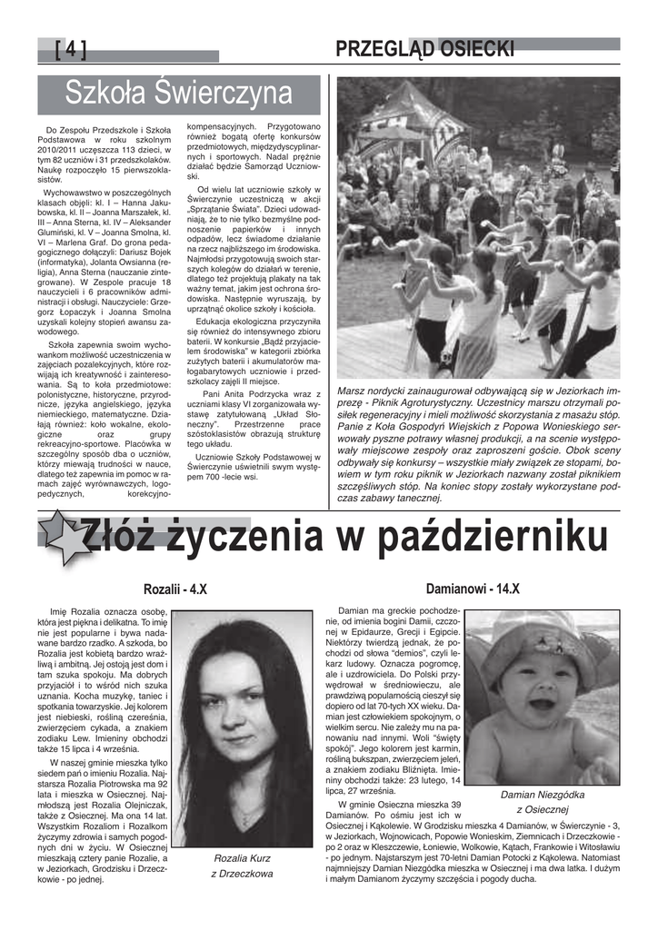 [4] Szkoła Świerczyna Do Zespołu Przedszkole i Szkoła Podstawowa w roku szkolnym 2010/2011 uczęszcza 113 dzieci, w tym 82 uczniów i 31 przedszkolaków. Naukę rozpoczęło 15 pierwszoklasistów. Wychowawstwo w poszczególnych klasach objęli: kl. I – Hanna Jakubowska, kl. II – Joanna Marszałek, kl. III – Anna Sterna, kl. IV – Aleksander Glumiński, kl. V – Joanna Smolna, kl. VI – Marlena Graf. Do grona pedagogicznego dołączyli: Dariusz Bojek (informatyka), Jolanta Owsianna (religia), Anna Sterna (nauczanie zintegrowane). W Zespole pracuje 18 nauczycieli i 6 pracowników administracji i obsługi. Nauczyciele: Grzegorz Łopaczyk i Joanna Smolna uzyskali kolejny stopień awansu zawodowego. Szkoła zapewnia swoim wychowankom możliwość uczestniczenia w zajęciach pozalekcyjnych, które rozwijają ich kreatywność i zainteresowania. Są to koła przedmiotowe: polonistyczne, historyczne, przyrodnicze, języka angielskiego, języka niemieckiego, matematyczne. Działają również: koło wokalne, ekologiczne oraz grupy rekreacyjno-sportowe. Placówka w szczególny sposób dba o uczniów, którzy miewają trudności w nauce, dlatego też zapewnia im pomoc w ramach zajęć wyrównawczych, logopedycznych, korekcyjno- PRZEGLĄD OSIECKI kompensacyjnych. Przygotowano również bogatą ofertę konkursów przedmiotowych, międzydyscyplinarnych i sportowych. Nadal prężnie działać będzie Samorząd Uczniowski. Od wielu lat uczniowie szkoły w Świerczynie uczestniczą w akcji „Sprzątanie Świata”. Dzieci udowadniają, że to nie tylko bezmyślne podnoszenie papierków i innych odpadów, lecz świadome działanie na rzecz najbliższego im środowiska. Najmłodsi przygotowują swoich starszych kolegów do działań w terenie, dlatego też projektują plakaty na tak ważny temat, jakim jest ochrona środowiska. Następnie wyruszają, by uprzątnąć okolice szkoły i kościoła. Edukacja ekologiczna przyczyniła się również do intensywnego zbioru baterii. W konkursie „Bądź przyjacielem środowiska” w kategorii zbiórka zużytych baterii i akumulatorów małogabarytowych uczniowie i przedszkolacy zajęli II miejsce. Pani Anita Podrzycka wraz z uczniami klasy VI zorganizowała wystawę zatytułowaną „Układ Słoneczny”. Przestrzenne prace szóstoklasistów obrazują strukturę tego układu. Uczniowie Szkoły Podstawowej w Świerczynie uświetnili swym występem 700 -lecie wsi. Marsz nordycki zainaugurował odbywającą się w Jeziorkach imprezę - Piknik Agroturystyczny. Uczestnicy marszu otrzymali posiłek regeneracyjny i mieli możliwość skorzystania z masażu stóp. Panie z Koła Gospodyń Wiejskich z Popowa Wonieskiego serwowały pyszne potrawy własnej produkcji, a na scenie występowały miejscowe zespoły oraz zaproszeni goście. Obok sceny odbywały się konkursy – wszystkie miały związek ze stopami, bowiem w tym roku piknik w Jeziorkach nazwany został piknikiem szczęśliwych stóp. Na koniec stopy zostały wykorzystane podczas zabawy tanecznej. ZłóŜ Ŝyczenia w październiku Damianowi - 14.X Rozalii - 4.X Damian ma greckie pochodzenie, od imienia bogini Damii, czczonej w Epidaurze, Grecji i Egipcie. Niektórzy twierdzą jednak, że pochodzi od słowa “demios”, czyli lekarz ludowy. Oznacza pogromcę, ale i uzdrowiciela. Do Polski przywędrował w średniowieczu, ale prawdziwą popularnością cieszył się dopiero od lat 70-tych XX wieku. Damian jest człowiekiem spokojnym, o wielkim sercu. Nie zależy mu na panowaniu nad innymi. Woli “święty spokój”. Jego kolorem jest karmin, rośliną bukszpan, zwierzęciem jeleń, a znakiem zodiaku Bliźnięta. Imieniny obchodzi także: 23 lutego, 14 lipca, 27 września. Imię Rozalia oznacza osobę, która jest piękna i delikatna. To imię nie jest popularne i bywa nadawane bardzo rzadko. A szkoda, bo Rozalia jest kobietą bardzo wrażliwą i ambitną. Jej ostoją jest dom i tam szuka spokoju. Ma dobrych przyjaciół i to wśród nich szuka uznania. Kocha muzykę, taniec i spotkania towarzyskie. Jej kolorem jest niebieski, rośliną czereśnia, zwierzęciem cykada, a znakiem zodiaku Lew. Imieniny obchodzi także 15 lipca i 4 września. W naszej gminie mieszka tylko siedem pań o imieniu Rozalia. Najstarsza Rozalia Piotrowska ma 92 lata i mieszka w Osiecznej. Najmłodszą jest Rozalia Olejniczak, także z Osiecznej. Ma ona 14 lat. Wszystkim Rozaliom i Rozalkom życzymy zdrowia i samych pogodnych dni w życiu. W Osiecznej mieszkają cztery panie Rozalie, a w Jeziorkach, Grodzisku i Drzeczkowie - po jednej. Rozalia Kurz z Drzeczkowa Damian Niezgódka W gminie Osieczna mieszka 39 z Osiecznej Damianów. Po ośmiu jest ich w Osiecznej i Kąkolewie. W Grodzisku mieszka 4 Damianów, w Świerczynie - 3, w Jeziorkach, Wojnowicach, Popowie Wonieskim, Ziemnicach i Drzeczkowie po 2 oraz w Kleszczewie, Łoniewie, Wolkowie, Kątach, Frankowie i Witosławiu - po jednym. Najstarszym jest 70-letni Damian Potocki z Kąkolewa. Natomiast najmniejszy Damian Niezgódka mieszka w Osiecznej i ma dwa latka. I dużym i małym Damianom życzymy szczęścia i pogody ducha.