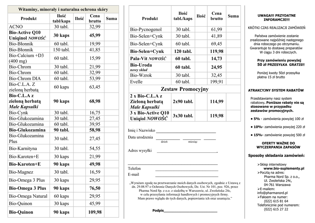 Witaminy, minerały i naturalna ochrona skóry Ilość Cena Produkt Ilość Suma tabl/kaps brutto ACNO Bio-Active Q10 Uniqinol NOWOŚĆ Bio-Błonnik Bio-Błonnik Bio-Calcium +D3 (400 mg) Bio-Chrom Bio-Chrom Bio-Chrom DIA Bio-C.L.A. Z zieloną herbatą Bio-C.L.A z zieloną herbatą Małe Kapsułki Bio-Cynk Bio-Glukozamina Bio-Glukozamina Bio-Glukozamina Bio-Glukozamina Plus Bio-Karnityna Ilość Ilość tabl./kaps Produkt Cena brutto 30 tabl. 32,99 30 kaps 45,99 60 tabl. 150 tabl. 19,99 41,85 60 tabl. 15,99 30 tabl. 60 tabl. 60 tabl. 21,99 32,99 53,99 60 kaps 63,45 90 kaps 68,98 30 tabl. 30 tabl. 60 tabl. 90 tabl. 16,75 27,45 39,95 58,98 Imię i Nazwisko ____________________ 30 tabl. 27,45 Data urodzenia 30 tabl. 54,55 Adres wysyłki Bio-Karoten+E 30 kaps 21,99 Bio-Karoten+E 90 kaps 49,98 Bio-Magnez 30 tabl. 16,59 Bio-Omega 3 Plus 30 kaps 29,95 Bio-Omega 3 Plus 90 kaps 76,50 Bio-Omega Natural Bio-Quinon 60 kaps 30 kaps 29,95 45,99 Bio-Quinon 90 kaps 109,98 Bio-Pycnogenol Bio-Selen+Cynk 30 tabl. 30 tabl. 61,99 41,89 Bio-Selen+Cynk 60 tabl. 69,45 120 tabl. 60 tabl. 119,98 14,73 60 tabl. 24,95 30 tabl. 60 tabl. 32,45 199,91 Bio-Selen+Cynk Pala-Vit NOWOŚĆ Bio-Uroda nowy skład Bio-Wzrok Evelle Suma Zestaw Promocyjny 2 x Bio-C.L.A z Zieloną herbatą 2x90 tabl. Małe Kapsułki 3 x Bio-Active Q10 3x30 tabl. Uniqiol NOWOŚĆ KRÓTKI CZAS REALIZACJI ZAMÓWIEŃ Państwa zamówienie zostanie zrealizowane najpóźniej następnego dnia roboczego po otrzymaniu. Gwarantuje to dostawę preparatów W ciągu 3 dni roboczych. Przy zamówieniu powyżej 50 zł PRZESYŁKA GRATIS!! Poniżej kwoty 50zł przesyłka płatna 15 zł brutto ATRAKCYJNY SYSTEM RABATÓW 114,99 119,98 ________ ______ ____ dzień UWAGA!!! PRZYDATNE INFORAMCJE!!! miesiąc _____________________________ Przedstawiamy nasz system rabatowy. Poniższe rabaty nie są stosowane w przypadku zestawów promocyjnych. • 5% - zamówienia powyżej 100 zł • 10%- zamówienia powyżej 220 zł • 15%- zamówienie powyżej 500 zł OFERTY WAŻNE DO WYCZERPANIA ZAPASÓW Sposoby składania zamówień: ______________________________ Telefon E-mail ________________________ ________________________ „Wyrażam zgodę na przetwarzanie moich danych osobowych, zgodnie z Ustawą z dn. 29.08.97 o Ochronie Danych Osobowych, Dz. Ust. Nr 101, poz. 926, przez Pharma Nord Sp. z o.o. z siedzibą w Warszawie, ul. Zwoleńska 24c, w celu przesyłania informacji handlowych i promocyjnych firmy. Mam prawo wglądu do tych danych, poprawiania ich oraz usunięcia.” Podpis_________________________ Sklep internetowy www.bio-suplementy.pl Pocztą na adres: Pharma Nord Sp. z o.o., Ul. Zwoleńska 24c, 04-761 Warszawa E-mailem: [email protected] Faksem na numer: (022) 615 81 64 Telefonicznie pod numerem: (022) 615 27 22