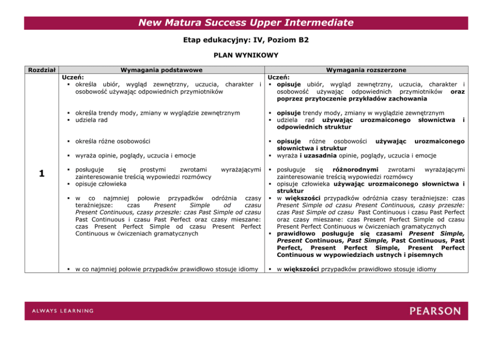 New Matura Success Upper Intermediate Etap edukacyjny: IV, Poziom B2 PLAN WYNIKOWY Rozdział Wymagania podstawowe Wymagania rozszerzone Uczeń: określa ubiór, wygląd zewnętrzny, uczucia, charakter osobowość używając odpowiednich przymiotników i określa trendy mody, zmiany w wyglądzie zewnętrznym udziela rad opisuje trendy mody, zmiany w wyglądzie zewnętrznym udziela rad używając urozmaiconego słownictwa odpowiednich struktur określa różne osobowości opisuje różne osobowości używając urozmaiconego słownictwa i struktur wyraża i uzasadnia opinie, poglądy, uczucia i emocje wyraża opinie, poglądy, uczucia i emocje 1 Uczeń: opisuje ubiór, wygląd zewnętrzny, uczucia, charakter i osobowość używając odpowiednich przymiotników oraz poprzez przytoczenie przykładów zachowania posługuje się prostymi zwrotami zainteresowanie treścią wypowiedzi rozmówcy opisuje człowieka wyrażającymi w co najmniej połowie przypadków odróżnia czasy teraźniejsze: czas Present Simple od czasu Present Continuous, czasy przeszłe: czas Past Simple od czasu Past Continuous i czasu Past Perfect oraz czasy mieszane: czas Present Perfect Simple od czasu Present Perfect Continuous w ćwiczeniach gramatycznych w co najmniej połowie przypadków prawidłowo stosuje idiomy i posługuje się różnorodnymi zwrotami wyrażającymi zainteresowanie treścią wypowiedzi rozmówcy opisuje człowieka używając urozmaiconego słownictwa i struktur w większości przypadków odróżnia czasy teraźniejsze: czas Present Simple od czasu Present Continuous, czasy przeszłe: czas Past Simple od czasu Past Continuous i czasu Past Perfect oraz czasy mieszane: czas Present Perfect Simple od czasu Present Perfect Continuous w ćwiczeniach gramatycznych prawidłowo posługuje się czasami Present Simple, Present Continuous, Past Simple, Past Continuous, Past Perfect, Present Perfect Simple, Present Perfect Continuous w wypowiedziach ustnych i pisemnych w większości przypadków prawidłowo stosuje idiomy Rozdział 2 Rozdział 3 Wymagania podstawowe Uczeń: określa własne preferencje określa swoje plany na przyszłość podaje podstawowy opis fotografii (miejsce – ludzie – czynności) uczestniczy w dyskusji na temat metod komunikacji, uczenia się pyta o kierunki drogi w co najmniej połowie przypadków stosuje czasowniki złożone (Prasal Verbs) w co najmniej połowie przypadków rozpoznaje cytaty w co najmniej połowie przypadków stosuje transformację zdań Wymagania rozszerzone Uczeń: określa i uzasadnia własne preferencje opisuje swoje plany na przyszłość posługując się szerokim zakresem słownictwa podaje wzbogacony opis fotografii uczestniczy w dyskusji na temat metod komunikacji, uczenia się używając urozmaiconego słownictwa i struktur w większości przypadków stosuje czasowniki złożone (Prasal Verbs) prawidłowo posługuje się czasownikami założonymi (Phrasal Verbs) w większości przypadków prawidłowo rozpoznaje cytaty w większości przypadków prawidłowo stosuje transformację zdań Wymagania podstawowe Uczeń: mówi o zwyczajach z przeszłości i teraźniejszości Wymagania rozszerzone Uczeń: mówi o zwyczajach z przeszłości i teraźniejszości posługując się szerokim zakresem słownictwa, podaje odpowiednie przykłady/argumenty mówi o sąsiadach posługując się szerokim zakresem słownictwa prawidłowo posługuje się czasami Present Continuous i Past Continuous prawidłowo posługuje się przedimkiem zerowym, przedimkami nieokreślonymi: „a” i „an” prawidłowo posługuje się konstrukcjami z „will”, „would”, „used to” do opisywania i mówienia o zwyczajach z przeszłości i teraźniejszości, do opisywania zmian w wyglądzie i zachowaniu człowieka w wypowiedziach ustnych i pisemnych prawidłowo posługuje się idiomami do opisywania zmian w wyglądzie i zachowaniu człowieka opisuje słynną osobę używając urozmaiconego słownictwa i struktur dokonuje prezentacji używając urozmaiconego słownictwa i struktur mówi o sąsiadach w co najmniej połowie przypadków poprawnie stosuje czasy Present Continuous i Past Continuous w co najmniej połowie przypadków poprawnie stosuje przedimek zerowy, przedimki nieokreślone: „a” i „an” w co najmniej połowie przypadków poprawnie stosuje konstrukcje z „will”, „would”, „used to” do opisywania i mówienia o zwyczajach z przeszłości i teraźniejszości, do opisywania zmian w wyglądzie i zachowaniu człowieka w co najmniej połowie przypadków poprawnie stosuje idiomy do opisywania zmian w wyglądzie i zachowaniu człowieka opisuje słynną osobę dokonuje prezentacji Rozdział 4 Wymagania podstawowe Uczeń: używa przedrostków do tworzenia przymiotników stosuje participle Clausem rzeczowników i w co najmniej połowie przypadków stosuje narrative tenses Past Perfect i Past Perfect Continuous w co najmniej połowie przypadków odróżnia narrative tenses Past Perfect i Past Perfect Continuous w ćwiczeniach gramatycznych stosuje przedrostki w słowotwórstwie wyraża opinię wyraża swoje poglądy i uczucia wyraża przewidywanie pisze opowiadanie dokonuje prezentacji słynnej osoby Wymagania rozszerzone Uczeń: w większości przypadków prawidłowo używa przedrostków do tworzenia rzeczowników i przymiotników w większości przypadków prawidłowo stosuje participle Clausem w większości przypadków prawidłowo stosuje narrative tenses Past Perfect i Past Perfect Continuous w większości przypadków prawidłowo odróżnia narrative tenses Past Perfect i Past Perfect Continuous, prawidłowo posługuje się tymi czasami w wypowiedziach ustnych i pisemnych w większości przypadków prawidłowo stosuje przedrostki w słowotwórstwie wyraża i uzasadnia opinię wyraża swoje poglądy i uczucia posługując się szerokim zakresem słownictwa wyraża przewidywanie posługując się szerokim zakresem słownictwa pisze opowiadanie używając urozmaiconeg