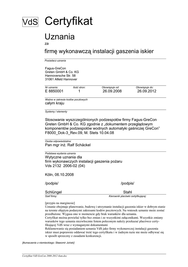 VdS Certyfikat Uznania za firmę wykonawczą instalacji gaszenia iskier Posiadacz uznania Fagus-GreCon Greten GmbH & Co. KG Hannoversche Str. 58 31061 Alfeld Hannover Nr uznania: Ilość stron: E 8850001 1 Obowiązuje od: Obowiązuje do: 26.09.2008 26.09.2012 WaŜne w zakresie kodów pocztowych całym kraju Systemy / elementy Stosowanie wyszczególnionych podzespołów firmy Fagus-GreCon Greten GmbH & Co. KG zgodnie z „dokumentem przeglądowym komponentów podzespołów wodnych automatyki gaśniczej GreCon” F8000_Dok-3_Rev.09, M. Stets 10.04.08 Osoba odpowiedzialna: Pan mgr inŜ. Ralf Schäckel Podstawa wydania uznania Wytyczne uznania dla firm wykonawczych instalacji gaszenia poŜaru Vds 2132 2006-02 (04) Köln, 06.10.2008 /podpis/ Schlüngel Szef firmy: /podpis/ Stahl Kierownik placówki certyfikującej: [przypis na marginesie] Uznanie obejmuje planowanie, budowę i utrzymanie instalacji gaszenia iskier w dobrym stanie na terenie objętym podanymi zakresami kodów pocztowych. Na wniosek uznanie moŜe zostać przedłuŜone. Wygasa ono w momencie gdy brak warunków dla uznania. Certyfikat moŜna powielać tylko bez zmian i ze wszystkimi załącznikami. Wszystkie zmiany warunków tego uznania niezwłocznie listem poleconym naleŜy przekazać placówce certyfikującej VdS wraz z wymaganymi dokumentami Reklamowanie się posiadaniem uznania VdS jako firmy wykonawczej instalacji gaszenia iskier musi poprawnie oddawać treść tego certyfikatu i w Ŝadnym razie nie moŜe odbywać się w sposób sprzeczny z zasadami konkurencji. [tłumaczenie z niemieckiego: Sławomir Joński] Certyfikat VdS GreCon 2008-2012 tlum.doc