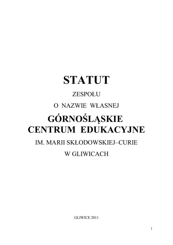 STATUT ZESPOŁU O NAZWIE WŁASNEJ GÓRNOŚLĄSKIE CENTRUM EDUKACYJNE IM. MARII SKŁODOWSKIEJ–CURIE W GLIWICACH GLIWICE 2011 1 SPIS TREŚCI Rozdział 1. Postanowienia ogólne ........................................................................................ 4 Podstawa prawna ..................................................................................................................... 4 Nazwa i lokalizacja ................................................................................................................... 5 Informacje organizacyjne .......................................................................................................... 5 Uprawnienia, cele i zadania GCE ........................................................................................... 6 Rozdział 2. Organy GCE i ich kompetencje .......................................................................... 7 Dyrektor ................................................................................................................................... 7 Rada Pedagogiczna ................................................................................................................. 14 Rada Rodziców ....................................................................................................................... 15 Samorządy .............................................................................................................................. 16 Rozdział 3. Nauczyciele i inni pracownicy GCE ................................................................. 17 Nauczyciele ............................................................................................................................ 17 Inni pracownicy GCE.............................................................................................................. 21 Rozdział 4. Organizacja nauczania, kształcenia, wychowania i opieki ................................ 21 Założenia ogólne ..................................................................................................................... 21 Warunki prowadzenia zajęć .................................................................................................... 22 Organizacja nauczania i kształcenia w szkołach młodzieżowych ............................................ 24 Organizacja nauczania i kształcenia w Centrum Kształcenia Ustawicznego............................. 25 Szkoły kształcące w formie stacjonarnej (wieczorowe) ........................................................... 25 Szkoły kształcące w formie zaocznej (zaoczne)....................................................................... 25 Organizacja kształcenia w Centrum Kształcenia Praktycznego ................................................ 26 Organizacja działalności edukacyjnej w formach pozaszkolnych............................................. 28 Organizacja działalności biblioteki.......................................................................................... 28 Organizacja działalności opiekuńczo-wychowawczej .............................................................. 29 Rozdział 5. Uczniowie i słuchacze .................................................................................... 29 2 Rekrutacja do szkół w GCE .................................................................................................... 29 Rekrutacja do szkół młodzieżowych ....................................................................................... 29 Rekrutacja do szkół dla dorosłych ........................................................................................... 30 Prawa i obowiązki ucznia oraz słuchacza ................................................................................ 30 Nagrody dla ucznia lub słuchacza ........................................................................................... 32 Kary dla ucznia i słuchacza ..................................................................................................... 32 Rozdział 6. Wewnątrzszkolny System Oceniania w szkołach młodzieżowych .................. 33 Podstawowe zasady wewnątrzszkolnego oceniania ................................................................. 33 Tryb i kryteria oceniania oraz skala ocen................................................................................. 35 Praktyki zawodowe i ich zaliczanie ......................................................................................... 39 Ocenianie zachowania............................................................................................................. 39 Egzaminy klasyfikacyjne ........................................................................................................ 41 Egzaminy poprawkowe ........................................................................................................... 43 Egzaminy dla absolwentów ..................................................................................................... 44 Kontakty z rodzicami (prawnymi opiekunami) ........................................................................ 44 Rozdział 7. Wewnątrzszkolny System Oceniania w szkołach dla dorosłych....................... 45 Podstawowe zasady wewnątrzszkolnego oceniania ................................................................. 45 Tryb i kryteria oceniania oraz skala ocen................................................................................. 46 Ocenianie osiągnięć edukacyjnych w szkołach dla dorosłych .................................................. 47 Egzaminy w szkołach dla dorosłych ........................................................................................ 48 Egzaminy semestralne............................................................................................................. 48 Praktyczna nauka zawodu .........................................................