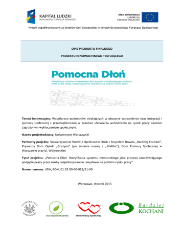 OPIS PRODUKTU FINALNEGO PROJEKTU INNOWACYJNEGO TESTUJĄCEGO Temat innowacyjny: Współpraca podmiotów działających w obszarze zatrudnienia oraz integracji i pomocy społecznej z przedsiębiorcami w zakresie ułatwiania wchodzeniu na rynek pracy osobom zagrożonym wykluczeniem społecznym. Nazwa projektodawcy: Uniwersytet Warszawski Partnerzy projektu: Stowarzyszenie Rodzin i Opiekunów Osób z Zespołem Downa „Bardziej Kochani”, Prywatny Dom Opieki „Grażyna” (po zmianie nazwy z „Malibu”), Dom Pomocy Społecznej w Warszawie przy ul. Wójtowskiej Tytuł projektu: „Pomocna Dłoń. Weryfikacja systemu mentorskiego jako procesu umożliwiającego podjęcie pracy przez osoby niepełnosprawne umysłowo na polskim rynku pracy” Numer umowy: UDA, POKL 01.02.00-00-035/11-00 Warszawa, styczeń 2015 Bardziej KOCHANI Dom Opieki GRAŻYNA Dom Pomocy Społecznej Nazwa produktu finalnego Innowacyjny model wsparcia w systemie mentorskim dla osób z zespołem Downa podejmujących zatrudnienie jako pomocnicy opiekunów w ośrodkach opiekuńczych dla osób starszych. I. Elementy składające się na produkt finalny Podręcznik opisujący produkt wraz z filmem instruktażowym - pokazujący funkcjonowanie modelu dla osób chcących wdrożyć opracowany w projekcie model wsparcia w systemie mentorskim. W podręczniku omówione są różne aspekty proponowanego modelu wsparcia, tak aby zapewnić różnym rodzajom odbiorców jak najszerszą wiedzę dotyczącą zagadnienia zatrudnienia w sektorze społecznym osób niepełnoprawnych intelektualnie. Innowacyjność proponowanego systemu wsparcia wynika bowiem z nowego sposobu myślenia o specyfice upośledzenia umysłowego, traktowanego nie jako niepełnosprawność, którą należałoby korygować, ale jako jedyny w swoimi rodzaju sposób bycia człowiekiem. Czytelnik będzie mógł zapoznać się z czterema obszarami wiedzy dotyczącej społecznego i zawodowego funkcjonowania osób z niepełnosprawnością intelektualną. • Obszar pierwszy – filozoficzne i aksjologiczne zagadnienia leżące u podstaw proponowanego systemu wsparcia. Treści przeznaczone dla decydentów działających w obszarze niepełnosprawności, kształtujących oblicze polityk społecznych w naszym kraju, dla pracowników naukowych, studentów, zainteresowanych rodziców i osób współpracujących z osobami niepełnosprawnymi. • Obszar drugi – zestaw tematów szkoleń niezbędnych do wdrożenia modelu systemu wsparcia. Treści przeznaczone dla osób zainteresowanych innowacyjnym modelem zatrudniania w systemie mentorskim osób niepełnosprawnych intelektualnie w sektorze społecznym. • Obszar trzeci – opis przebiegu zatrudnienia osób z zespołem Downa w ośrodkach pomocowych. W poglądowy sposób przestawiony został schemat pracy osób z zespołem Downa w ośrodkach pomocowych dla osób starszych, z wykorzystaniem cytatów z wypowiedzi wszystkich uczestników: osób z zespołem Downa, mentorów, trenerów pracy, rodziców. Tekst zilustrowany fotografiami uczestników z zespołem Downa podczas wykonywania pracy. Treści przeznaczone dla wszystkich osób zainteresowanych innowacjami w zakresie zatrudniania osób niepełnosprawnych intelektualnie, zwłaszcza dla tych, którzy chcą wdrożyć proponowany model wsparcia. • Obszar czwarty - rekomendacje prawne dotyczące: 1) umożliwienia zatrudnienia w niewielkim wymiarze godzin uczestnikom WTZ bez utraty statusu uczestnika, 2 2) rozszerzenia zapisów ustawy o kwestie zwrotu kosztów zatrudnienia pracownika pomagającego osobie niepełnosprawnej, która przyjmuje rolę mentora. Załącznikiem do podręcznika jest film instruktażowy - pokazujący funkcjonowanie modelu, przeznaczony dla wszystkich zainteresowanych proponowanym modelem wsparcia, w tym dla uczestników z zespołem Downa oraz innych osób niepełnosprawnych intelektualnie. II. Problem, na który odpowiada innowacja Innowacja jest odpowiedzią na deficyt działań związanych z zatrudnieniem osób z niepełnosprawnością intelektualną w stopniu umiarkowanym lub znacznym (zwłaszcza osób z zespołem Downa). Systemy wsparcia kierowane ku osobom niepełnosprawnym (w ogólnym rozumieniu pojęcia) najczęściej pomijają ich specyfikę polegającą na tym, że wymagają one nieustannego wspomagania i nadzoru. Mimo to możliwe jest zatrudnienie tych osób na otwartym rynku pracy, jednak w specyficznym systemie, zaprojektowanym specjalnie dla nich. W proponowanej przez nas innowacji zatrudnienie zorganizowane jest w systemie mentorskim. W przeciwieństwie do innych projektów, w których termin „mentor” oznacza koordynatora pracy trenerów pracy, w naszym projekcie „mentor” oznacza pracownika ośrodka opiekuńczego, w którym osoby z zespołem Downa podejmują zatrudnienie. W realizowanym obecnie projekcie PO KL „Trener pracy jako sposób na zwiększenie zatrudnienia osób niepełnosprawnych” wypracowano zestaw narzędzi do rekrutacji, szkoleń i monitoringu pracy trenerów pracy, z których warto skorzystać. Jednak specyfika uczestników naszego projektu powoduje, że system wsparcia opierający się tylko na udziale trenera pracy jest niewystarczający, dlatego też w proponowanej przez nas innowacji wyeksponowana jest rola mentora. Ponadto najczęściej proponowane osobom z niepełnosprawnością intelektualną w stopniu umiarkowanym i znacznym są stanowiska pracy w charakterze robotnika niewykwalifikowanego. W naszym projekcie proponujemy pracę w sektorze społecznym polegającą na wspólnym przebywaniu z innymi ludźmi. Osoby z zespołem Downa nie są traktowane jako podopieczni instytucji opiekuńczych, ale jako pracownicy udzielający wsparcia osobom zależnym (starszym). Można w ten sposób wykorzystać ich naturalne kompetencje: empatię, cierpliwość, uczuciowość które w przypadku prac robotniczych nie są wykorzystywane. 3 III. Użytkownicy, którzy mogą zastosować innowację Pracodawcy z otwartego rynku pracy w następuj
