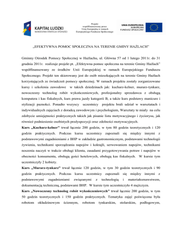 Projekt współfinansowany przez Unię Europejską w ramach Europejskiego Funduszu Społecznego „EFEKTYWNA POMOC SPOŁECZNA NA TERENIE GMINY HAŻLACH” Gminny Ośrodek Pomocy Społecznej w Hażlachu, ul. Główna 57 od 1 lutego 2011r. do 31 grudnia 2011r. realizuje projekt pt. „Efektywna pomoc społeczna na terenie Gminy Hażlach” współfinansowany ze środków Unii Europejskiej w ramach Europejskiego Funduszu Społecznego. Projekt ten skierowany jest do osób mieszkających na terenie Gminy Hażlach korzystających ze świadczeń pomocy społecznej. W ramach projektu zostały zorganizowane kursy i szkolenia zawodowe w takich dziedzinach jak: kucharz-kelner, murarz-tynkarz, nowoczesny technolog robót wykończeniowych, profesjonalny sprzedawca z obsługą komputera i kas fiskalnych, kurs prawa jazdy kategorii B, a także kurs podstawy manicure i stylizacji paznokci. Ponadto wszyscy uczestnicy projektu brali udział w warsztatach i indywidualnych zajęciach z doradcą zawodowym i psychologiem, Warsztaty te miały na celu zdobycie umiejętności praktycznych takich jak pisanie listu motywacyjnego i życiorysu, jak również podniesienie osobistych predyspozycji oraz zdolności motywacyjnych. Kurs „Kucharz-kelner” trwał łącznie 200 godzin, w tym 80 godzin teoretycznych i 120 godzin praktycznych. Podczas kursu uczestnicy zapoznali się między innymi z podstawowymi zagadnieniami z BHP w zakładzie gastronomicznym, podstawami technologii żywienia, technikami sporządzania napojów i koktajli, serwowaniem napojów, technikami noszenia naczyń w trakcie obsługi klienta, zasadami przygotowywania potraw i napojów w obecności konsumenta, obsługą gości hotelowych, obsługą kas fiskalnych. W kursie tym uczestniczyły 2 kobiety. Kurs „Murarz-tynkarz” trwał łącznie 120 godzin, w tym 30 godzin teoretycznych i 90 godzin praktycznych. Podczas kursu uczestnicy zapoznali się między innymi z podstawowymi zagadnieniami związanymi z technologią i materiałoznawstwem, dokumentacją techniczną, podstawami BHP. W kursie tym uczestniczyło 4 mężczyzn. Kurs „Nowoczesny technolog robót wykończeniowych” trwał łącznie 200 godzin, w tym 50 godzin teoretycznych i 150 godzin praktycznych. Tematyka zajęć poświęcona była robotom okładzinowym ściennym, robotom tynkarskim, stolarskim, podłogowym, malowaniem i tapetowaniem, jak również podstawowym zasadom BHP. W kursie wzięło udział 4 mężczyzn. Kurs „Profesjonalny sprzedawca z obsługą komputera i kas fiskalnych” trwał łącznie 140 godzin i podzielony był na trzy moduły. Podczas modułu I uczestnicy kursu zapoznali się między innymi z budową i zasadami działania komputera, obsługą drukarek, programami antywirusowymi oraz programami biurowymi. Ponadto uczestnicy zapoznali się z pocztą elektroniczną oraz ściąganiem, zapisywaniem i odtwarzaniem danych z internetu. Moduł II poświęcony był obsłudze kas fiskalnych, a moduł III obejmował zdobywanie wiedzy na temat zawodu sprzedawca, handlowiec. W kursie tym uczestniczyły 4 kobiety. Kurs „Prawa jazdy kategorii B” był podzielony na zajęcia praktyczne i teoretyczne. Zajęcia praktyczne trwały 30 godzin, a ich program był dostosowany indywidualnie do potrzeb kursantów. Uczestniczyły w nim 3 kobiety. Natomiast kurs „Podstawy manicure i stylizacja paznokci” trwał 20 godzin teoretycznych i 60 godzin praktycznych. Kurs ten obejmował następujące zagadnienia: elementy anatomii ręki, masaż dłoni, budowę paznokci, zmiany chorobowe paznokci, manicure. Uczestniczki kursu miały również możliwość zaznajomienia się z materiałami i urządzeniami stosowanymi do manicure, z metodami przedłużania płytki paznokciowej oraz z metodami zdobnictwa. Uczestniczyły w nim 2 kobiety. Łącznie w projekcie w 2011r. uczestniczyło 10 osób z terenu Gminy Hażlach. Działania realizowane w jego ramach miały na celu zwiększenie aktywności zawodowej i społecznej podopiecznych Ośrodka, wyrównywanie szans płci, zwłaszcza kobiet na lokalnym rynku pracy, a także zmniejszenie zagrożenia wykluczeniem społecznym. Gminny Ośrodek Pomocy Społecznej w Hażlachu składa podziękowania wszystkim osobom i instytucjom, które z naszym Ośrodkiem współpracowały na różnych etapach projektu i służyły nam swoją pomocą. Podziękowania składamy również uczestnikom za ich wytrwałość, cierpliwość i wysiłek. Natomiast wszystkich zainteresowanych informujemy o możliwości uczestnictwa w realizowanym projekcie w roku 2012r. Bliższe informacje uzyskać można w siedzibie naszego Ośrodka lub pod numerem telefonu: 33/ 856 96 00.