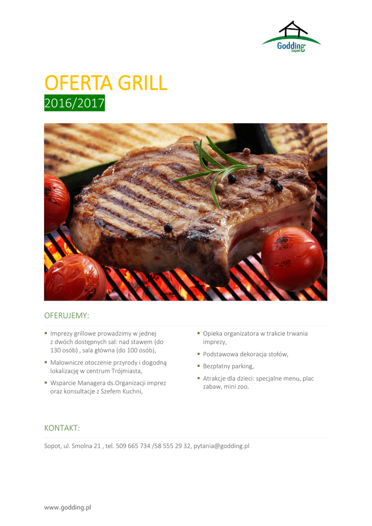 OFERTA GRILL 2016/2017 OFERUJEMY: Imprezy grillowe prowadzimy w jednej z dwóch dostępnych sal: nad stawem (do 130 osób) , sala główna (do 100 osób), Malownicze otoczenie przyrody i dogodną lokalizację w centrum Trójmiasta, Wsparcie Managera ds.Organizacji imprez oraz konsultacje z Szefem Kuchni, Opieka organizatora w trakcie trwania imprezy, Podstawowa dekoracja stołów, Bezpłatny parking, Atrakcje dla dzieci: specjalne menu, plac zabaw, mini zoo. KONTAKT: Sopot, ul. Smolna 21 , tel. 509 665 734 /58 555 29 32, [email protected] www.godding.pl OFERUJEMY: BUFET I BUFET II BUFET ZIMNY BUFET ZIMNY Sałatka grecka z warzywami Sałatka ziemniaczana z bekonem, cebulą i musztardą francuską Sałatka z grillowanych warzyw z rozmarynem i balsamicznym sosem Capresse z mozzarelli z filetami pomarańczy Sałatka z pomidorów i świeżego ogórka z jogurtowo-miętowym dressingiem Sałatka Cesar z kurczakiem i plastrami bekonu Szparagi zawijane w szynkę szwardzwaldzką Pajda chleba ze smalcem Tatar z makreli z konserwowym ogórkiem i czerwoną cebulą Pajda chleba ze smalcem Krewetki na salsie z avokado i melona Pieczona gruszka zawijana w szynkę dojrzewającą Ogórek małosolny Bruschetta z siekanym pomidorem, czosnkiemi bazylią Pieczywo / Masło Ogórek małosolny Sosy: majonezowy, czosnkowy, meksykański Pieczywo / masło Sosy: majonezowy, czosnkowy, meksykański BUFET DESEROWY Kawa/ Herbata BUFET DESEROWY Owoce sezonowe Kawa/ Herbata Owoce sezonowe Woda mineralna niegazowana Woda mineralna niegazowana CENA: 70,00 zł /osoby CENA: 80,00 zł /osoby www.godding.pl OFERUJEMY: OFERTA GRILL II OFERTA GRILL I Zupa Kociołek myśliwego Stek z karkówki marynowany w sosie BBQ Grillowane pałki drobiowe marynowane w zielonym curry Filet drobiowy marynowany w ziołach i cytrusach Schab marynowany w musztardzie i tymianku Kofta z baraniny na patyku Kiełbasa z grilla Kaszanka grillowana z cebulą i świeżym majerankiem Pieczone ziemniaki Łosoś w ziołach pieczony w folii Ziemniaki pieczone CENA: 50,00 zł /osoby CENA: 60,00 zł /osoby OFERTA GRILL III OFERTA GRILL IV Zupa Kociołek myśliwego Zupa Kociołek myśliwego Filety z dorsza zapiekane w folii z cytrusami Żeberka marynowane w BBQ Filet drobiowy marynowany w curry Schab marynowany w musztardzie Kiełbasa z grilla Kiszka ziemniaczana Pieczone ziemniaki CENA: 70,00 zł /osoby www.godding.pl Filet z indyka marynowany w cytrynie i oregano Filet drobiowy w tandori na bazie greckiego jogurtu Kiszka ziemniaczana Kiełbasa z grilla Pieczone ziemniaki CENA: 70,00 zł /osoby DODATKOWO POLECAMY STÓŁ WIEJSKI Stół mały 10kg wyrobów (max 30 osób) 1000 zł Stół średni 20kg wyrobów (max 60 osób) 1500 zł Stół duży 30kg wyrobów (max 120 osób) 2200 zł STÓŁ MORSKI Stół mały 15kg wyrobów (max 50 osób) 2000 zł Stół duży 25kg wyrobów ( max 100 osób) 2500 zł DZICZYZNA/ Dania podawane w całości Szynka z dzika pieczona (max 40 osób) 1000 zł Indyk faszerowany w całości (max 40 osób) 800 zł Prosiak pieczony w całości (40 osób) 1400 zł Dzik pieczony mały (max 60 osób)1900 zł Dzik pieczony duży (max 100 osób) 2400 zł DESKA SERÓW z owocami (2kg) 300 zł GRILL 35 zł / osobę (szaszłyk drobiowy, karkówka marynowana, kiełbaska, pieczywo) KOKTAJL BAR (ok. 5 drinków/osobę) 45 zł /osoby Cena zawiera obsługę barmańską, określony asortyment alkoholowy, dekoracje, OGNISKO (tylko za salą nad stawem) 1m3 drewna 300 zł Kiełbaska, pieczywo, sosy 8zł /porcja FONTANNA CZEKOLADOWA Dla 100 osób z dodatkami 800 zł Dla 40 osób z dodatkami 400 zł www.godding.pl WAŻNE INFORMACJE Nasze biuro otware jest od poniedziałku do piątku w godzinach od 10:00 do 18:00, Do każdego menu, należy doliczyć (do osoby pełnoletniej) korkowe w kwocie 15 zł/osoby za możliwość wniesienia własnych alkoholi lub wybór z karty Godding. Jeżeli Państwo decydują się na wniesienie własnych alkoholi oraz własnych napoi gazowanych opłata korkowa wzrasta do 20 zł/osoby. Oferta grillowa występuje wyłącznie w połączeniu zimnego bufetu z grill’em. Nie ma możliwości wyboru wyłacznie jednej części zestawu. wycena menu zawiera: obsługę kelnerską, pełne nakrycie stołów wraz z dekoracją kwiatową z żywych kwiatów w naturalnych odcieniach (według norm lokalu). rezerwacja nie powinna przekroczyć 8h i zakończenie imprezy nie przekracza godziny 2:00. Po przekroczeniu godziny zakończenia imprezy, wskazanej w umowie, dodatkowa opłata, możliwość wniesienia własnych wyrobów cukierniczych w dniu imprezy, menu i harmonogram imprezy, ustalany jest najpóźniej na dwa tygodnie przed datą imprezy. Wszelkie wniesione zmiany po wyznaczonym terminie nie muszą być przez nas akceptowane, Dzieci do lat 10 posiadają upust w kwocie 50% od stałej ceny menu. Dla dzieci można przygotować odrębne menu, obsługa imprezy np. Dj, fotograf posiadają upust 50% od stałej ceny menu (wszystkie dania ciepłe + deser), jeżeli Państwo zapraszają do pełnego wyżywienia, osoby te, są traktowane jak pozostali goście, Dekoracje sali wykonywane są w dniu imprezy. Sala jest udostępniana od godziny 8:00. Stoły nakrywamy na 4h przed rozpoczęciem wesela. www.godding.pl