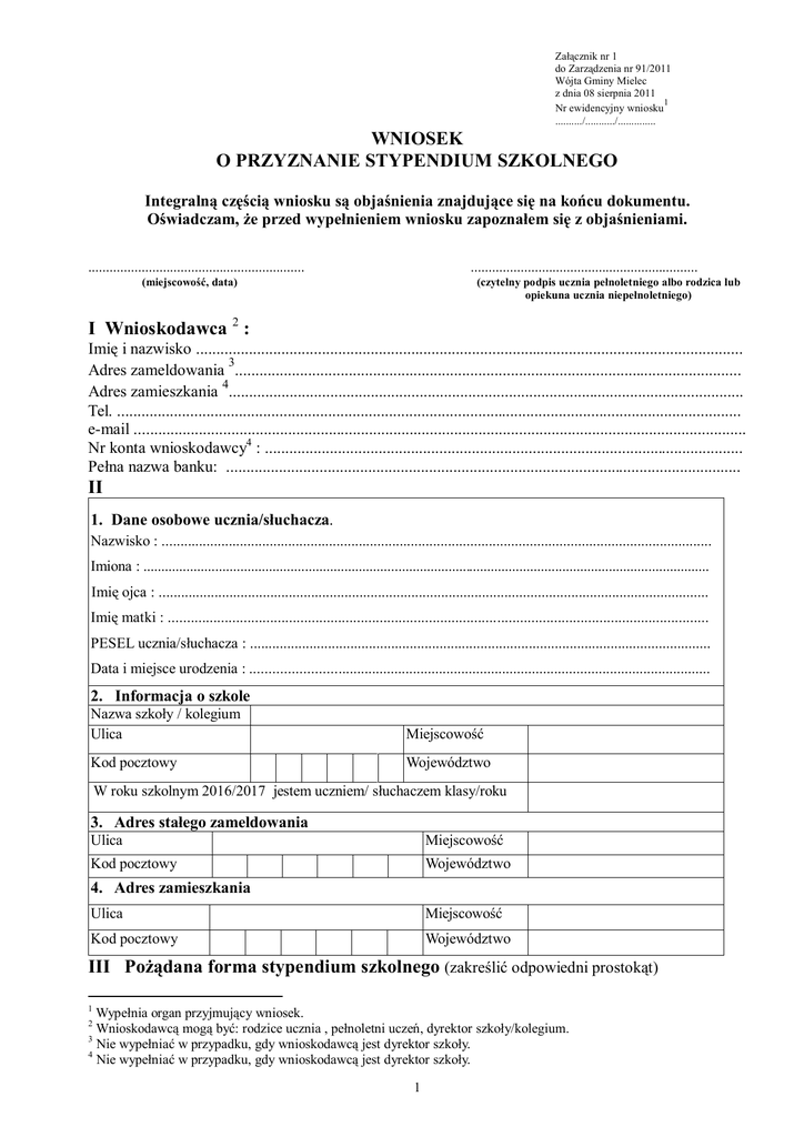 Załącznik nr 1 do Zarządzenia nr 91/2011 Wójta Gminy Mielec z dnia 08 sierpnia 2011 1 Nr ewidencyjny wniosku ........../.........../.............. WNIOSEK O PRZYZNANIE STYPENDIUM SZKOLNEGO Integralną częścią wniosku są objaśnienia znajdujące się na końcu dokumentu. Oświadczam, że przed wypełnieniem wniosku zapoznałem się z objaśnieniami. ............................................................. ................................................................ (miejscowość, data) (czytelny podpis ucznia pełnoletniego albo rodzica lub opiekuna ucznia niepełnoletniego) I Wnioskodawca 2 : Imię i nazwisko ....................................................................................................................................... 3 Adres zameldowania ............................................................................................................................. 4 Adres zamieszkania ............................................................................................................................... Tel. .......................................................................................................................................................... e-mail ....................................................................................................................................................... Nr konta wnioskodawcy4 : ...................................................................................................................... Pełna nazwa banku: ............................................................................................................................... II 1. Dane osobowe ucznia/słuchacza. Nazwisko : .................................................................................................................................................... Imiona : .............................................................................................................................................................. Imię ojca : .................................................................................................................................................... Imię matki : ............................................................................................................................................... PESEL ucznia/słuchacza : ............................................................................................................................ Data i miejsce urodzenia : ........................................................................................................................... 2. Informacja o szkole Nazwa szkoły / kolegium Ulica Miejscowość Kod pocztowy Województwo W roku szkolnym 2016/2017 jestem uczniem/ słuchaczem klasy/roku 3. Adres stałego zameldowania Ulica Miejscowość Kod pocztowy Województwo 4. Adres zamieszkania Ulica Miejscowość Kod pocztowy Województwo III Pożądana forma stypendium szkolnego (zakreślić odpowiedni prostokąt) 1 Wypełnia organ przyjmujący wniosek. Wnioskodawcą mogą być: rodzice ucznia , pełnoletni uczeń, dyrektor szkoły/kolegium. 3 Nie wypełniać w przypadku, gdy wnioskodawcą jest dyrektor szkoły. 4 Nie wypełniać w przypadku, gdy wnioskodawcą jest dyrektor szkoły. 2 1 □ Całkowite lub częściowe pokrycie kosztów udziału w zajęciach edukacyjnych lub wyrównawczych, w tym w szczególności kosztów udziału w zajęciach językowych, komputerowych, artystycznych, a także całkowitego lub częściowego pokrycia kosztów pobytu na tzw. ”zielonej szkole” bądź innych wyjazdach – w tym wycieczkach o charakterze edukacyjnym. □ Pomoc rzeczowa lub finansowa o charakterze edukacyjnym w tym w szczególności zakup podręczników i innych pomocy naukowych. □ Całkowite lub częściowe pokrycie kosztów związanych z pobieraniem nauki poza miejscem zamieszkania (dla uczniów szkół ponadgimnazjalnych i słuchaczy kolegiów w przypadkach, o których mowa w art. 90d ust. 4 ustawy o systemie oświaty). UWAGA!!! Czy uczeń otrzymuje inne stypendium o charakterze socjalnym ze środków publicznych? □ tak □ nie Wysokość otrzymywanego stypendium w zł ................................................... Okres, na który przyznano stypendium ............................................................ IV Sytuacja społeczna w rodzinie: W RODZINIE WYSTĘPUJE (właściwe zaznaczyć) 1 Bezrobocie 2 Niepełnosprawność 3 Ciężka lub długotrwała choroba 4 6 Wielodzietność Brak umiejętności wykonywania funkcji opiekuńczowychowawczej Alkoholizm 7 Narkomania 8 Inne (jakie?) 5 □ □ □ □ □ □ □ □ ………………………… V Wypełniają tylko te osoby, które korzystają ze świadczeń z pomocy społecznej. Oświadczam, że w miesiącu poprzedzającym miesiąc złożenia niniejszego wniosku o stypendium korzystałem/am wraz z członkami mojej rodziny ze świadczeń pomocy społecznej w formie (właściwe zaznaczyć): □ zasiłek stały □ zasiłek okresowy □ zasiłek celowy na wydatki mieszkaniowe □ zasiłek celowy na leki □ zasiłek celowy na opał □ inne (jakie?) i moja sytuacja nie uległa zmianie. ………………………………. (podpis wnioskodawcy) 2 VI Oświadczenie o członkach rodziny oraz źródłach i wysokości dochodu 5: Lp. Imię i Nazwisko Stopień pokrewieństwa Miejsce pracy/nauki Źródło dochodu Wysokość dochodu w zł 6 1. 2. 3. 4. 5. 6. 7. 8. 9. 10. Razem wysokość dochodu w gospodarstwie domowym: OŚWIADCZENIE Oświadczam, że średni miesięczny dochód netto na jednego członka gospodarstwa domowego z miesiąca poprzedzającego złożenie wniosku wynosi ……………….....................................................… złotych, słownie:................................................................................................................................................. “Jestem świadomy odpowiedzialności ka