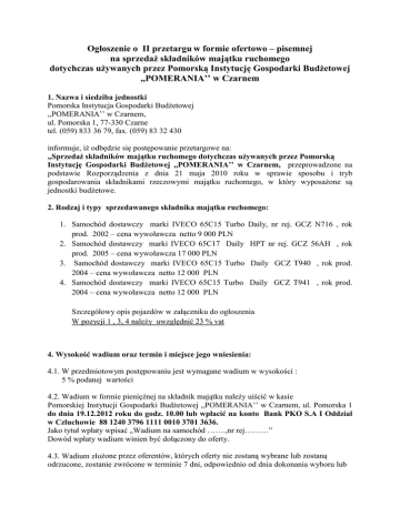Ogłoszenie o II przetargu w formie ofertowo – pisemnej na sprzedaż składników majątku ruchomego dotychczas używanych przez Pomorską Instytucję Gospodarki Budżetowej ,,POMERANIA’’ w Czarnem 1. Nazwa i siedziba jednostki Pomorska Instytucja Gospodarki Budżetowej ,,POMERANIA’’ w Czarnem, ul. Pomorska 1, 77-330 Czarne tel. (059) 833 36 79, fax. (059) 83 32 430 informuje, iż odbędzie się postępowanie przetargowe na: „Sprzedaż składników majątku ruchomego dotychczas używanych przez Pomorską Instytucję Gospodarki Budżetowej ,,POMERANIA’’ w Czarnem, przeprowadzone na podstawie Rozporządzenia z dnia 21 maja 2010 roku w sprawie sposobu i tryb gospodarowania składnikami rzeczowymi majątku ruchomego, w który wyposażone są jednostki budżetowe. 2. Rodzaj i typy sprzedawanego składnika majątku ruchomego: 1. Samochód dostawczy marki IVECO 65C15 Turbo prod. 2002 – cena wywoławcza netto 9 000 PLN 2. Samochód dostawczy marki IVECO 65C17 Daily prod. 2005 – cena wywoławcza 17 000 PLN 3. Samochód dostawczy marki IVECO 65C15 Turbo 2004 – cena wywoławcza netto 12 000 PLN 4. Samochód dostawczy marki IVECO 65C15 Turbo 2004 – cena wywoławcza netto 12 000 PLN Daily, nr rej. GCZ N716 , rok HPT nr rej. GCZ 56AH , rok Daily GCZ T940 , rok prod. Daily GCZ T941 , rok prod. Szczegółowy opis pojazdów w załączniku do ogłoszenia W pozycji 1 , 3, 4 należy uwzględnić 23 % vat 4. Wysokość wadium oraz termin i miejsce jego wniesienia: 4.1. W przedmiotowym postępowaniu jest wymagane wadium w wysokości : 5 % podanej wartości 4.2. Wadium w formie pieniężnej na składnik majątku należy uiścić w kasie Pomorskiej Instytucji Gospodarki Budżetowej ,,POMERANIA’’ w Czarnem, ul. Pomorska 1 do dnia 19.12.2012 roku do godz. 10.00 lub wpłacić na konto Bank PKO S.A I Oddział w Człuchowie 88 1240 3796 1111 0010 3701 3636. Jako tytuł wpłaty wpisać „Wadium na samochód …….,nr rej………” Dowód wpłaty wadium winien być dołączony do oferty. 4.3. Wadium złożone przez oferentów, których oferty nie zostaną wybrane lub zostaną odrzucone, zostanie zwrócone w terminie 7 dni, odpowiednio od dnia dokonania wyboru lub odrzucenia oferty, 4.4. Wadium złożone przez nabywcę zostanie zaliczone na poczet ceny, 4.5. Wadium nie będzie podlegało zwrotowi, w przypadku, gdy oferent, który wygra przetarg, uchyli się od zawarcia umowy. 5. Wymagania jakimi powinna odpowiadać oferta złożona na sprzedawany składnik majątku ruchomego: (wzór oferty-załącznik) 5.1. Ofertę należy złożyć w formie pisemnej, która musi zawierać: a) imię, nazwisko i adres lub nazwę (firmę) i siedzibę oferenta, b) nazwę składnika majątku oraz oferowaną za jego nabycie cenę i warunki jej zapłaty c) oświadczenie oferenta, iż zapoznał się ze stanem technicznym przedmiotu przetargu lub że ponosi odpowiedzialność za skutki wynikające z rezygnacji z oględzin. 5.2. Oferta musi być złożona w zamkniętej nieprzezroczystej kopercie i zaadresowana według poniższego wzoru: a/ (DOKŁADNA NAZWA I ADRES SPRZEDAJĄCEGO ……………); b/ (PRZETARG NA – II Przetarg nieograniczony na sprzedaż majątku ruchomego – samochód marki…, nr rej….. c/ (NIE OTWIERAĆ PRZED – 20.12.2012 godz. 10.15) d/ (NAZWA I ADRES KUPUJĄCEGO ……………………….); Sprzedający nie bierze odpowiedzialności za skutki braku zachowania powyższego sposobu opakowania i opisu kopert tj.: np. rozerwanie koperty w czasie drogi do Sprzedającego, nieskuteczne doręczenie z powodu złego opisu. 5.3 Ofertę można złożyć na jeden wybrany pojazd lub na kilka 5.4. Kupujący ponoszą wszelkie koszty związane z przygotowaniem i złożeniem oferty. 5.5. Oferta powinna być napisana w języku polskim, powinna być sporządzona czytelnie za pomocą maszyny do pisania, komputera lub ręcznie, w sposób uniemożliwiający łatwe usunięcie zapisów oraz podpisana przez osobę upoważnioną do reprezentowania firmy na zewnątrz (właściciela) .Jeżeli ofertę podpisuje osoba uprawomocniona do reprezentowania firmy do oferty powinno być dołączone pełnomocnictwo. 5.6. Wszelkie poprawki lub zmiany w tekście oferty muszą być parafowane własnoręcznie przez osobę podpisującą ofertę. 5.7. Wszelkie strony oferty mogą być spięte, zszyte w sposób zapobiegający możliwości dekompletacji zawartości oferty. 5.8. Oferty zostaną odrzucone, jeżeli: a) zostaną złożone po wyznaczonym terminie, w niewłaściwym miejscu lub przez osobę, która nie wniosła wadium, b) nie zawierają danych i dokumentów, o których mowa w ogłoszeniu, lub są one niekompletne, nieczytelne lub budzą inną wątpliwość, zaś złożenie wyjaśnień mogłoby prowadzić do uznania jaj za nową ofertę. c) uczestnicy przetargu nie zaoferowali co najmniej ceny wywoławczej 5.9. O odrzuceniu oferty komisja przetargowa zawiadamia niezwłocznie oferenta. 5.10. Złożenie jednej ważnej oferty wystarcza do przeprowadzenia przetargu 5.11 Komisja przetargowa wybiera oferenta ,który zaoferował najwyższą cenę. 5.12. Termin, w którym oferent będzie związany ze złożoną ofertą wynosi 30 dni. 6. Miejsce oraz termin przeprowadzenia przetargu: 6.1. Oferty należy złożyć w sekretariacie Pomorskiej Instytucji Gospodarki Budżetowej ,,POMERANIA’’ w Czarnem, ul. Pomorska 1 , 77-330 Czarne do dnia 20.12.2012 roku do godz. 10.00 6.2. Otwarcie ofert nastąpi dnia 20.12.2012 roku o godz. 10.15 w Pomorskiej Instytucji Gospodarki Budżetowej ,,POMERANIA’’ w Czarnem, ul. Pomorska 1 7. Miejsce i termin, w którym można obejrzeć sprzedawane składniki majątku ruchomego: 7.1.Składniki majątku ruchomego wymienione w pkt. 2 można oglądać od poniedziałku do piątku w godz. 7:00 - 15:00 na terenie Pomorskiej Instytucji Gospodarki Budżetowej ,,POMERANIA’’ w Czarnem, ul. Pomorska 1 8. Umowę sprzedaży w trybie przetargu uważać się będzie za zawartą z chwilą otrzymania przez ofer
