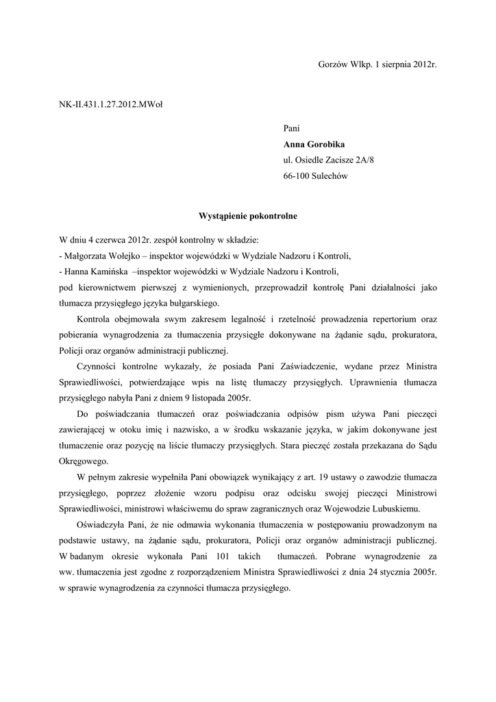 Gorzów Wlkp. 1 sierpnia 2012r. NK-II.431.1.27.2012.MWoł Pani Anna Gorobika ul. Osiedle Zacisze 2A/8 66-100 Sulechów Wystąpienie pokontrolne W dniu 4 czerwca 2012r. zespół kontrolny w składzie: - Małgorzata Wołejko – inspektor wojewódzki w Wydziale Nadzoru i Kontroli, - Hanna Kamińska –inspektor wojewódzki w Wydziale Nadzoru i Kontroli, pod kierownictwem pierwszej z wymienionych, przeprowadził kontrolę Pani działalności jako tłumacza przysięgłego języka bułgarskiego. Kontrola obejmowała swym zakresem legalność i rzetelność prowadzenia repertorium oraz pobierania wynagrodzenia za tłumaczenia przysięgłe dokonywane na żądanie sądu, prokuratora, Policji oraz organów administracji publicznej. Czynności kontrolne wykazały, że posiada Pani Zaświadczenie, wydane przez Ministra Sprawiedliwości, potwierdzające wpis na listę tłumaczy przysięgłych. Uprawnienia tłumacza przysięgłego nabyła Pani z dniem 9 listopada 2005r. Do poświadczania tłumaczeń oraz poświadczania odpisów pism używa Pani pieczęci zawierającej w otoku imię i nazwisko, a w środku wskazanie języka, w jakim dokonywane jest tłumaczenie oraz pozycję na liście tłumaczy przysięgłych. Stara pieczęć została przekazana do Sądu Okręgowego. W pełnym zakresie wypełniła Pani obowiązek wynikający z art. 19 ustawy o zawodzie tłumacza przysięgłego, poprzez złożenie wzoru podpisu oraz odcisku swojej pieczęci Ministrowi Sprawiedliwości, ministrowi właściwemu do spraw zagranicznych oraz Wojewodzie Lubuskiemu. Oświadczyła Pani, że nie odmawia wykonania tłumaczenia w postępowaniu prowadzonym na podstawie ustawy, na żądanie sądu, prokuratora, Policji oraz organów administracji publicznej. W badanym okresie wykonała Pani 101 takich tłumaczeń. Pobrane wynagrodzenie za ww. tłumaczenia jest zgodne z rozporządzeniem Ministra Sprawiedliwości z dnia 24 stycznia 2005r. w sprawie wynagrodzenia za czynności tłumacza przysięgłego. Repertorium prowadzone jest w formie papierowej, w którym odnotowuje Pani wykonane tłumaczenia pisemne oraz ustne. Kontrola repertorium wykazała, iż prowadzi je Pani w sposób ciągły, a repertorium zawiera rubryki ściśle odpowiadające wymogom odnotowywania czynności z tłumaczeń, co spełnia postanowienia art. 17 ust.2 ustawy z dnia 25 listopada 2004r. o zawodzie tłumacza przysięgłego (Dz. U. Nr 273, poz. 2702 ze zm.) Tłumaczenia nie są w pełni opisane. Brak wypełnienia rubryki „uwagi o rodzaju, treści, formie i stanie dokumentu” oraz brak wskazania rodzaju tłumaczenia ustnego, co stanowi naruszenie art. 17 ust. 2 ww. ustawy. Tłumacz obowiązany jest do dokładnego opisania dokumentu w repertorium. Istotna jest informacja czy jest to zaświadczenie, oświadczenie lub testament, czy dokument napisany jest pismem maszynowym czy odręcznym oraz czy jest uszkodzony, zniszczony lub częściowo nieczytelny. Przy tłumaczeniach ustnych należy wskazać czy było to tłumaczenie konsekutywne, symultaniczne lub a vista. Zakres tłumaczenia dotyczy określenia czy tłumacz przysięgły tłumaczył wypowiedź jednej osoby, czy też większej liczby osób, czy całość spotkania czy tylko jego część. W roku 2009 w okresie objętym kontrolą zarejestrowano 19 tłumaczeń, w 2010 – 63 tłumaczenia, w 2011 – 46 tłumaczeń, a w 2012r. do dnia 4 czerwca wykonała Pani 15 tłumaczeń. W kontrolowanym okresie wykonała Pani 144 tłumaczenia przysięgłe. W 117 przypadkach nie wypełniła Pani w repertorium rubryki „uwagi o rodzaju, treści, formie i stanie dokumentu” oraz w 17 przypadkach nie wskazała Pani rodzaju tłumaczenia przysięgłego. W związku z powyższym skontrolowaną działalność oceniam negatywnie. Po otrzymaniu projektu wystąpienia pokontrolnego nie wniosła Pani zastrzeżeń w ustawowym terminie 7 dni roboczych. Ze względu na stwierdzone nieprawidłowości, zaleca się opisywanie w pełni tłumaczeń w repertorium, zgodnie z postanowieniami art.17 ust.2 ustawy o zawodzie tłumacza przysięgłego. W związku z powyższym oczekuję w terminie 30 dni liczonym od daty otrzymania niniejszego wystąpienia pokontrolnego, informacji o sposobie wykonania zaleceń i wykorzystaniu wniosków lub przyczynach ich niewykorzystania albo o innym sposobie usunięcia stwierdzonych nieprawidłowości.
