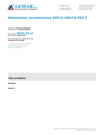 LEMAR Sp.J. ul. Bytomska 18 42-672 Wieszowa email: [email protected] tel: (32) 376 22 06 tel: (32) 376 21 85 tel: (32) 376 21 95 Wentylator promieniowy KEF/4-200/74 055 T Producent: Venture Industries Dostępność: do potwierdzenia 2025,55 zł Cena netto: Cena brutto: 2491,43 zł Cena produktu jest objęta promocją: Promocja 15% taniej * * - Promocja jest ograniczona czasowo. Aktualną cenę możesz sprawdzić w naszym sklepie internetowym. Sprawdź aktualną cenę Opis produktu: WYMIARY [zdjęcie] LEMAR Sp.J. - Niniejszy dokument nie stanowi oferty handlowej w rozumieniu k.c. Wygenerowano: 2017-03-06 22:00:04 Powered by TCPDF (www.tcpdf.org)