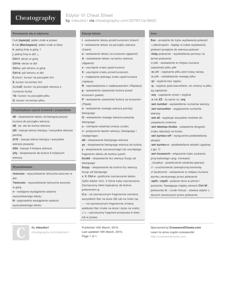 Edytor VI Cheat Sheet by mleczko1 via cheatography.com/20787/cs/3662/ Poruszanie się w edytorze Edycja tekstu Inne l lub [spacja] -jeden znak w prawo i --wstawianie tekstu przed kursorem (insert) Esc --przejście do trybu wydawania poleceń h lub [Backspace] -jeden znak w lewo I --wstawianie tekstu na początku wiersza : (dwukropek) --będąc w trybie wydawania k -jedną linię w górę ↑ (Insert) poleceń przejście do wiersza poleceń j -jedną linię w dół ↓ a --wstawianie tekstu za kursorem (append) :help polecenie --wyświetlenie pomocy na Ctrl-f -ekran w górę A --wstawianie tekstu na końcu wiersza temat polecenia Ctrl-b -ekran w dół (Append) :r plik --wstawienie w miejscu kursora Ctrl-u -pół ekranu w górę x --usunięcie znaku spod kursora zawartości pliku plik Ctrl-d -pół ekranu w dół X --usunięcie znaku przed kursorem :w plik --zapisanie pliku pod nową nazwą 0 (zero) -kursor na początek linii r --nadpisanie jednego znaku spod kursora :n plik --załadowanie nowego pliku $ -kursor na koniec linii (replace) :q! --wyjście bez zapisu R --wprowadzanie z nadpisywaniem (Replace) :q --wyjście (pod warunkiem, że zmiany w pliku p --wstawienie zawartości bufora przed są zapisane) kursorem (paste) :wq --zapisanie zmian i wyjście P --wstawienie zawartości bufora za kursorem :x lub ZZ --to samo co :wq (Paste) :set number --wyświetlenie numerów wierszy o --wstawienie nowego wiersza poniżej :set nonumber --wygaszenie numerów bieżącego wierszy O --wstawienie nowego wiersza powyżej :set all --wypisuje wszystkie możliwe do bieżącego ustawienia zmienne u --cofnięcie ostatniej zmiany (undo) dG --kasuje wiersz bieżący i wszystkie wiersze :set tabstop=liczba --ustawienie długości J --połączenie dwóch wierszy (bieżącego i poniżej znaku tabulacji na liczba następ nego) :set syntax=off --wyłączenie podświetlania dd --skasowanie bieżącego wiersza składni yy --skopiowanie bieżącego wiersza do bufora :set syntax=c --podświetlania składni zgodnej y --skopiowanie zaznaczonego lub usuniętego z jęz. C fragmentu tekstu do bufora (yank) :set incsearch --włączenie trybu szukania liczdd --skasowanie licz wierszy licząc od przyrostowego (ang. increase) bieżącego . (kropka) --powtórzenie ostatniej operacji liczyy --skopiowanie do bufora licz wierszy :! --uruchomienie zewnętrznej komendy licząc od bieżącego :r !polecenie --wstawienie w miejscu kursora v, V, Ctrl-v --graficzne zaznaczanie tekstu wyniku zwracanego przez polecenie (tylko edytor vim). 3 różne tryby zaznaczania. :split, :vsplit --podział okna w pionie i Zaznaczony tekst kopiujemy do bufora poziomie. Nawigacja między oknami Ctrl-W . poleceniem y. polecenie| vi - (znak minus) --otwiera edytor z U,u --na zaznaczonym fragmencie zamiana danymi zwróconymi przez polecenie. liczbaG -kursor na początek wiersza o numerze liczba 1G -kursor na początek pliku G -kursor na koniec pliku Przykładowe użycie komend i znaczników d0 --skasowanie tekstu od bieżącej pozycji kursora do początku wiersza d$ --jw. ale do końca wiersza d1G --kasuje wiersz bieżący i wszystkie wiersze powyżej d3d --kasuje 3 kolejne wiersze y5y --skopiowanie do bufora 5 kolejnych wierszy Wyszukiwanie /wzorzec --wyszukiwanie łańcucha wzorzec w dół ?wzorzec --wyszukiwanie łańcucha wzorzec w górę n --następne wystąpienie ostatnio wyszukiwanego tekstu N --poprzednie wystąpienie ostatnio wyszukiwanego tekstu wszystkich liter na duże (U) lub na małe (u). ~ --na zaznaczonym fragmencie zmiana wielkości liter (małe na duże i duże na małe). < > --zaznaczony fragment przesuwa w lewo lub w prawo. By mleczko1 Published 10th March, 2015. Sponsored by CrosswordCheats.com cheatography.com/mleczko1/ Last updated 10th March, 2015. Learn to solve cryptic crosswords! Page 1 of 1. http://crosswordcheats.com
