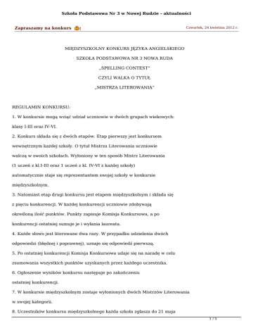 Szkoła Podstawowa Nr 3 w Nowej Rudzie - aktualności Zapraszamy na konkurs Czwartek, 24 kwietnia 2012 r. ! MIĘDZYSZKOLNY KONKURS JĘZYKA ANGIELSKIEGO SZKOŁA PODSTAWOWA NR 3 NOWA RUDA „SPELLING CONTEST” CZYLI WALKA O TYTUŁ „MISTRZA LITEROWANIA” REGULAMIN KONKURSU: 1. W konkursie mogą wziąć udział uczniowie w dwóch grupach wiekowych: klasy I-III oraz IV-VI. 2. Konkurs składa się z dwóch etapów. Etap pierwszy jest konkursem wewnętrznym każdej szkoły. O tytuł Mistrza Literowania uczniowie walczą w swoich szkołach. Wyłoniony w ten sposób Mistrz Literowania (1 uczeń z kl.I-III oraz 1 uczeń z kl. IV-VI z każdej szkoły) automatycznie staje się reprezentantem swojej szkoły w konkursie międzyszkolnym. 3. Natomiast etap drugi konkursu jest etapem międzyszkolnym i składa się z pięciu konkurencji. W każdej konkurencji uczniowie zdobywają określoną ilość punktów. Punkty zapisuje Komisja Konkursowa, a po konkurencji ostatniej sumuje je i wyłania laureata. 4. Każde słowo jest literowane dwa razy. W przypadku udzielenia dwóch odpowiedzi (błędnej i poprawnej), uznaje się odpowiedź pierwszą. 5. Po ostatniej konkurencji Komisja Konkursowa udaje się na naradę w celu zsumowania wszystkich punktów uzyskanych przez każdego uczestnika. 6. Ogłoszenie wyników konkursu następuje po zakończeniu ostatniej konkurencji. 7. W konkursie międzyszkolnym zostaje wyłonionych dwóch Mistrzów Literowania w swojej kategorii. 8. Uczestników konkursu międzyszkolnego każda szkoła zgłasza do 21 maja 1/5 2012r. podając dokładną nazwę i adres szkoły, imię i nazwisko uczestnika oraz imię i nazwisko nauczyciela opiekuna. 9. Konkurs odbędzie się 12 czerwca o godz.11:00 w Szkole Podstawowej nr 3 im. J. Wittiga w Nowej Rudzie. Zgłoszenia oraz wszelkie pytania proszę kierować pod adres : [email protected] KONKURENCJE dla uczniów klas I-III I.ZNAJOMOŚĆ POJEDYNCZYCH LITER: 1. Prowadzący dyktuje uczestnikom 7 liter. 2. Każda litera jest podawana 2 razy. 3. Litery dyktowane są w 3-sekundowych odstępach. 4. Litery sprawdza Komisja Konkursowa. 5. Za każdą poprawnie napisaną literę uczestnik otrzymuje 1 punkt. (całość- 7 punktów) II. LITERY A SŁOWA: 1. Prowadzący kolejno literuje 3 słowa: 3,4,5 literowe , np.: ONE, WALL, QUEEN. 2. Każde słowo jest literowane 2 razy. 3. Słowa sprawdza Komisja Konkursowa. 4. Przyznaje się 1 punkt za każde poprawnie napisane słowo. (całość- 3 punkty) III. PARY SŁÓW: 1.Uczestnicy otrzymują kartkę z trzema parami podobnych słów, np. : BED SHEEP DOLL BAD SHIP WALL 2.Literowane jest tylko jedno słowo z pary. 3. Uczestnik musi zakreślić na kartce przeliterowany wyraz. 4. Można uzyskać 1 punkt za poprawnie wypisane słowo. (Całosć-3 punkty) VI. WYKREŚLANKA: 1.Uczestnicy otrzymują kartkę z diagramem wypełnionym literami, np.: AGKQ LMDO 2/5 PSOT HJWQ BHZL IPEH UUBJ RYJL 2. Prowadzący czyta w kolejności litery, które powinny zostać skreślone z diagramu. W tym przypadku: A,G,K,Q,L,D,O,P,S,H,Z,L,I,P,E,H,U,U,B,J,Y,J,L. 3.Uczestnicy skreślają usłyszane litery, zostawiając te, które nie zostały wyczytane, w przypadku naszego przykładu, jest to słowo „MOTHER” 4. Uczestnicy zapisują powstałe słowo w odpowiednim miejscu na karcie pracy. Za poprawnie napisane słowo otrzymują 5 punktów. V. ETAP INDYWIDUALNY : 1. Uczestnik losuje kartkę z pięcioliterowym słowem i podaje je prowadzącemu, który zapisuje je na tablicy. 2. Uczestnik musi na głos przeliterować słowo. 3. Uczestnik ma nie więcej niż 3 sekundy na zastanowienie się nad literą. 4. Jeśli uczestnik nie potrafi przeczytać litery, powinien kontynuować aż do przeliterowania całego wyrazu. 5. Można uzyskać 1 punkt za 1 literę, czyli w sumie 5 punktów. VI. EWENTUALNA DOGRYWKA: 1.Prowadzący literuje słowo. 2. Uczestnicy mają za zadanie zapisać to słowo i NARYSOWAĆ, co ono oznacza (np. jeśli literowanym słowem jest TABLE, należy narysować odręczny, schematyczny obrazek stołu) 2. Za każde poprawnie napisane słowo można uzyskać 1 punkt, a za poprawnie narysowane znaczenie słowa- 2 punkty. W sumie można uzyskać 3 punkty za każde słowo. 3. Całkowita liczba punktów w tej kategorii zależy od liczby uczestników biorących udział w dogrywce, a także liczby słów. 3/5 KONKURENCJE dla uczniów kl. IV-VI I. ZNAJOMOŚĆ POJEDYNCZYCH LITER: 1. Prowadzący dyktuje uczestnikom 7 liter. 2. Każda litera jest podawana 2 razy. 3. Litery dyktowane są w 3-sekundowych odstępach. 4. Litery sprawdza Komisja Konkursowa. 5. Za każdą poprawnie napisaną literę uczestnik otrzymuje 1 punkt. II. LITERY A SŁOWA: 1. Prowadzący kolejno literuje 5 słów np. : ONE, WALL, QUEEN, CINEMA, CURTAIN. 2. Każde słowo jest literowane 2 razy. 3. Słowa sprawdza Komisja Konkursowa. 4. Przyznaje się 1 punkt za każde poprawnie napisane słowo. W sumie można uzyskać 5 pkt. III. PROPOZYCJE DZIECI : ( w oparciu o pięcioliterowe słowa zaproponowane i podane do Komisji Konkursowej przed konkursem) 1. Prowadzący pokazuje kolejnym uczestnikom po jednym słowie wypisanym na kartce A4. 2. Uczestnik musi przeliterować słowo. 3. Uczestnik ma nie więcej niż 3 sekundy na zastanowienie się nad literą. 4. Jeśli uczestnik nie potrafi przeczytać litery, powinien kontynuować aż do przeliterowania całego wyrazu. 5. Można uzyskać 1 punkt za 1 literę, czyli w sumie 5 punktów. IV. PARY SŁOW: 1. Prowadzący pokazuje uczestnikom tabliczki z kolejnymi parami słów np. : BED SHEEP TREE DOLL TWELVE BAD SHIP THREE WALL TWENTY 2.Literowane jest tylko jedno słowo z pary. 3. Uczestnik musi zapisać na kartce przeliterowany wyraz. 4. Można uzyskać 1 punkt za poprawnie wypisane słowo, czyli w sumie 5 punktów. 4/5 V. MIKSTURA LITER: 1. Prowadzący literuje uczestnikom kolejnych 5 słów 5-literowych, ale litery podawane są chaotycznie. 2. Uczestnik musi najpierw zapisać litery, a następnie ułożyć z nich właściwe słowo. 3. C