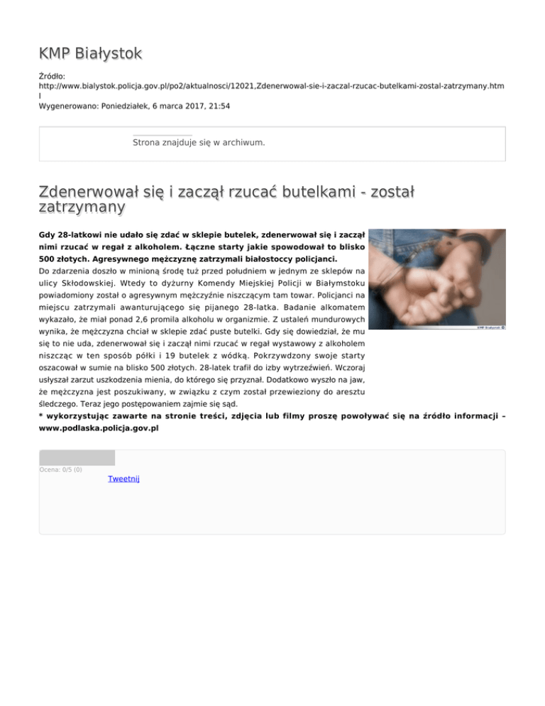 KMP Białystok Źródło: http://www.bialystok.policja.gov.pl/po2/aktualnosci/12021,Zdenerwowal-sie-i-zaczal-rzucac-butelkami-zostal-zatrzymany.htm l Wygenerowano: Poniedziałek, 6 marca 2017, 21:54 Strona znajduje się w archiwum. Zdenerwował się i zaczął rzucać butelkami - został zatrzymany Gdy 28-latkowi nie udało się zdać w sklepie butelek, zdenerwował się i zaczął nimi rzucać w regał z alkoholem. Łączne starty jakie spowodował to blisko 500 złotych. Agresywnego mężczyznę zatrzymali białostoccy policjanci. Do zdarzenia doszło w minioną środę tuż przed południem w jednym ze sklepów na ulicy Skłodowskiej. Wtedy to dyżurny Komendy Miejskiej Policji w Białymstoku powiadomiony został o agresywnym mężczyźnie niszczącym tam towar. Policjanci na miejscu zatrzymali awanturującego się pijanego 28-latka. Badanie alkomatem wykazało, że miał ponad 2,6 promila alkoholu w organizmie. Z ustaleń mundurowych wynika, że mężczyzna chciał w sklepie zdać puste butelki. Gdy się dowiedział, że mu się to nie uda, zdenerwował się i zaczął nimi rzucać w regał wystawowy z alkoholem niszcząc w ten sposób półki i 19 butelek z wódką. Pokrzywdzony swoje starty oszacował w sumie na blisko 500 złotych. 28-latek trafił do izby wytrzeźwień. Wczoraj usłyszał zarzut uszkodzenia mienia, do którego się przyznał. Dodatkowo wyszło na jaw, że mężczyzna jest poszukiwany, w związku z czym został przewieziony do aresztu śledczego. Teraz jego postępowaniem zajmie się sąd. * wykorzystując zawarte na stronie treści, zdjęcia lub filmy proszę powoływać się na źródło informacji – www.podlaska.policja.gov.pl Ocena: 0/5 (0) Tweetnij
