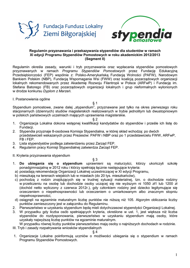 Regulamin przyznawania i przekazywania stypendiów dla studentów w ramach XI edycji Programu Stypendiów Pomostowych w roku akademickim 2012/2013 (Segment II) Regulamin określa zasady, warunki i tryb przyznawania oraz wypłacania stypendiów pomostowych przyznawanych w ramach Programu Stypendiów Pomostowych przez Fundację Edukacyjną Przedsiębiorczości (FEP) wspólnie z: Polsko-Amerykańską Fundacją Wolności (PAFW), Narodowym Bankiem Polskim (NBP), Fundacją Wspomagania Wsi (FWW) oraz koalicją pozarządowych organizacji lokalnych rekomendowanych przez Akademię Rozwoju Filantropii w Polsce (ARFwP) i Fundację im. Stefana Batorego (FB) oraz pozarządowych organizacji lokalnych i grup nieformalnych wyłonionych w drodze konkursu Dyplom z Marzeń. I. Postanowienia ogólne §1 Stypendium pomostowe, zwane dalej „stypendium”, przyznawane jest tylko na okres pierwszego roku stacjonarnych (dziennych) studiów magisterskich realizowanych w trybie jednolitym lub dwustopniowym w polskich państwowych uczelniach mających uprawnienia magisterskie. §2 1. Organizacja Lokalna dokona wstępnej kwalifikacji kandydatów do stypendiów i prześle ich listę do Fundacji. 2. Stypendia przyznaje 8-osobowa Komisja Stypendialna, w której skład wchodzą: po dwóch przedstawicieli wskazanych przez Prezesów: PAFW i NBP oraz po 1 przedstawicielu FWW, ARFwP, FB i FEP. 3. Lista stypendystów podlega zatwierdzeniu przez Zarząd FEP. 4. Regulamin pracy Komisji Stypendialnej zatwierdza Zarząd FEP. II. Kryteria przyznawania stypendium §3 Do ubiegania się o stypendium uprawnieni są maturzyści, którzy ukończyli szkołę ponadgimnazjalną w 2012 roku i którzy spełniają łącznie następujące kryteria: a) posiadają rekomendację Organizacji Lokalnej uczestniczącej w XI edycji Programu, b) mieszkają na terenach wiejskich lub w miastach (do 20 tys. mieszkańców), c) pochodzą z rodzin znajdujących się w trudnej sytuacji materialnej, tzn. o dochodzie rodziny w przeliczeniu na osobę lub dochodzie osoby uczącej się nie wyższym ni 1050 zł1 lub 1200 zł (dochód netto wyliczony z czerwca 2012r.), gdy członkiem rodziny jest dziecko legitymujące się orzeczeniem o niepełnosprawności lub orzeczeniem o umiarkowanym albo znacznym stopniu niepełnosprawności, d) osiągnęli na egzaminie maturalnym liczbę punktów nie niższą niż 105. Algorytm obliczania liczby punktów zamieszczony jest w załączniku do Regulaminu. 2. Pierwszeństwo w uzyskaniu stypendium będą mieli dotychczasowi stypendyści Organizacji Lokalnej. 3. W przypadku gdy liczba osób spełniających kryteria, określone w ust. 1, jest większa niż liczba stypendiów do rozdysponowania, pierwszeństwo w uzyskaniu stypendium mają osoby, które uzyskały najwyższą liczbę punktów na egzaminie maturalnym. W przypadku równej liczby punktów pierwszeństwo mają osoby o najniższych dochodach w rodzinie. III. Tryb i zasady rozpatrywania wniosków stypendialnych §4 1. Organizacje Lokalne poinformują uczniów o możliwości ubiegania się o stypendium w ramach Programu Stypendiów Pomostowych. 1. 1 2. Uczniowie spełniający wymagane regulaminem warunki zgłaszają bezpośrednio do Organizacji Lokalnej swoje kandydatury do ubiegania się o stypendium. Termin składania wniosków upływa 31 lipca 2012 r. w biurze Fundacji Fundusz Lokalny Ziemi Biłgorajskiej, ul. T. Kościuszki 65. 3. Po przyjęciu na studia i uzyskaniu rekomendacji Organizacji Lokalnej, Kandydat do stypendium spełniający warunki określone w § 3, wypełnia wniosek on-line na stronie www.stypendiapomostowe.pl. Termin złożenia wniosku on-line upływa 17 sierpnia 2012 r. Po zakończeniu wypełniania wniosku drukuje z systemu wniosek i listę załączników, podpisuje wniosek i wraz z kompletem załączników składa w siedzibie organizacji lokalnej, od której otrzymał rekomendację, w nieprzekraczalnym terminie do 24 sierpnia 2012 r. 4. Organizacje Lokalne w terminie do 31 sierpnia 2012 r. sprawdzą prawidłowość złożonych dokumentów i prześlą je do FEP. 5. Komisja Stypendialna w FEP rozpatruje wnioski stypendialne odrębnie dla każdej Organizacji Lokalnej. 6. FEP w terminie do 1 października 2012 r. ogłosi listę stypendystów. 7. Warunkiem otrzymania stypendium jest: a) w I semestrze – spełnienie kryteriów określonych w §3 oraz przedłożenie FEP do 22 października 2012 roku zaświadczenia z uczelni o podjęciu studiów, o których mowa w §1, b) w II semestrze – przedłożenie FEP do 11 marca 2013 roku zaświadczenia z uczelni o zaliczeniu I semestru. IV. Wypłata stypendium 1. 2. 3. §5 Fundacja i Organizacja Lokalna zawiadomią pisemnie stypendystów o przyznaniu i sposobie wypłaty stypendium. Roczne stypendium wynosi 5000 zł. Stypendium wypłacane jest w 10 miesięcznych ratach, od października do lipca, w wysokości 500 zł każda, na indywidualne konta stypendystów. V. Postanowienia końcowe 1. a) b) c) 2. 3. §6 Stypendysta zobowiązany jest zawiadomić FEP, w terminie 7 dni o: otrzymaniu urlopu dziekańskiego, przerwaniu studiów, zmianie uczelni i/lub kierunku studiów w trakcie roku akademickiego. Zdarzenia wymienione w ust. 1 pkt a i b wykluczają stypendystę z dalszego udziału w Programie. Zdarzenie wymienione w ust. 1 pkt. c także wyklucza stypendystę z udziału w Programie, jeśli zmianie uczelni i/lub kierunku studiów towarzyszy zmiana charakteru studiów na wieczorowe, zaoczne lub licencjackie (w uczelni nie mającej uprawnień magisterskich). W przypadku wypłacenia rat stypendium po terminie wystąpienia zdarzeń wymienionych w ust. 1, stypendysta zobowiązany jest do zwrotu otrzymanych rat stypendium na konto wskazane przez Fundację. Załącznik nr 1 do Regulaminu Algorytm liczenia liczby punktów uzyskanych na świadectwie maturalnym 1. Brane są pod uwagę wszystkie egzaminy pisemne. 2. Podstawą liczenia punktów są wartości w % przypisane do poszczególnych zdawanych przedmiotów w ten sposób, że l